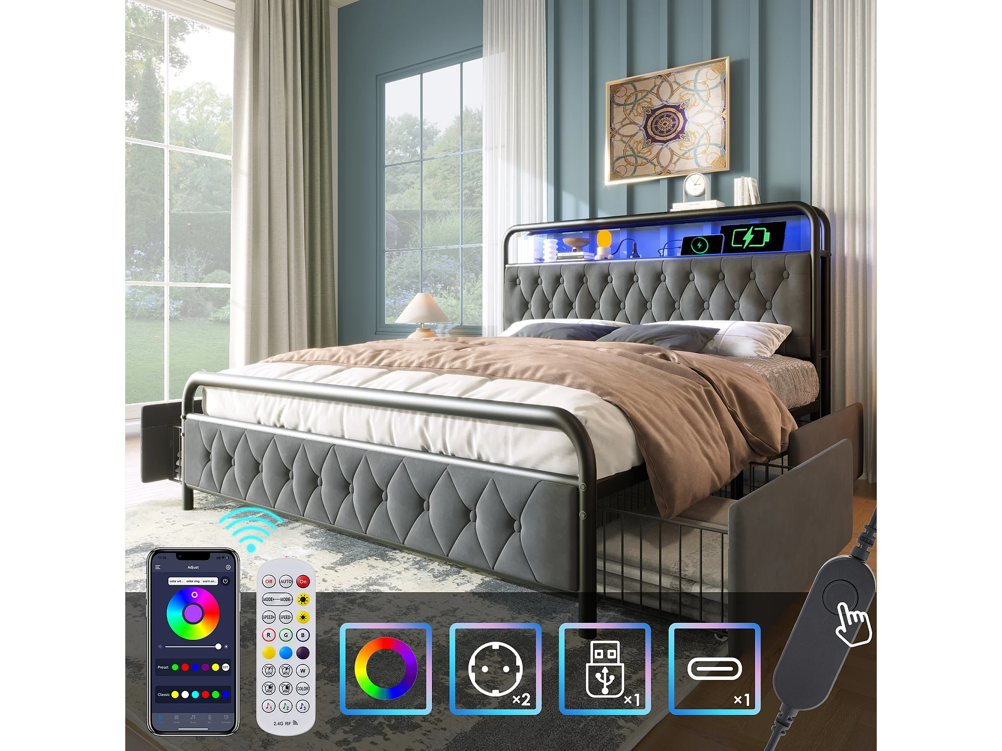 Lit capitonné 180 x 200 cm avec 2 tiroirs et tête de lit rangement - Prises USB Type C et LEDs - Velours - Gris (sans matelas)