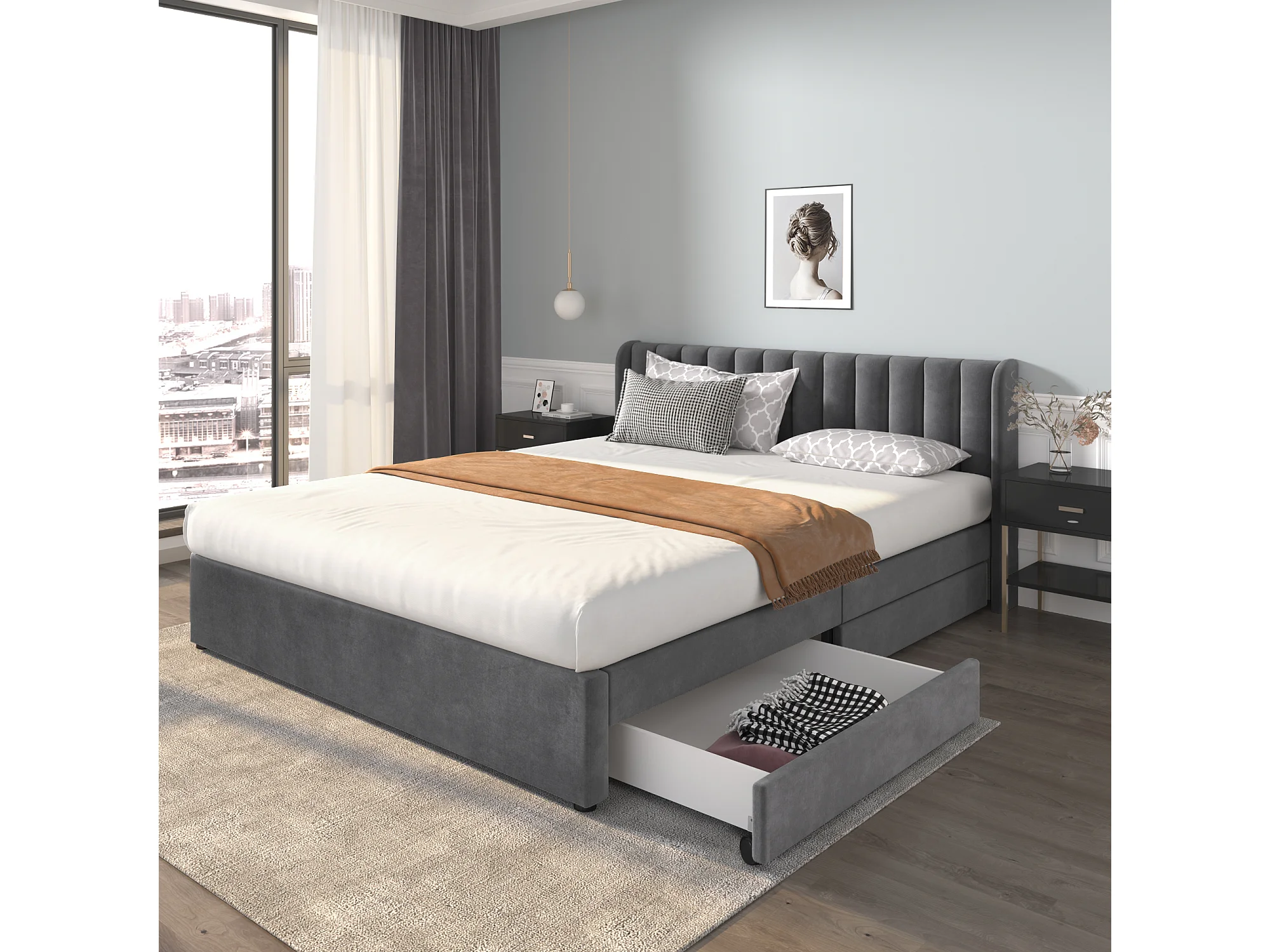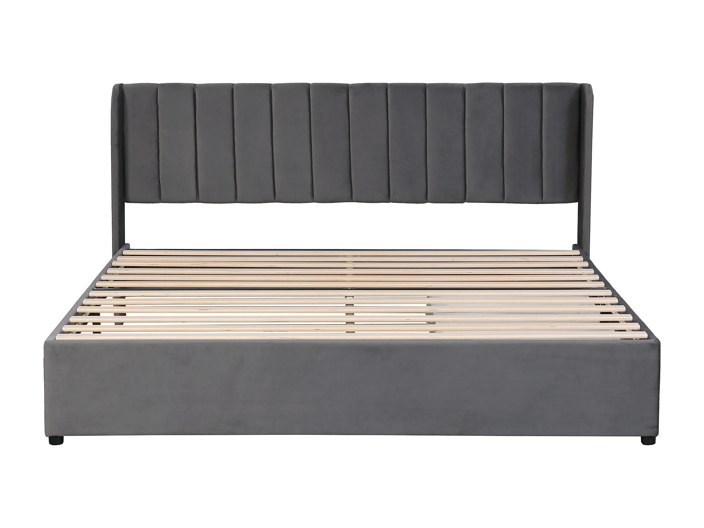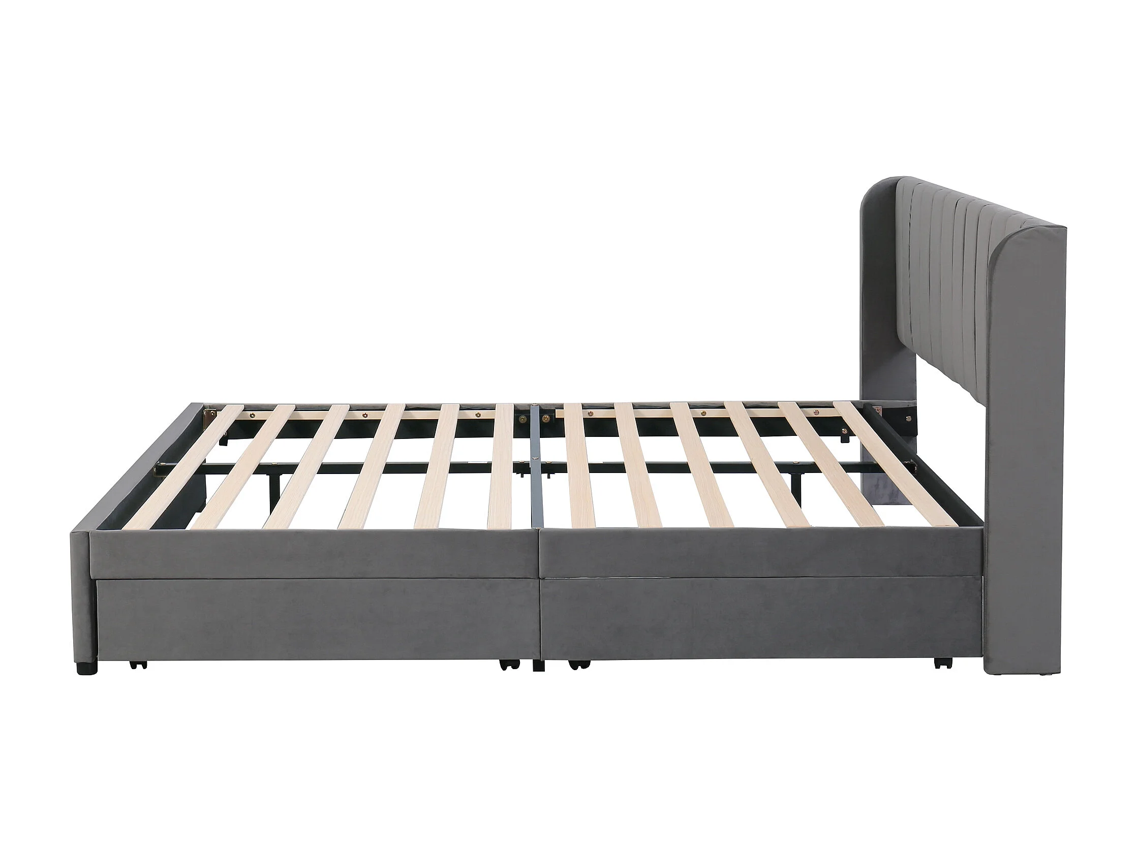 Lit capitonné 180 x 200 cm avec tête de lit, 2 tiroirs et sommier à lattes, velours gris (207.5x186x92 cm)