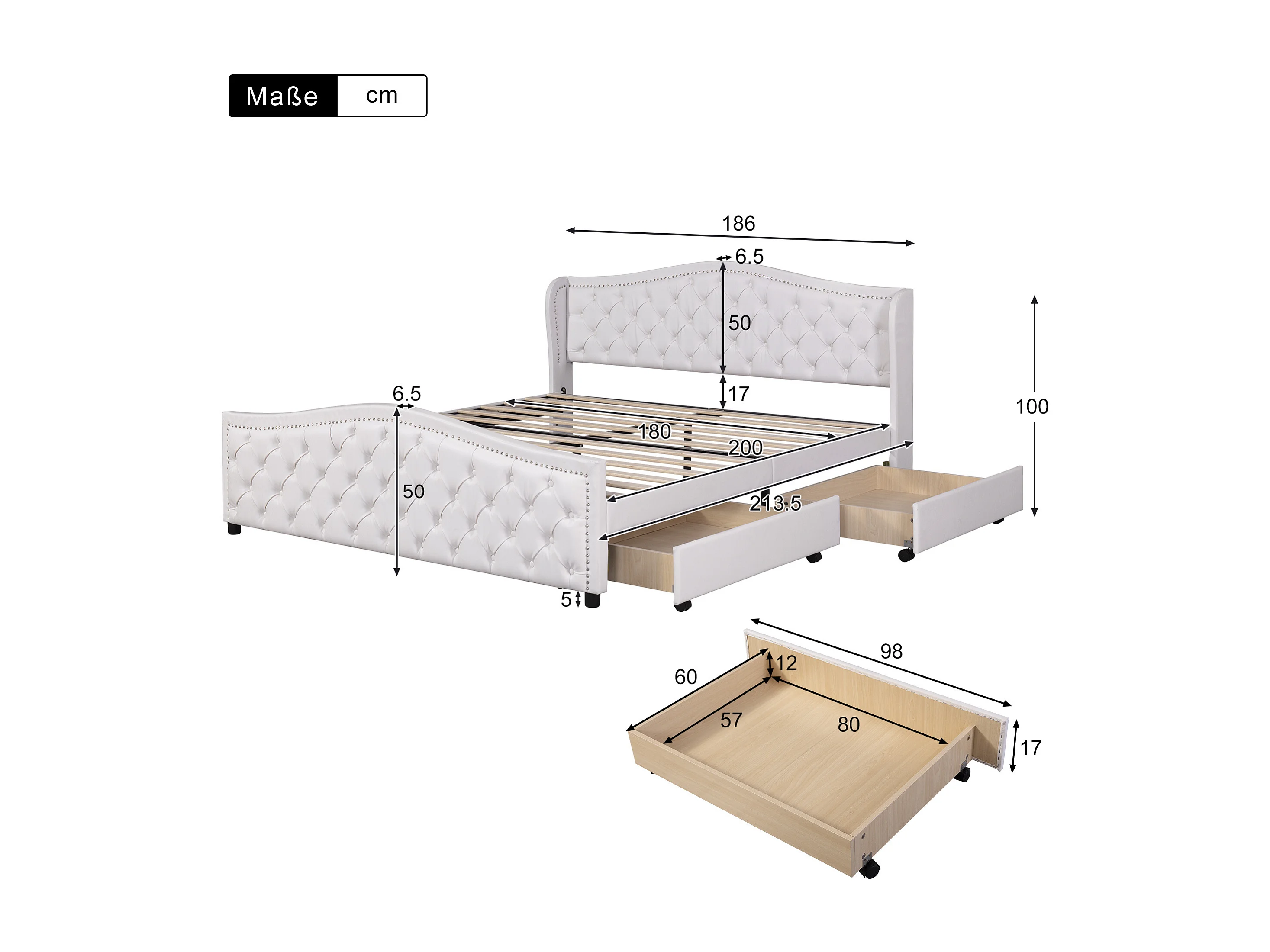 Lit adulte 180x200 cm - Lit double avec 2 tiroirs de rangement - sommier à lattes en bois - PU blanc