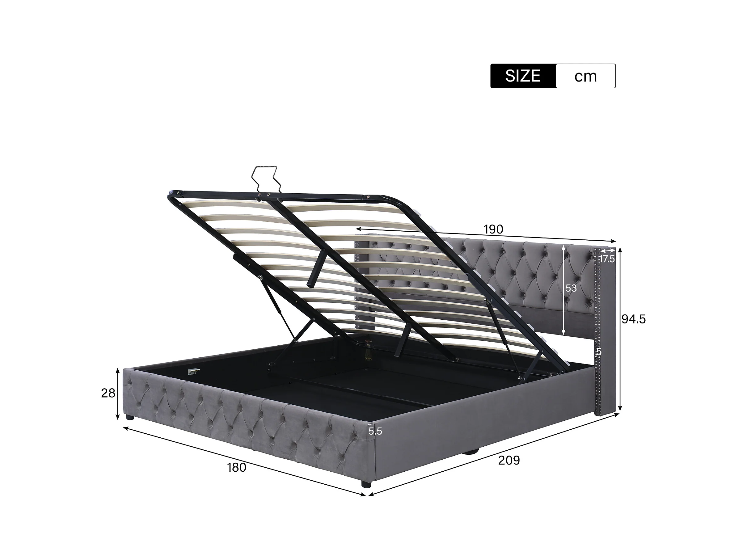 Lit capitonné 180x200 cm - Lit double avec sommier à lattes et rangements - Lit jeune - Gris - Velours
