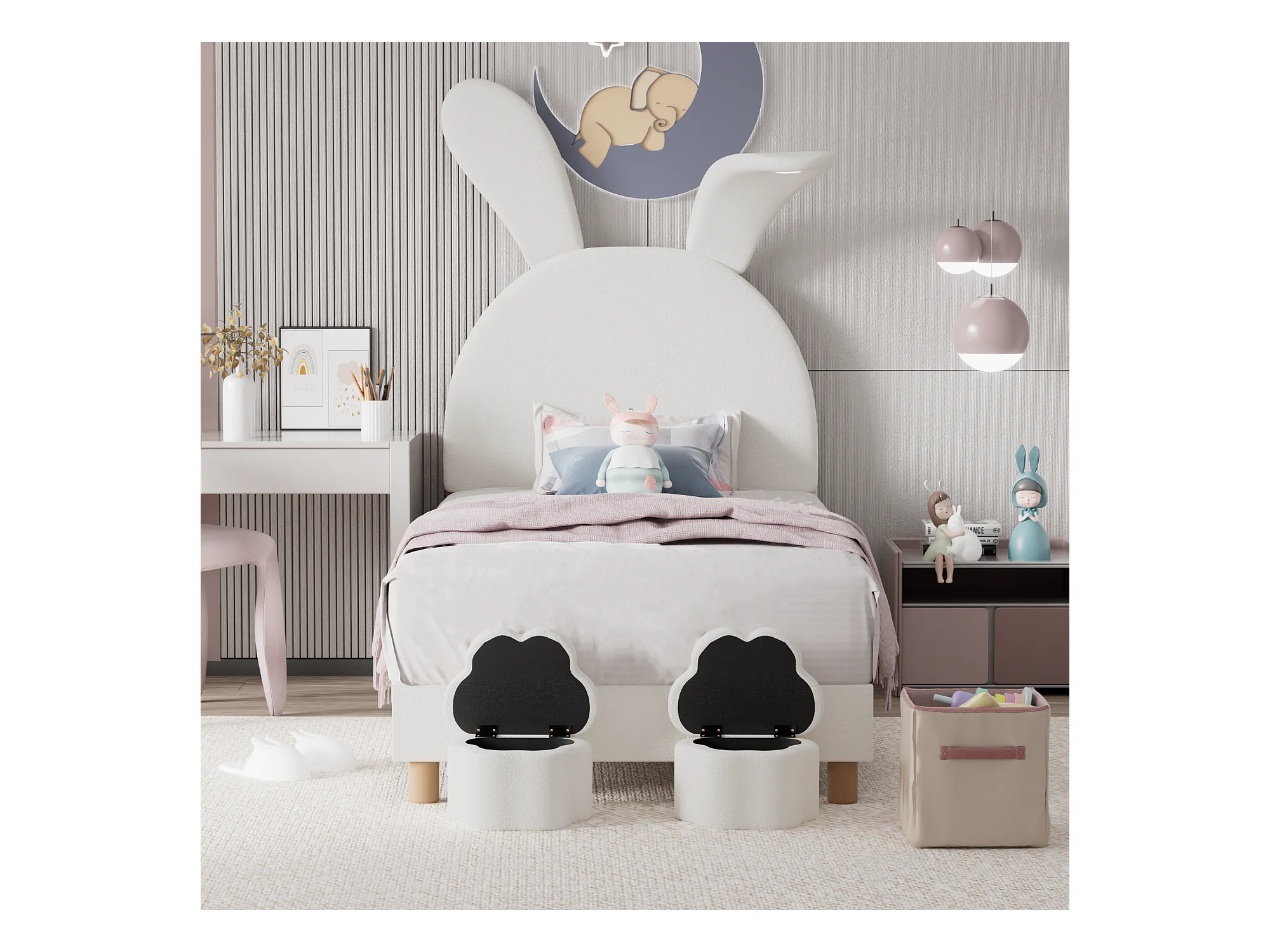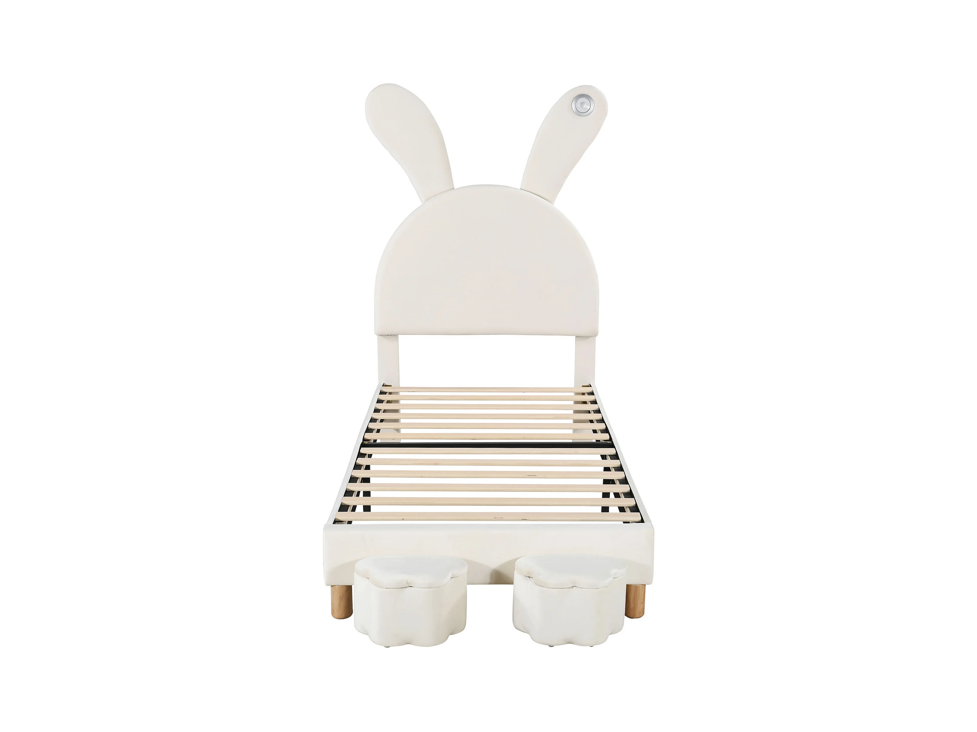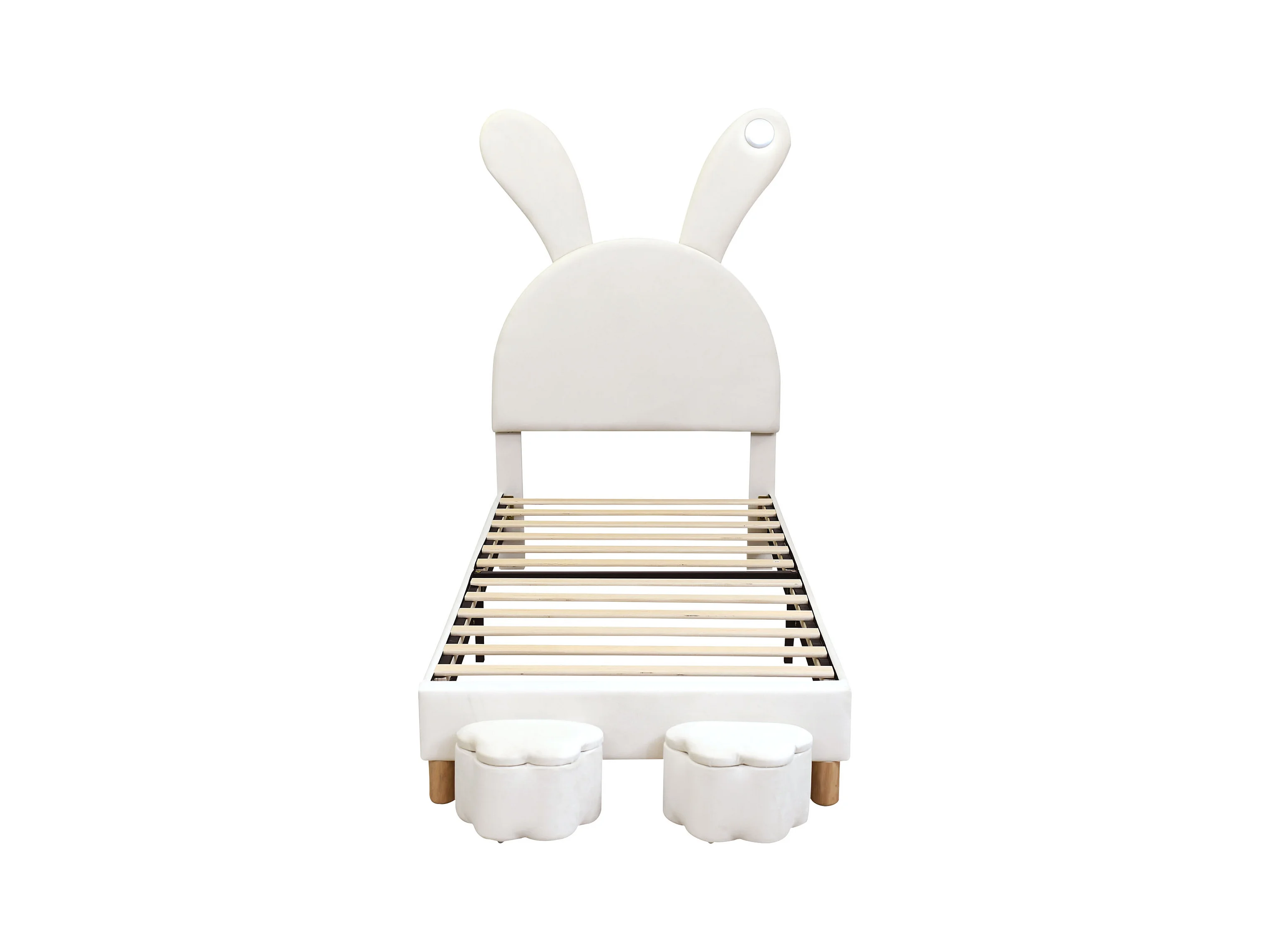 Lit capitonné 90 x 200 cm avec 2 tabourets de rangement pour enfant - chevet LEDs - tête de lit réglable - velours - blanc