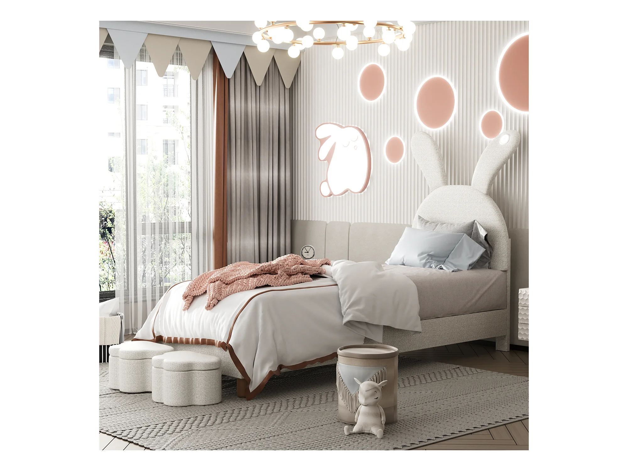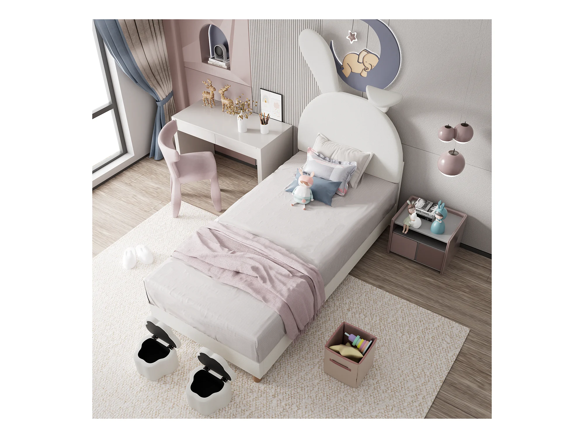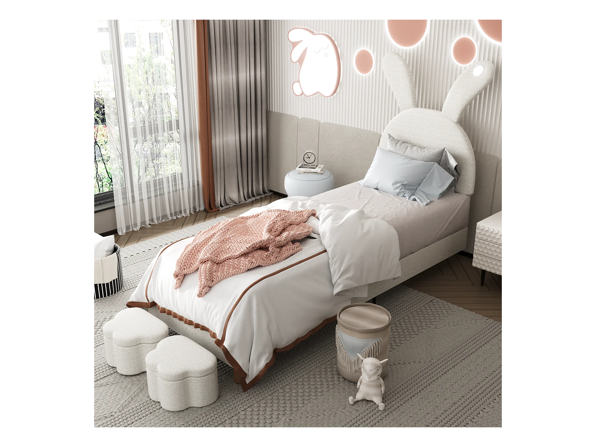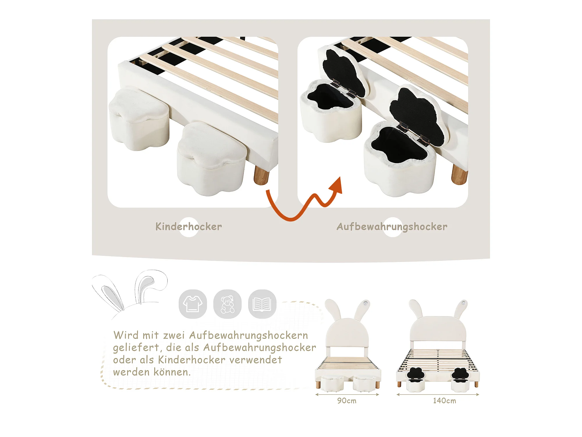Lit capitonné 90 x 200 cm avec 2 tabourets de rangement pour enfant - chevet LEDs - tête de lit réglable - velours - blanc
