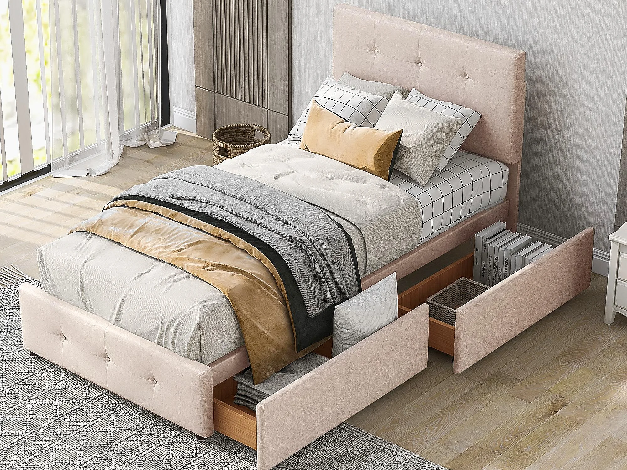 Lit capitonné 90 x 200 cm avec 2 tiroirs - Velours - Sommier à lattes inclus - Beige foncé