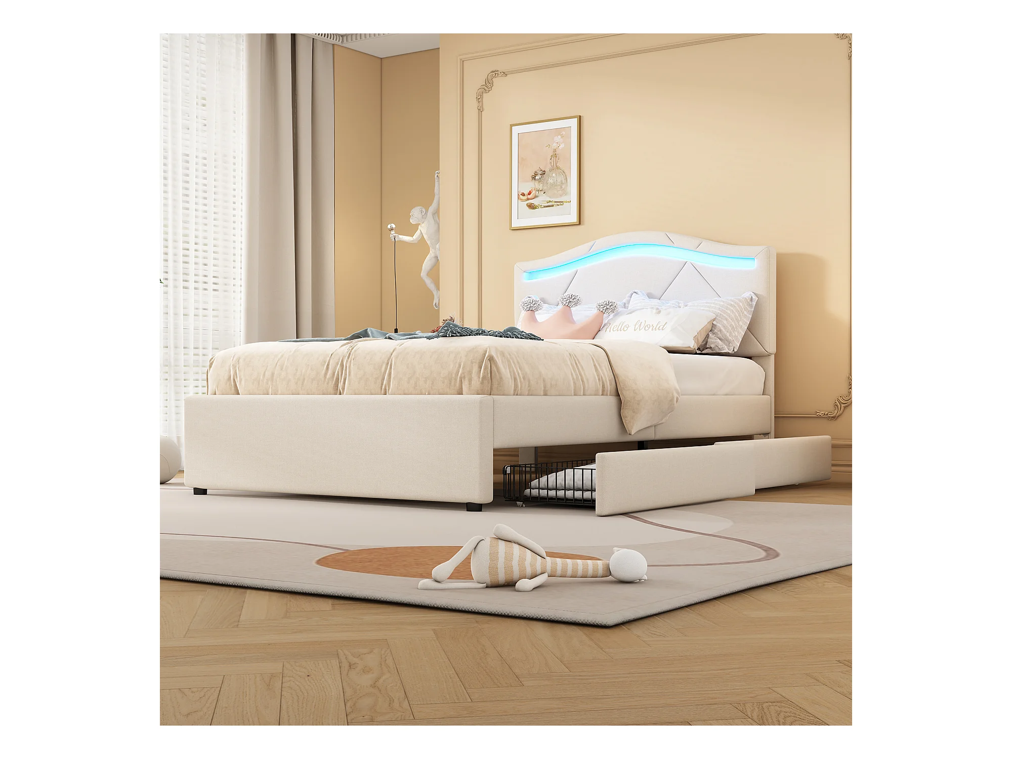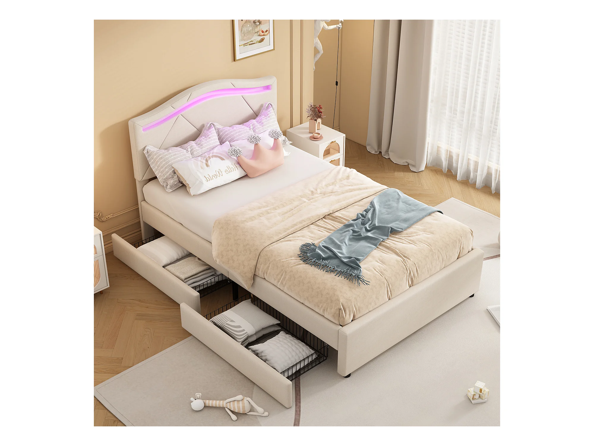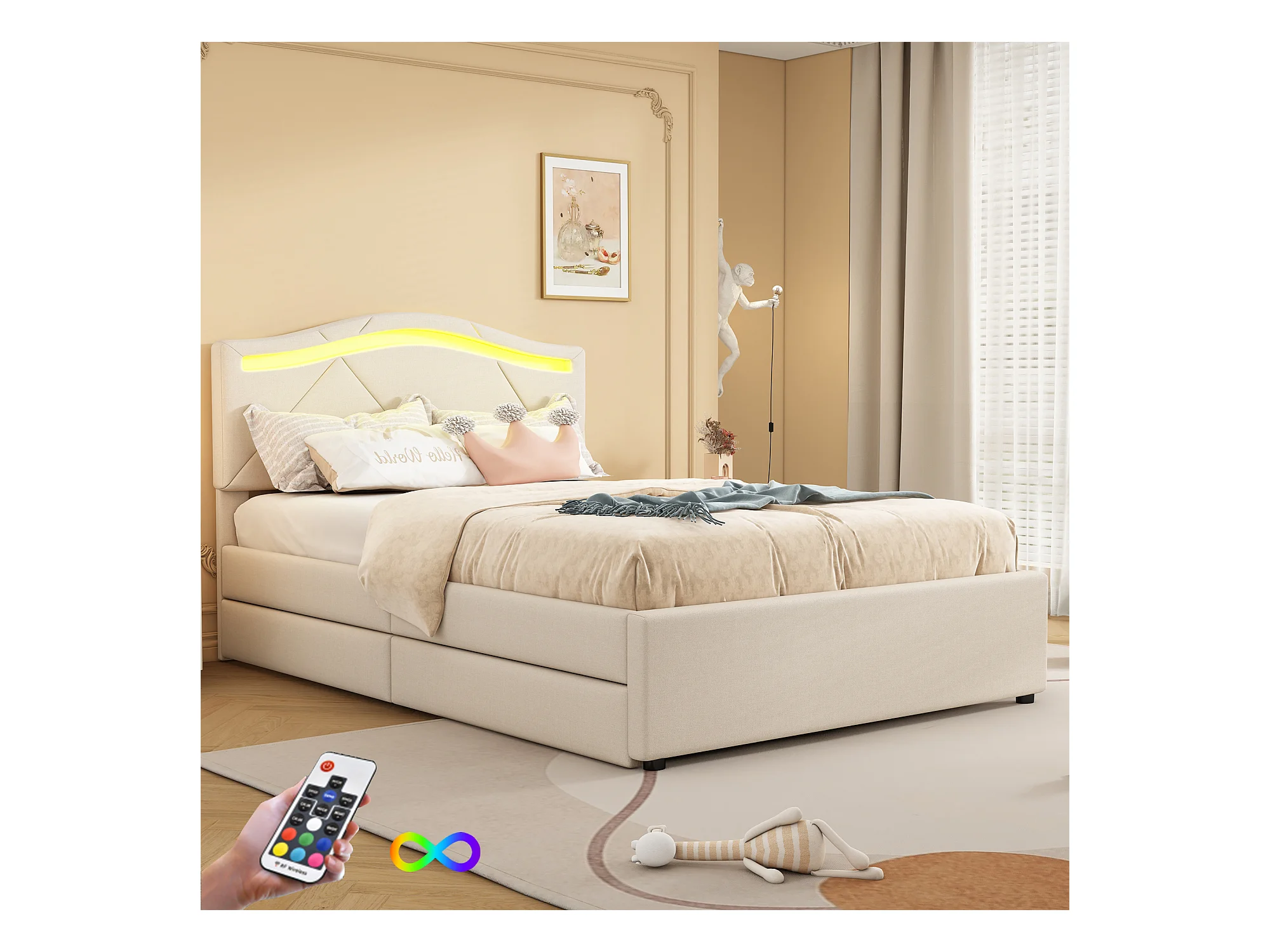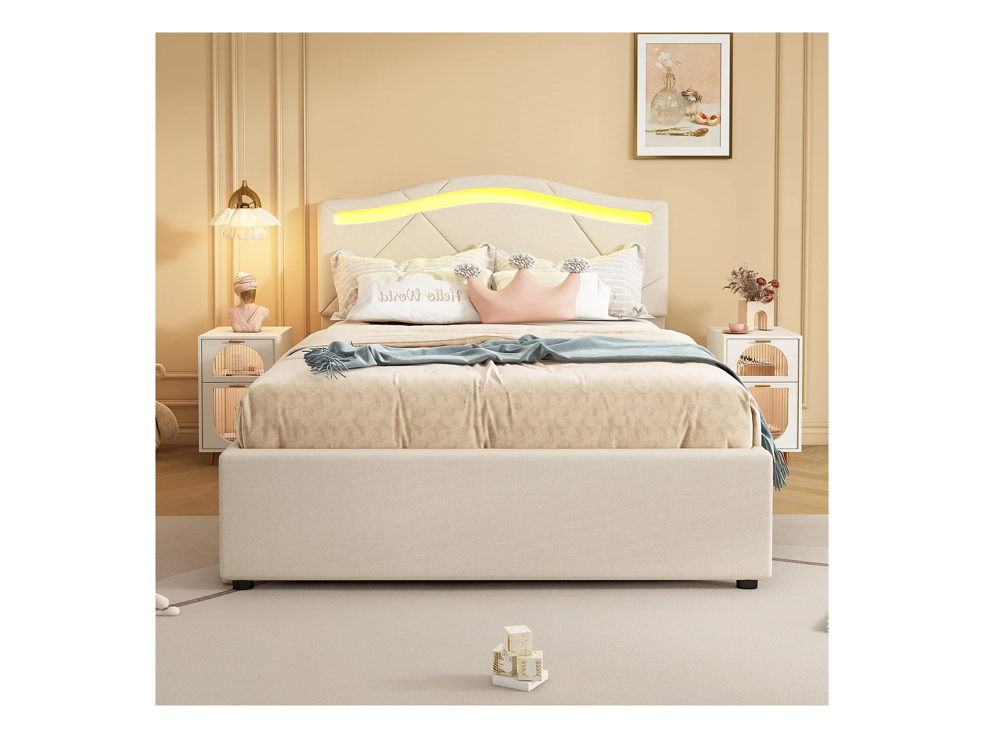 Lit capitonné 90 x 200 cm avec tête de lit réglable - tissu en lin - LEDs - coloris beige