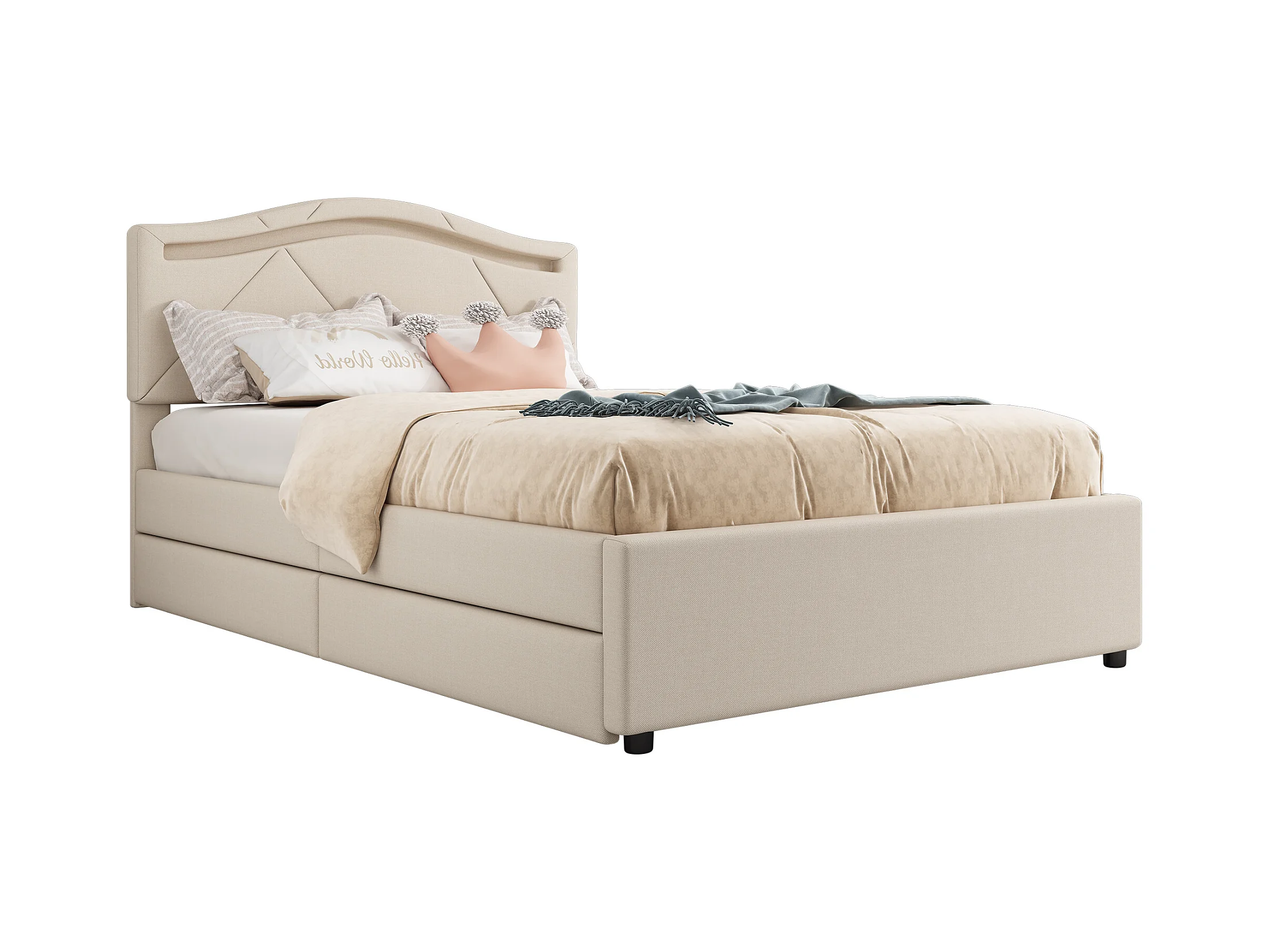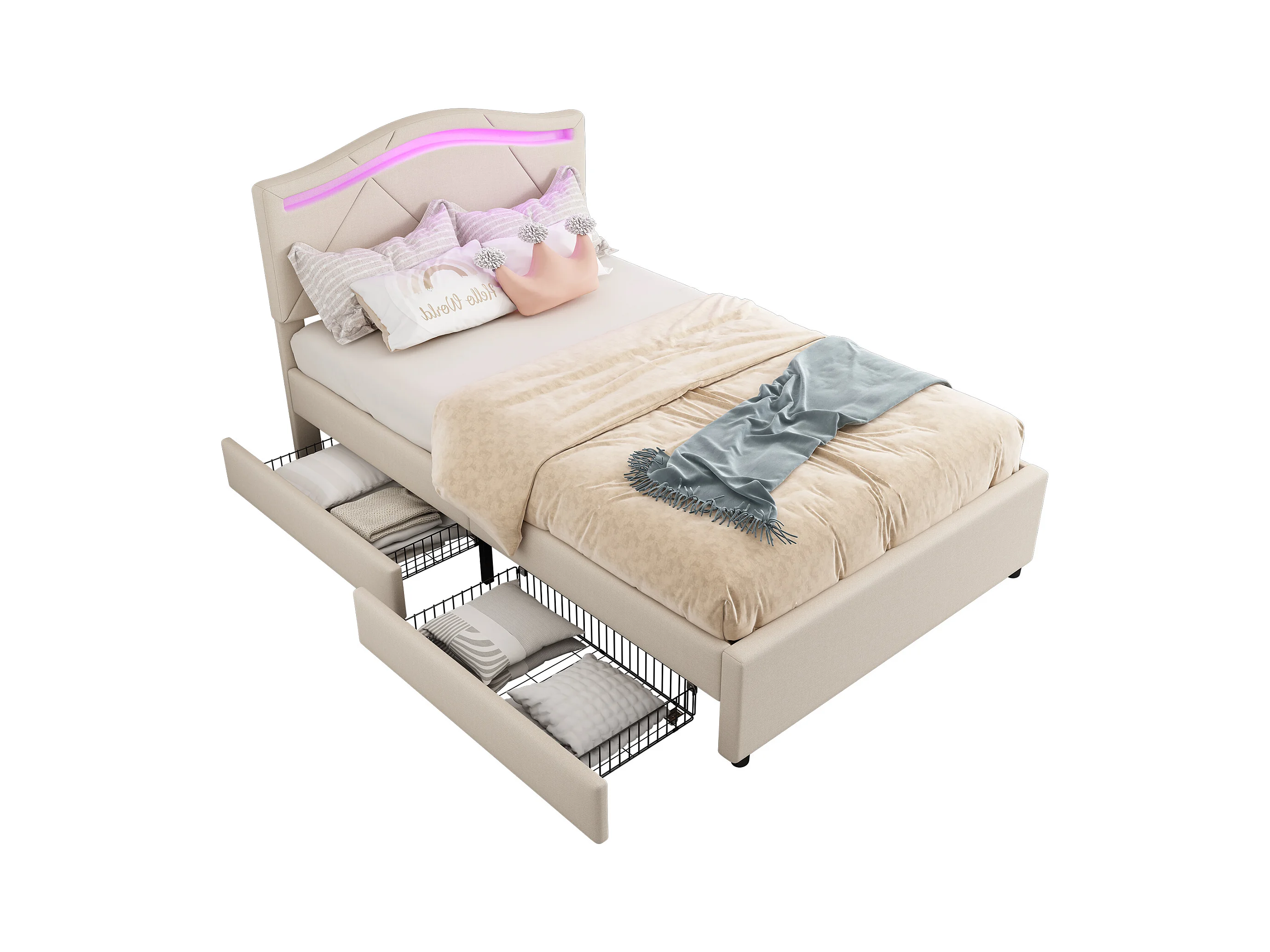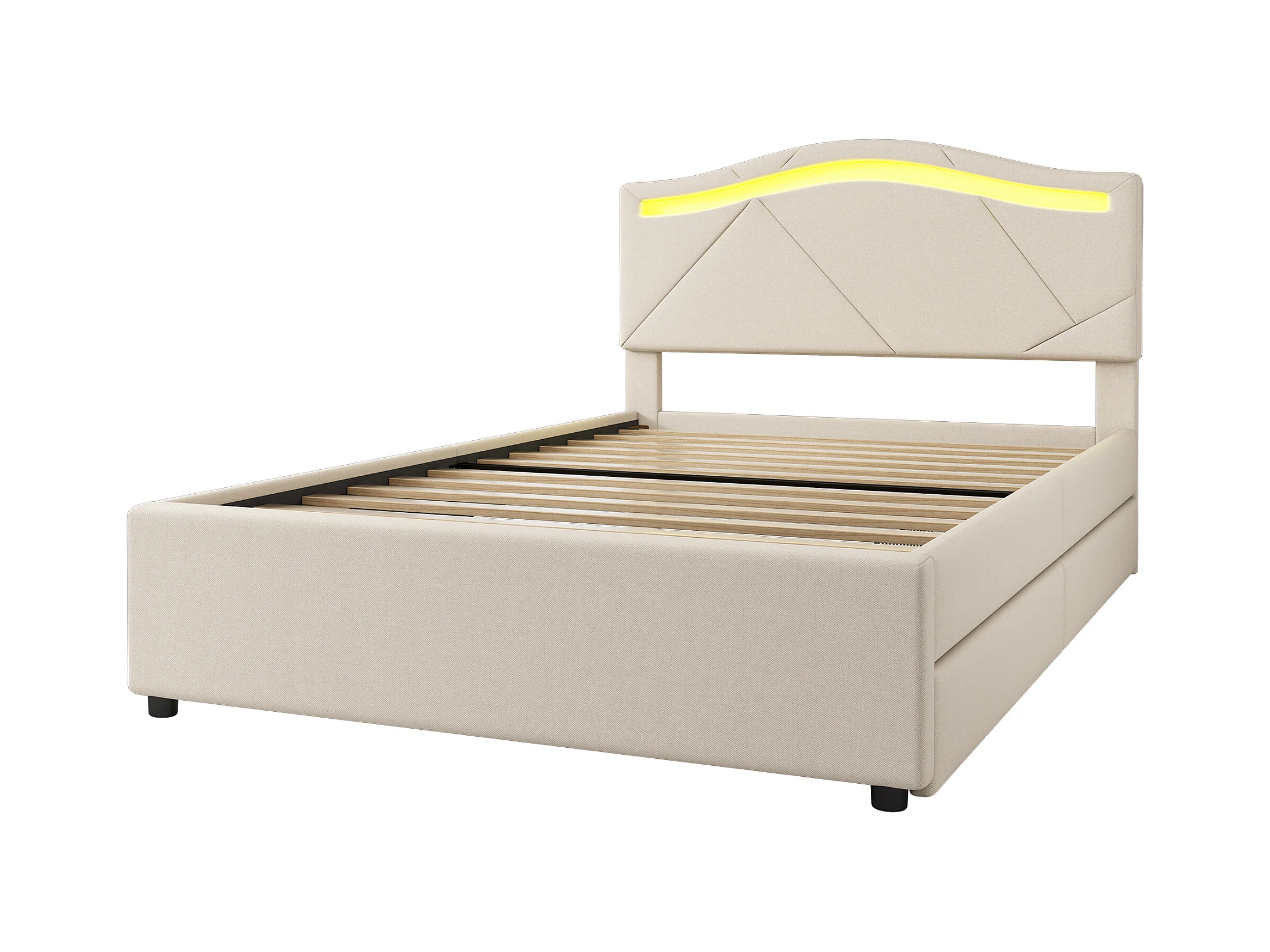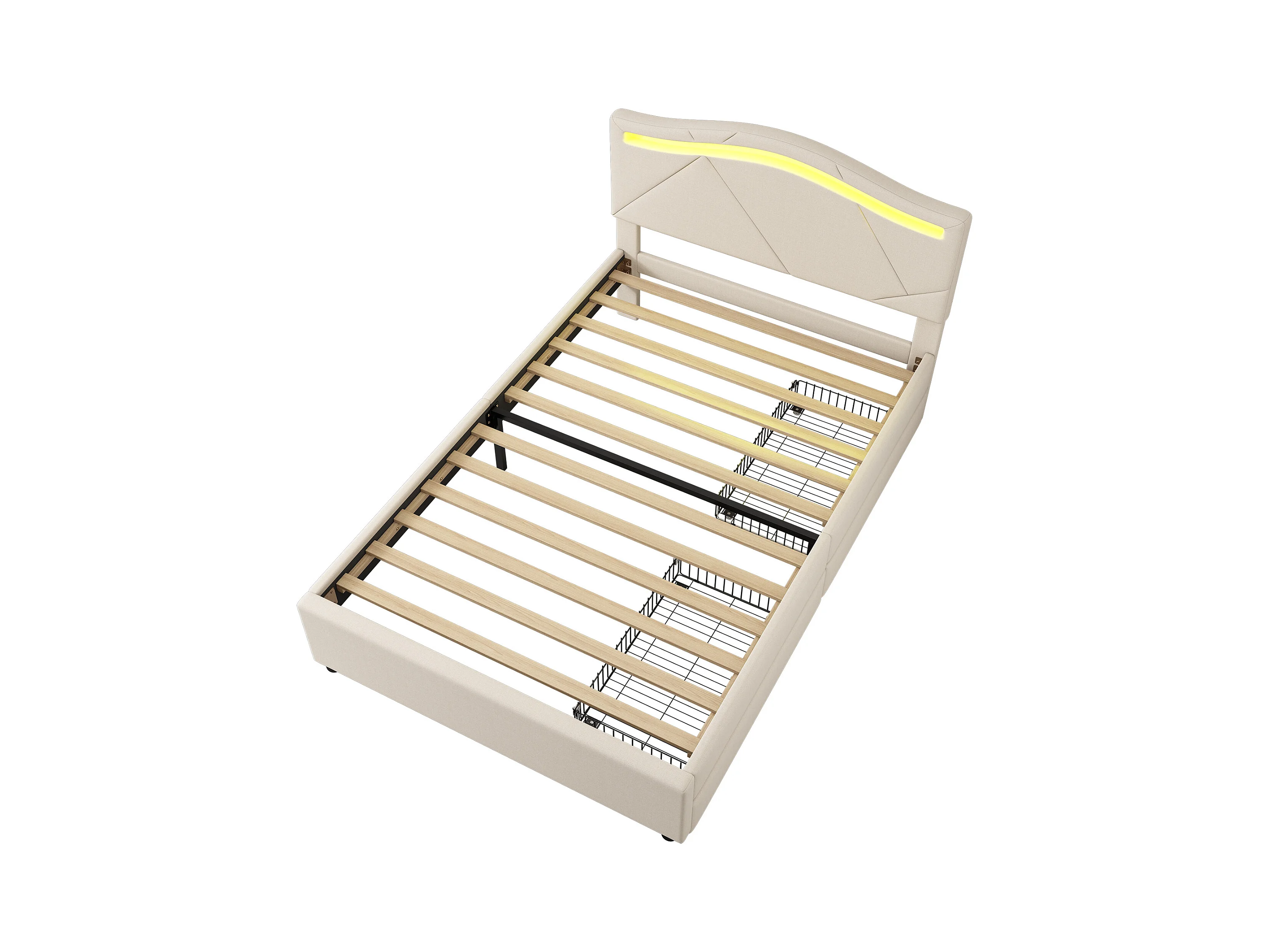 Lit capitonné 90 x 200 cm avec tête de lit réglable - tissu en lin - LEDs - coloris beige
