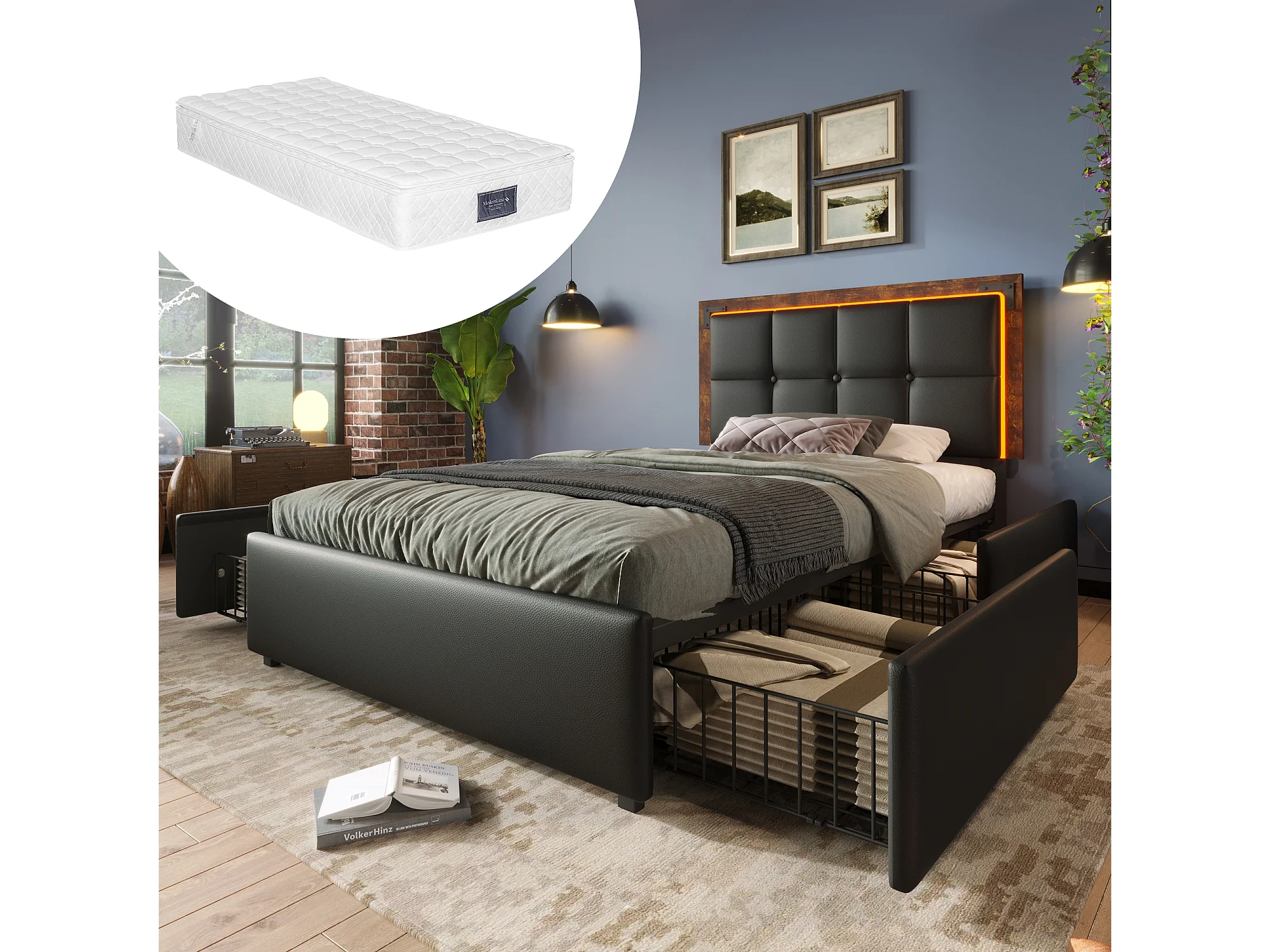 Lit capitonné 90x200cm, lit simple, avec bande lumineuse LED, 4 tiroirs et tête de lit réglable en hauteur, PU, noir, avec matelas