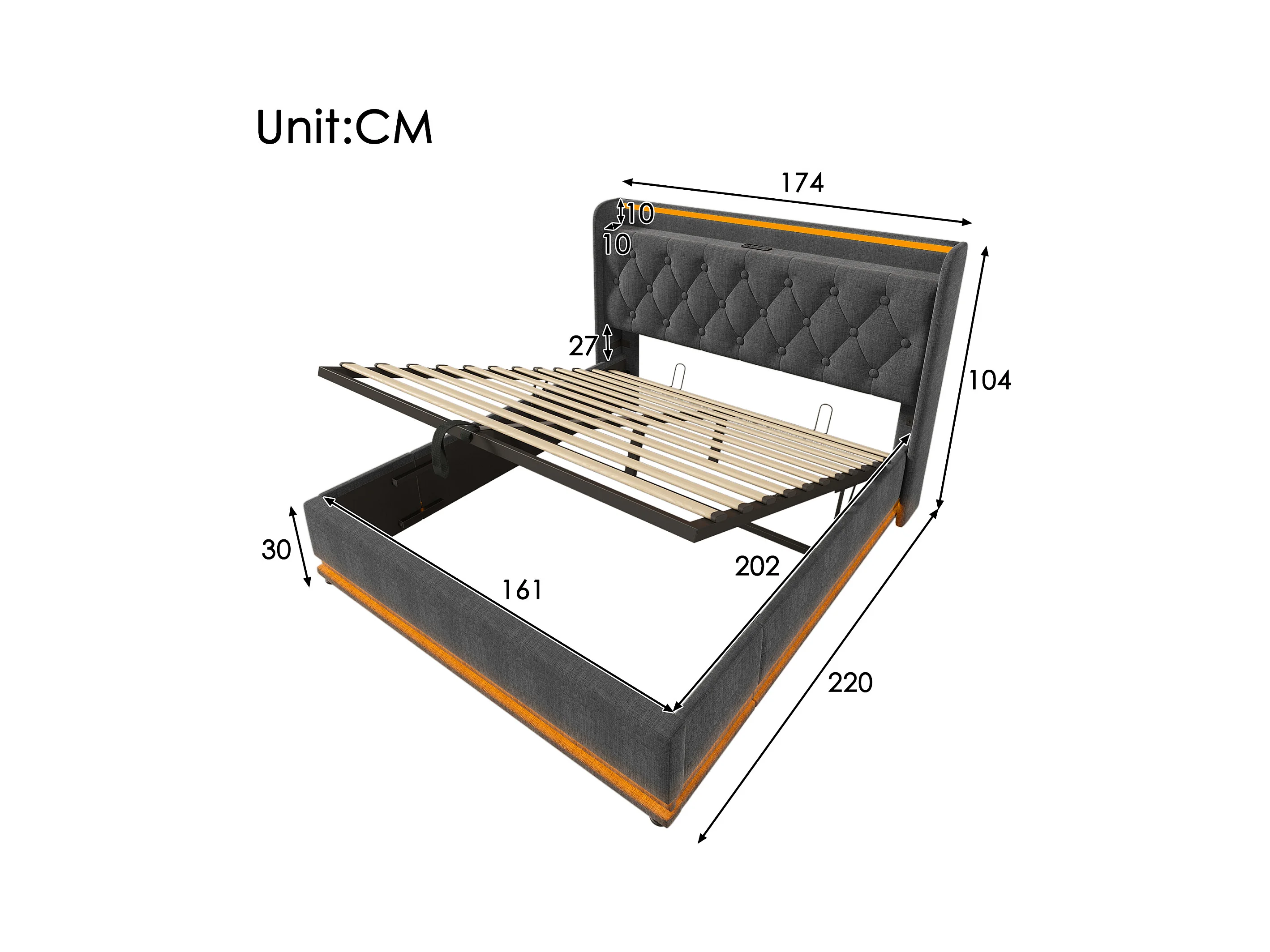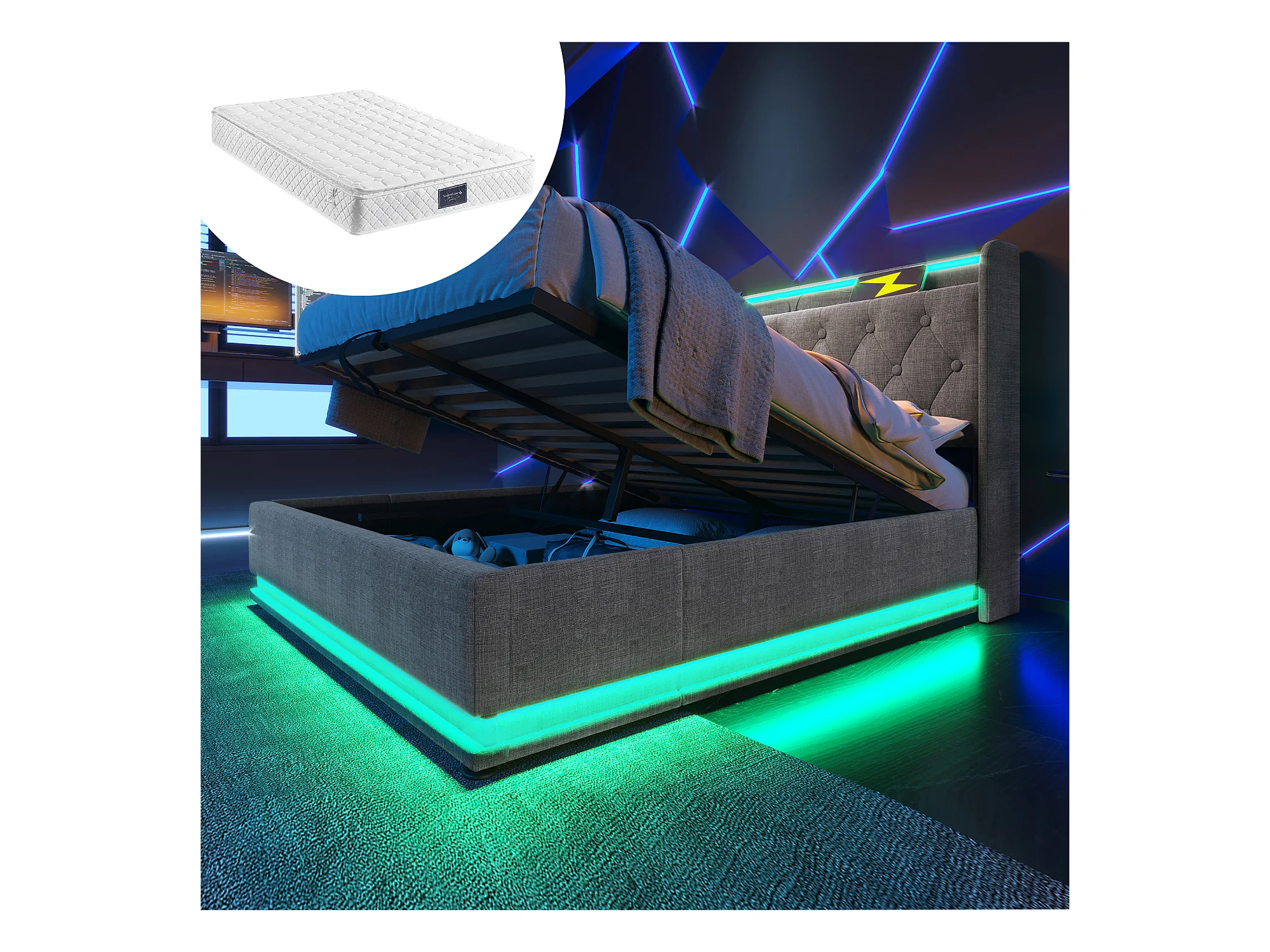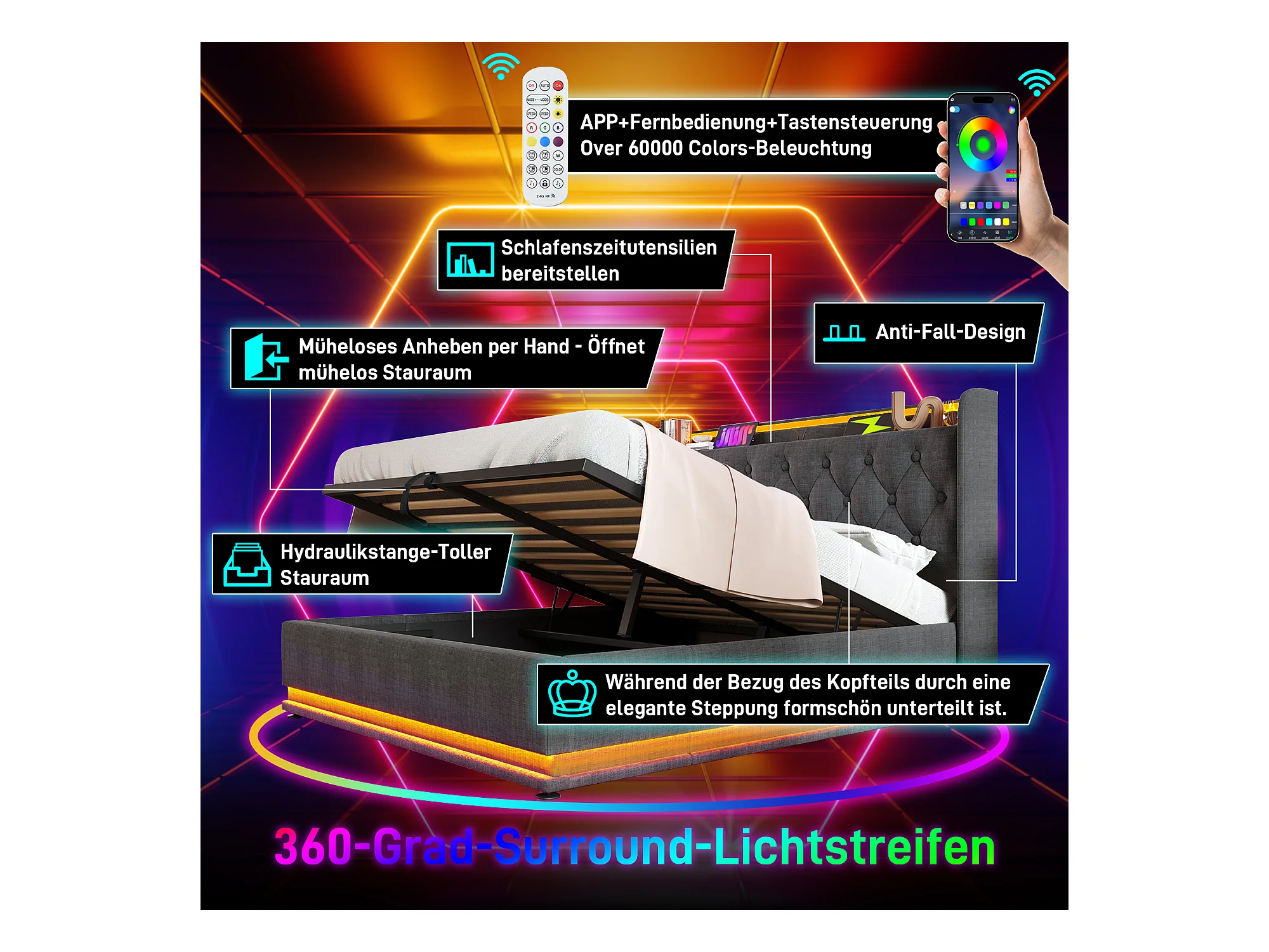 Lit capitonné avec fonction LED 360° et port USB Type-C, avec tête de lit décorative, beige en lin, 160x200 cm (216x170x101 cm)