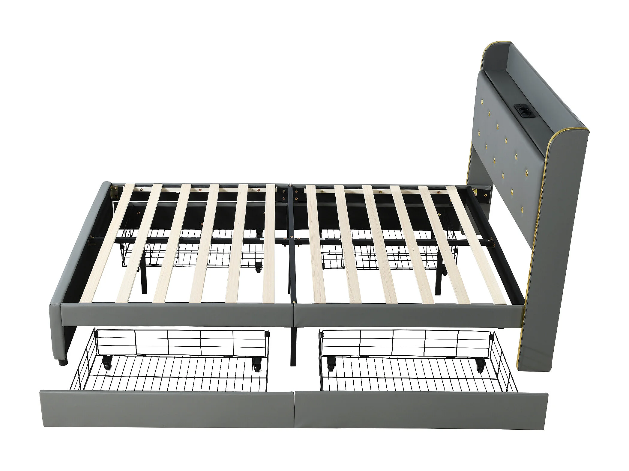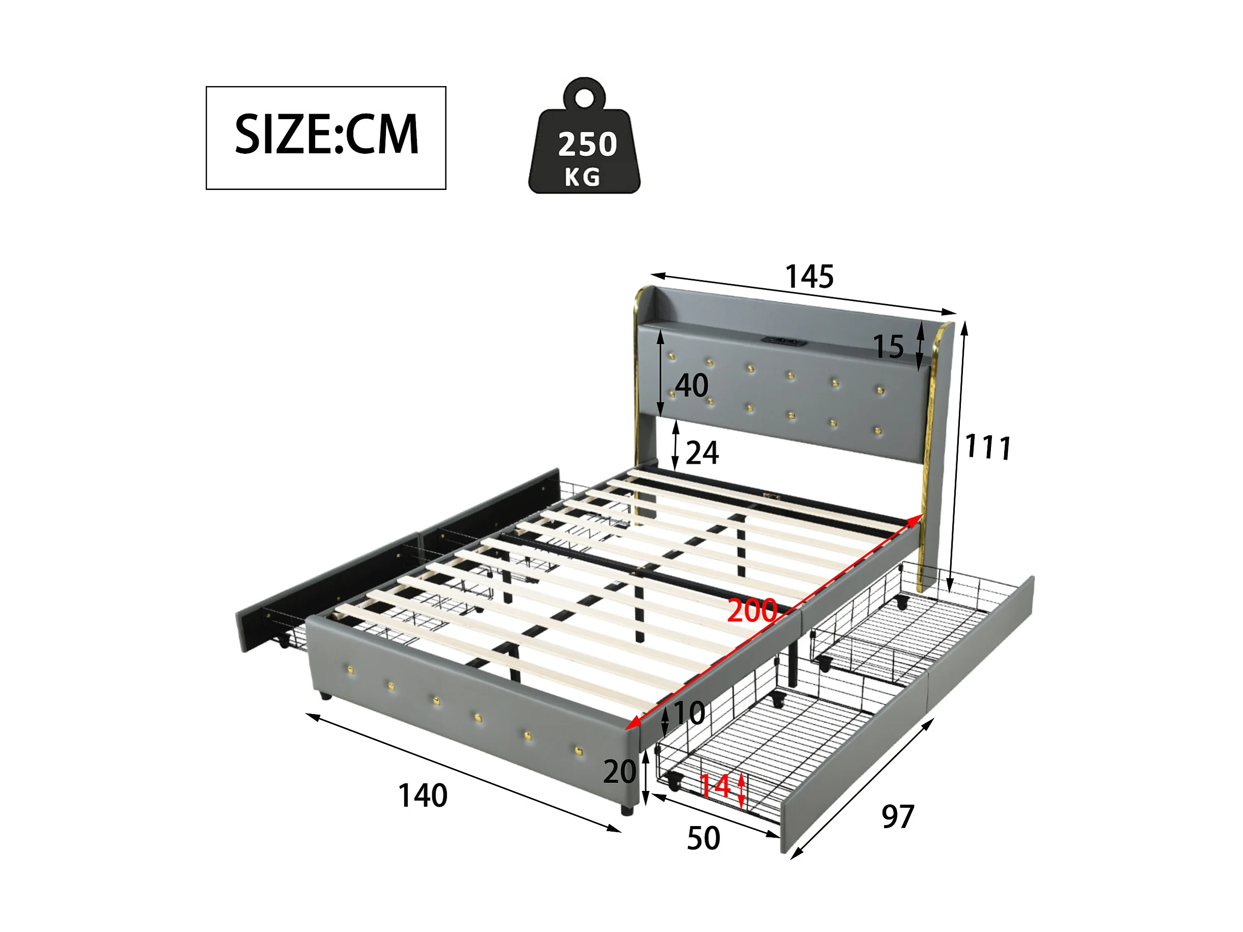 Lit capitonné avec rangement de tête de lit - 140 x 200 cm - similicuir - prise USB - pièds métalliques - gris
