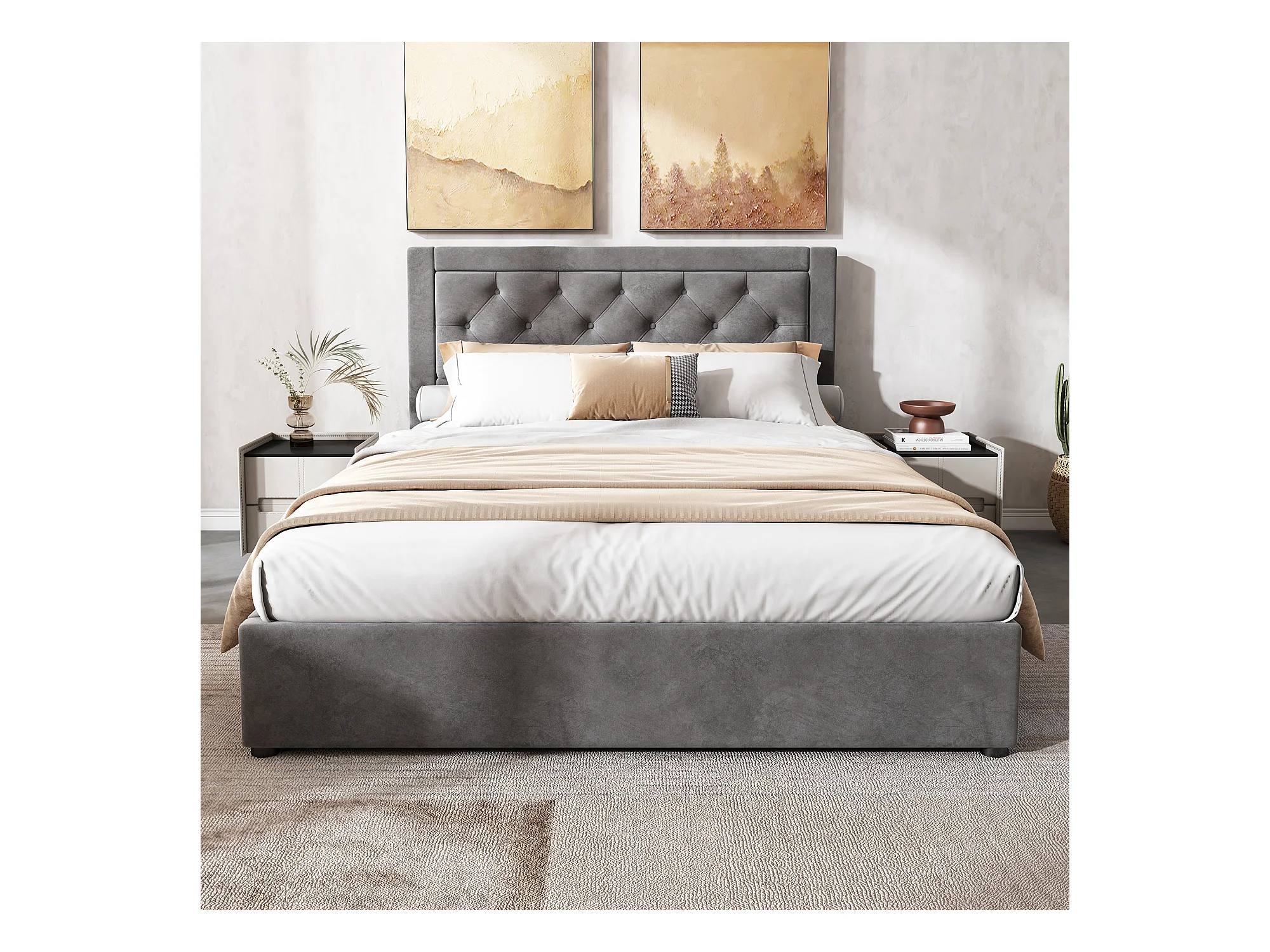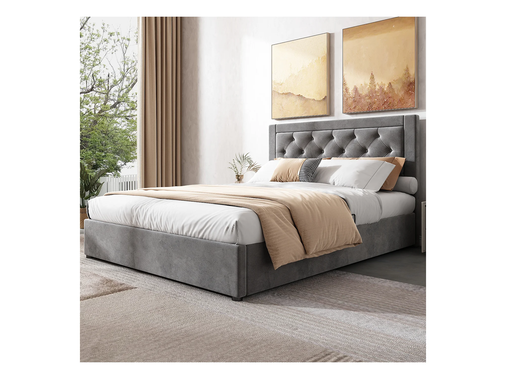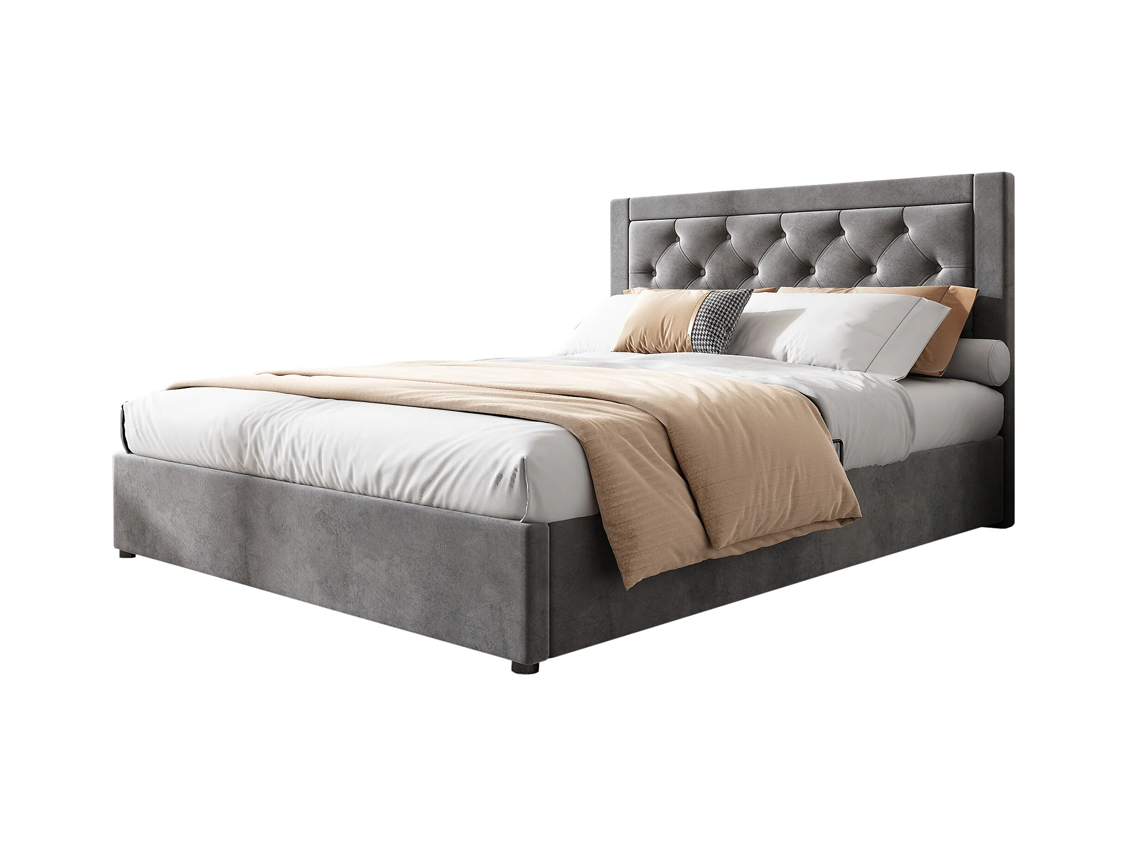 Lit capitonné avec rangement, sommier à lattes et tête de lit, Chesterfield, PU, noir (140x200 cm)