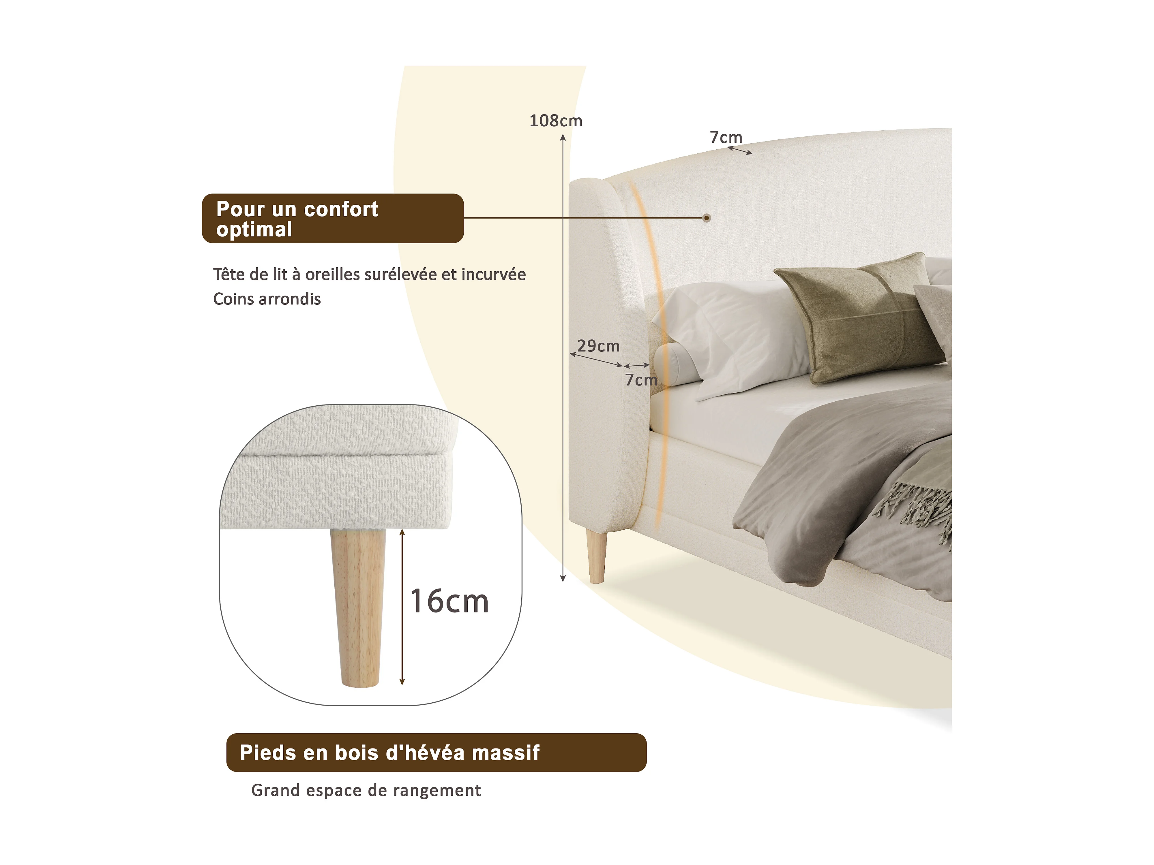 Lit capitonné double - 140 x 190 cm - avec tête de lit à oreilles + sommier à lattes solides - bouclé - blanc