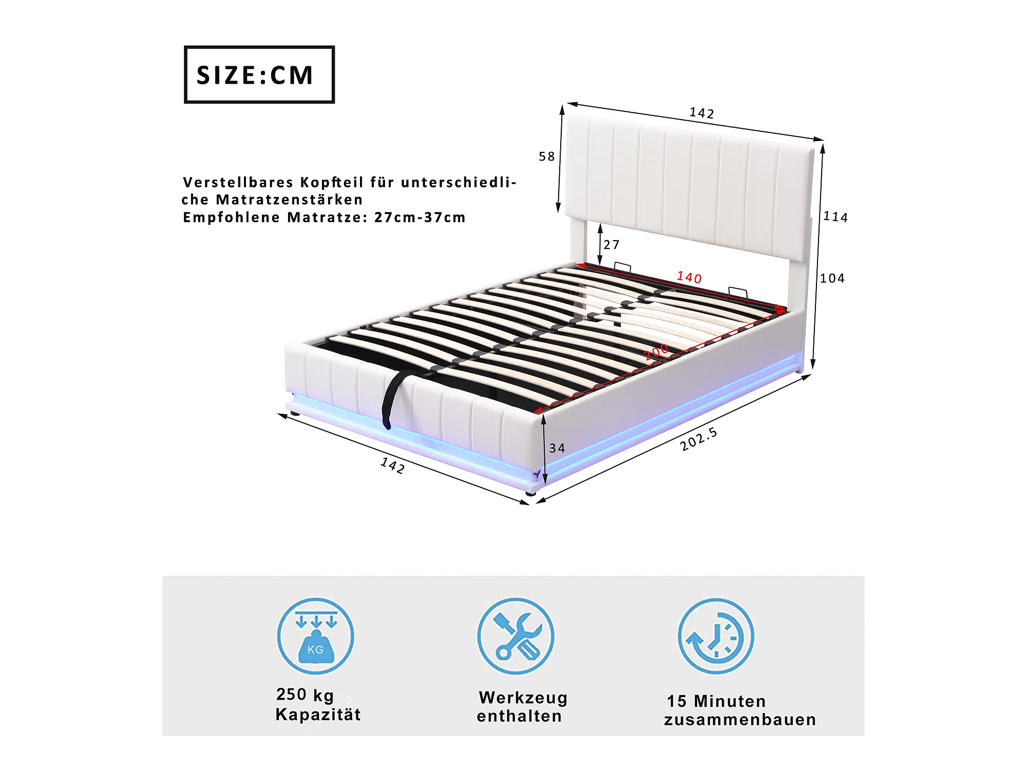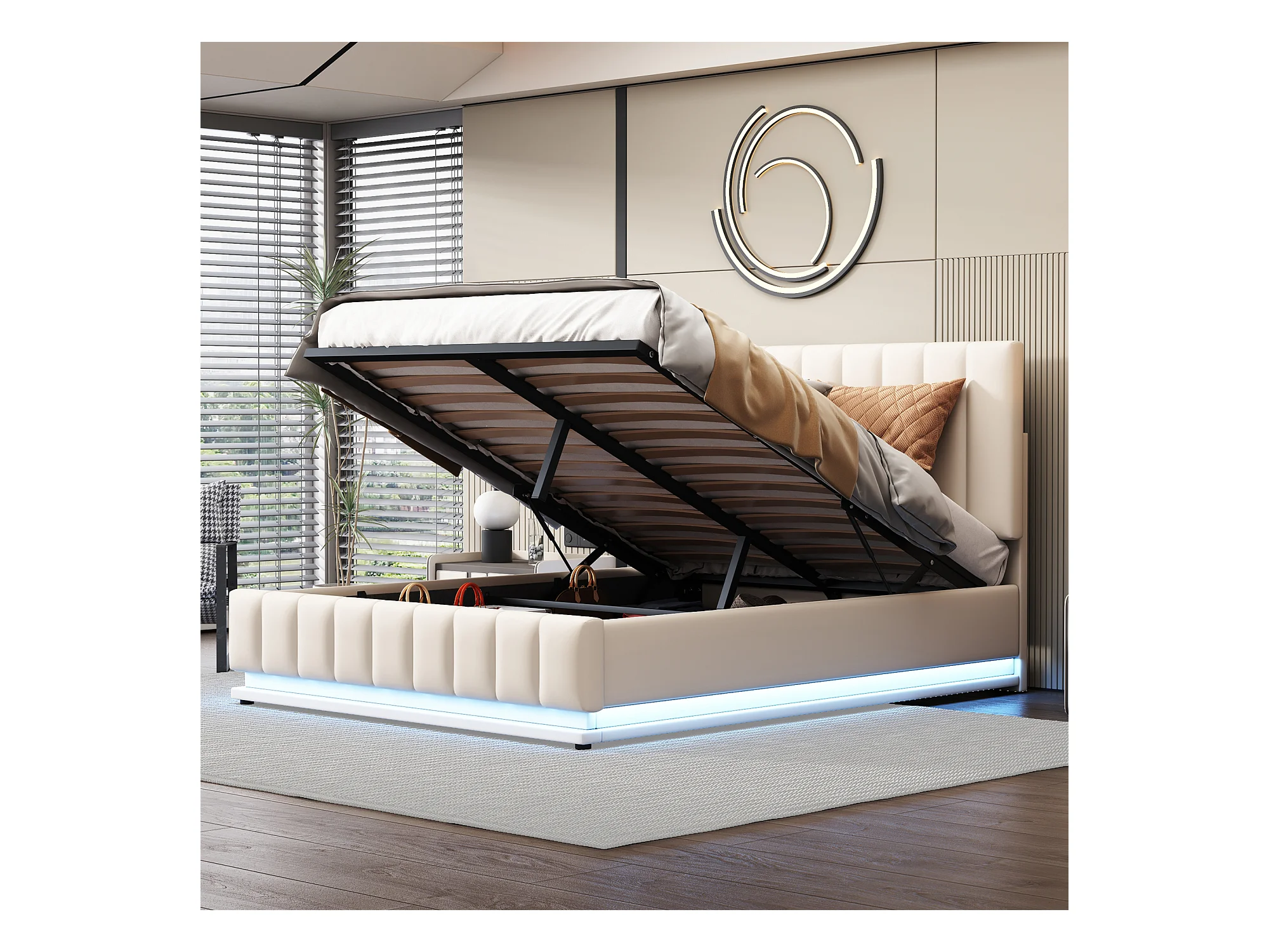 Lit Capitonné Double LED - Sommier À Lattes & Tête De Lit Réglable En Hauteur & Rangement - 140 X 200 cm - Beige - Sans Matelas