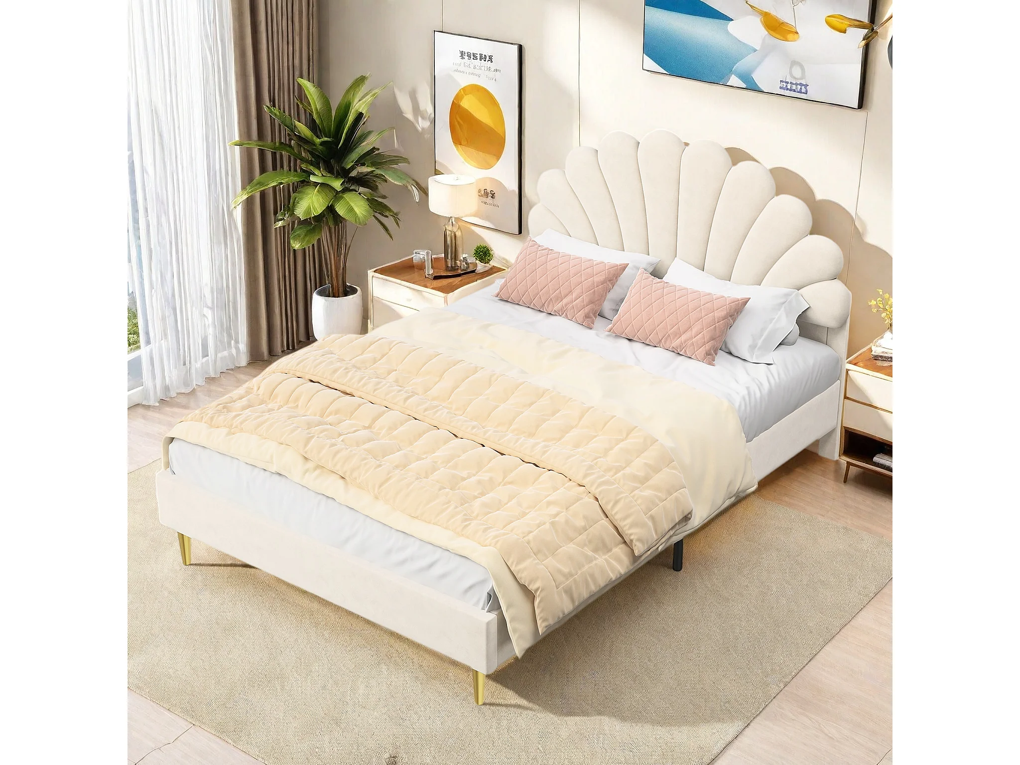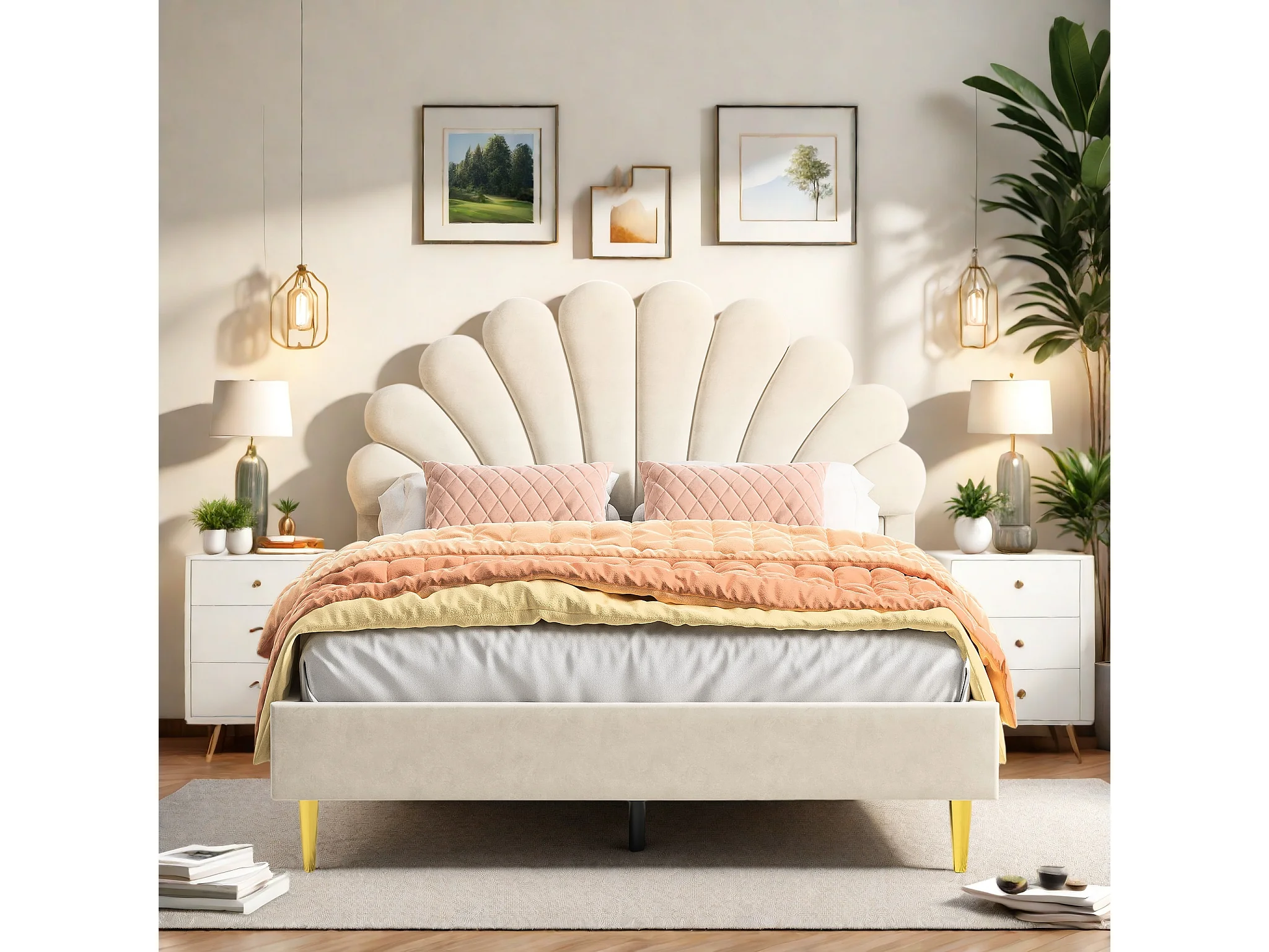 lit capitonné en velours beige,lit double,lit fille 140x200 cm,lit adulte,tête de lit en forme de pétale,pieds métal
