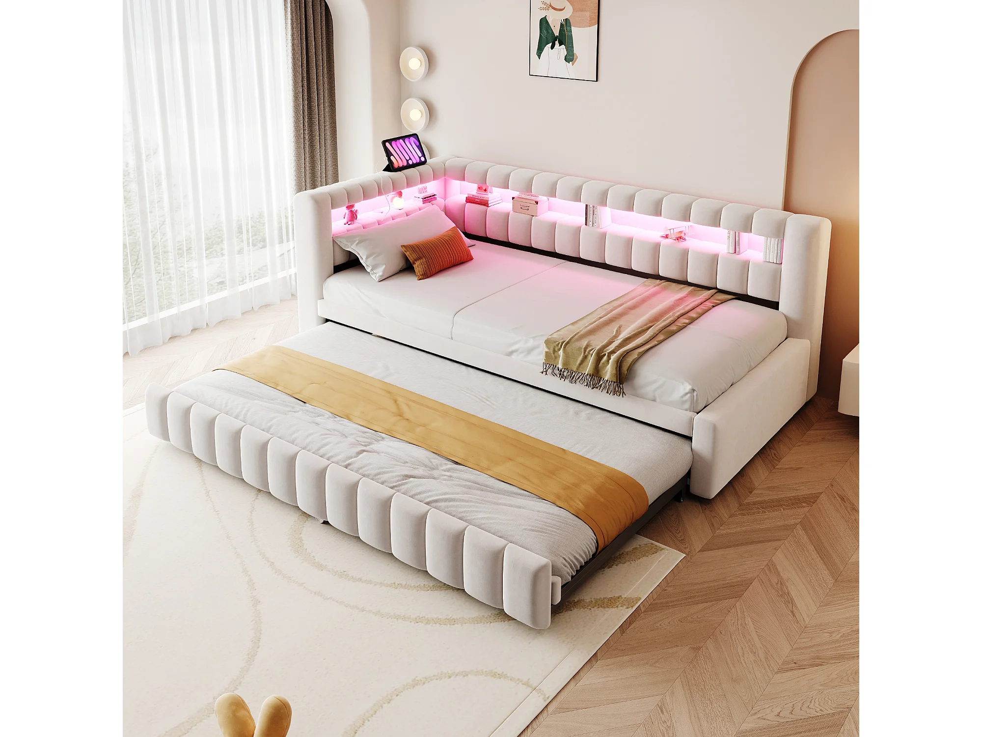 Lit capitonné enfant - 90 x 200 cm - avec lit gigogne 90 x 190 cm + Leds + tête de lit + dossier - velours - beige