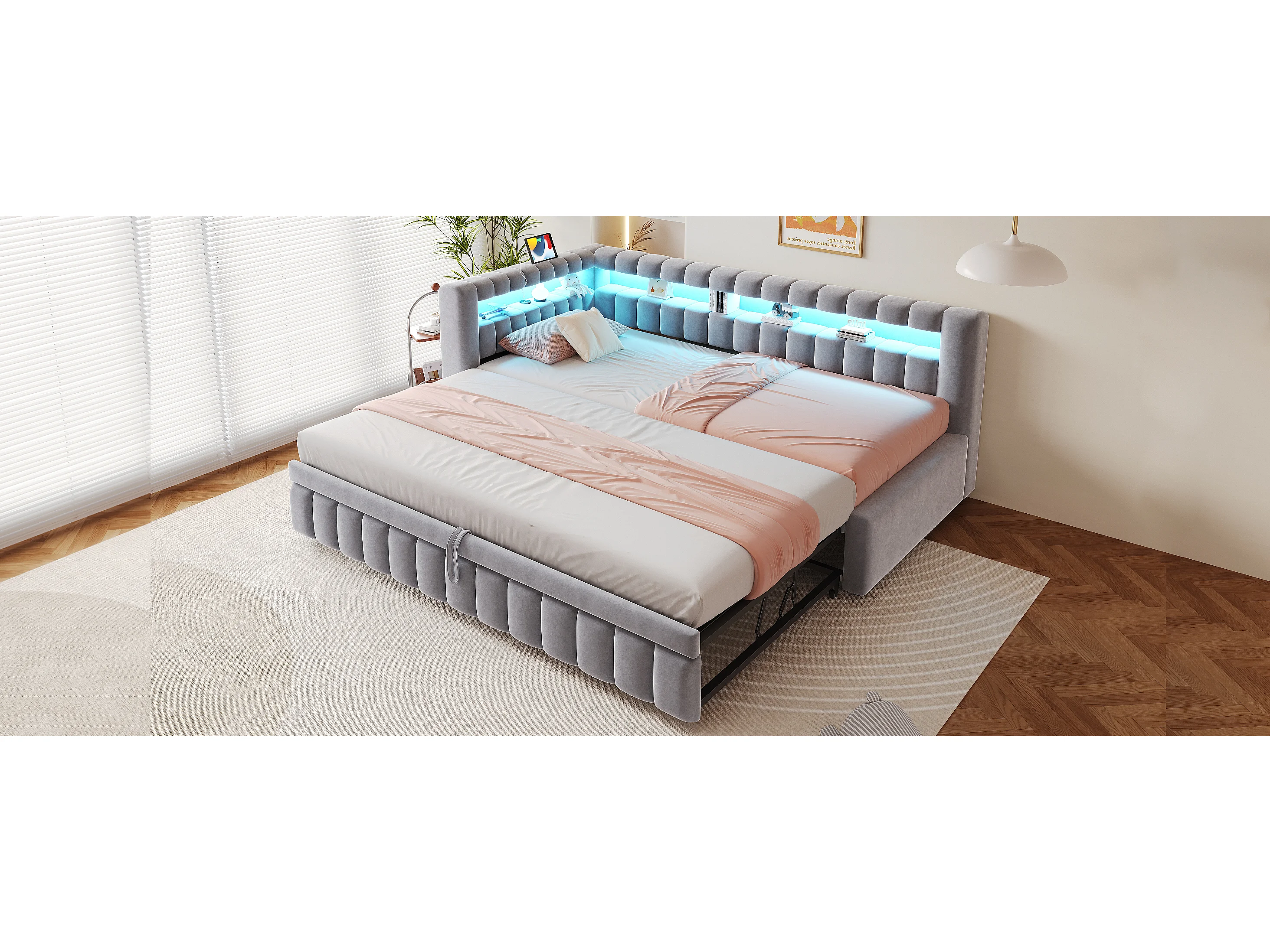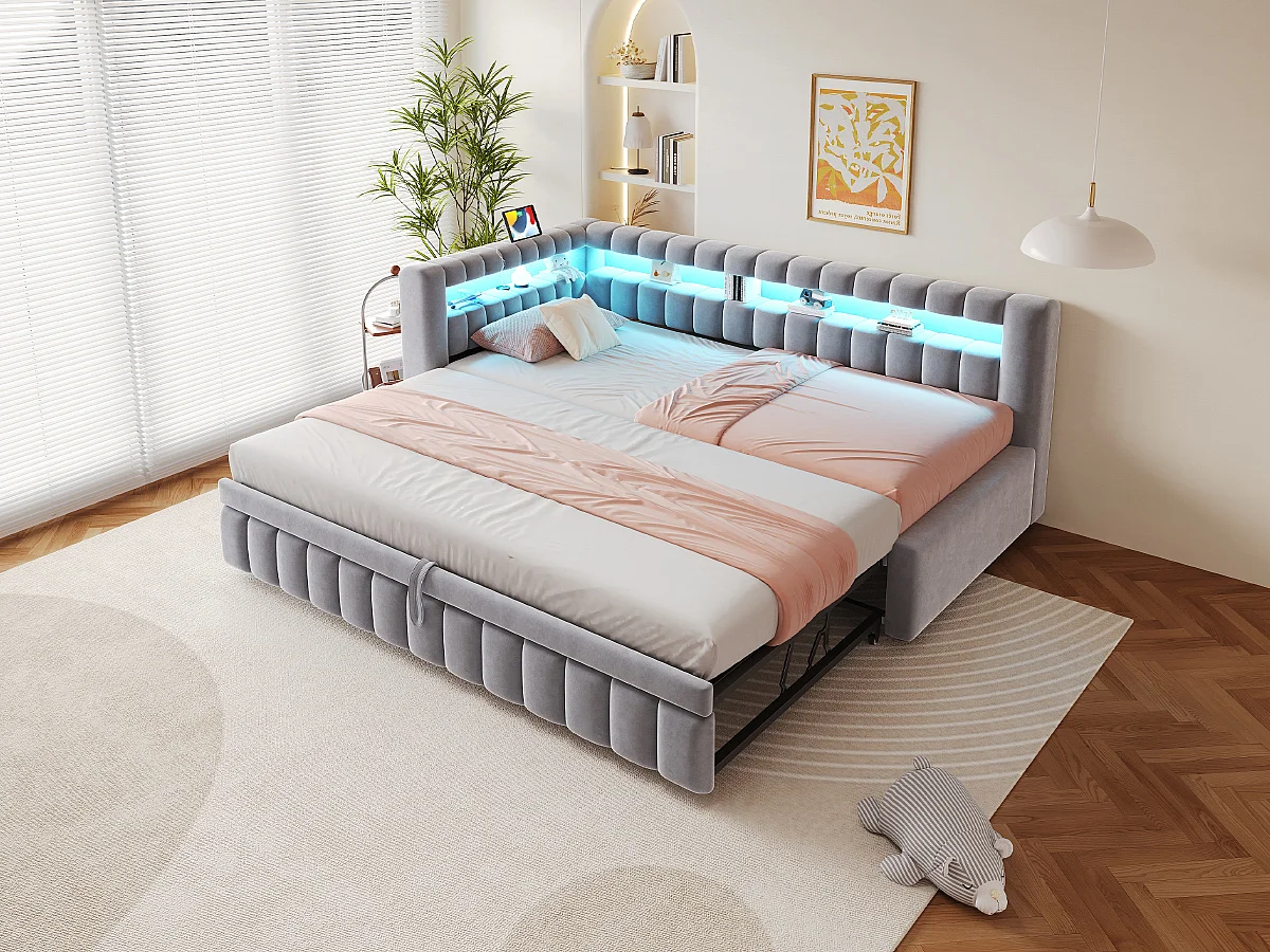 Lit capitonné enfant - 90 x 200 cm - avec lit gigogne 90 x 190 cm + Leds + tête de lit + dossier - velours - gris clair