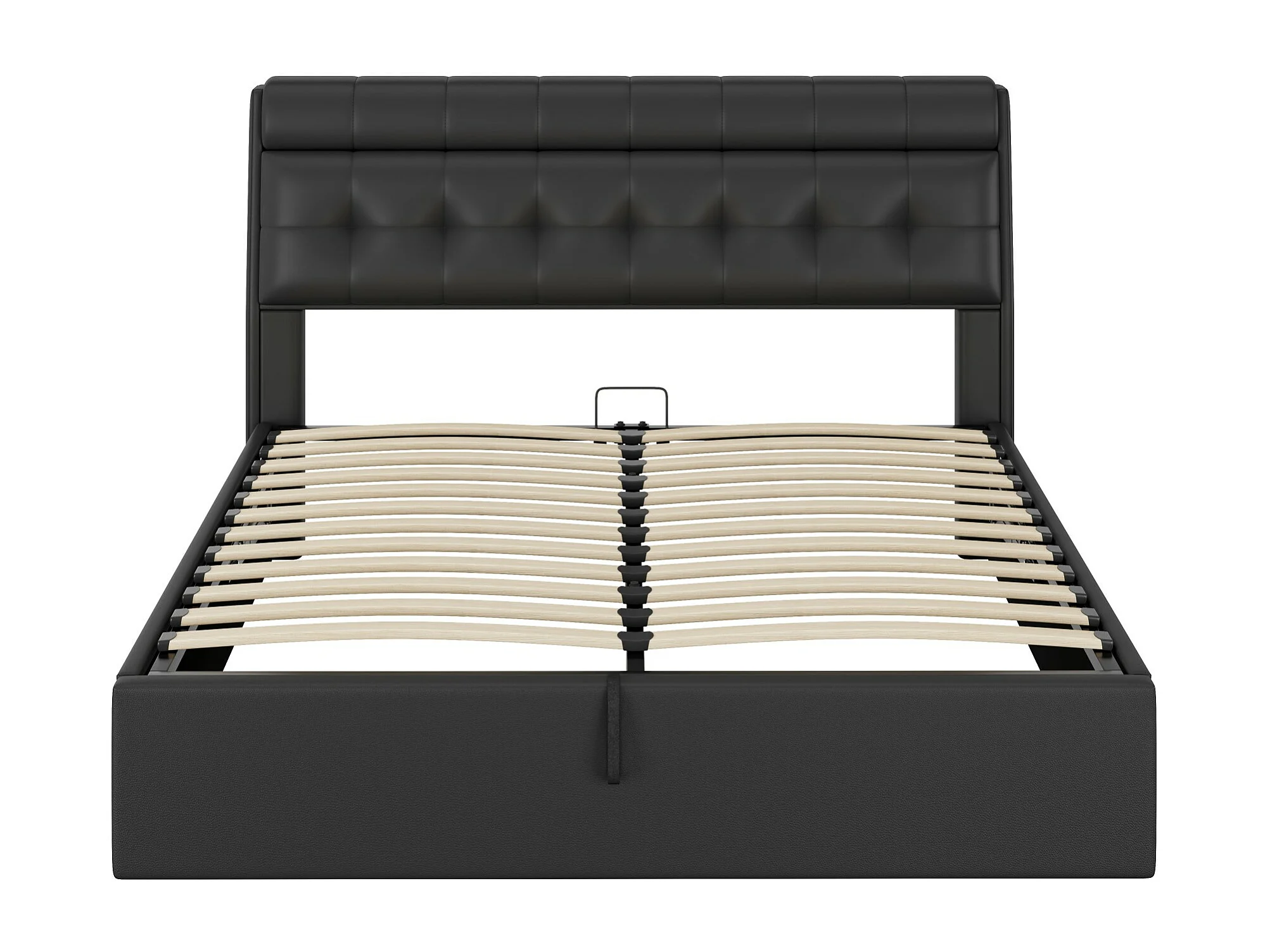 Lit capitonné hydraulique 160*200, rangement dissimulé à la tête de lit, rangement sous le lit, PU, avec sommier à lattes et tête de lit, noir