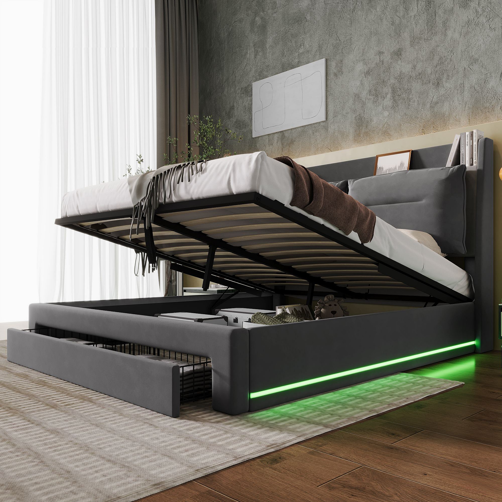 Lit capitonné lumineux LED 140×190 cm, velours gris, rangement hydraulique et tiroirs 2 en 1