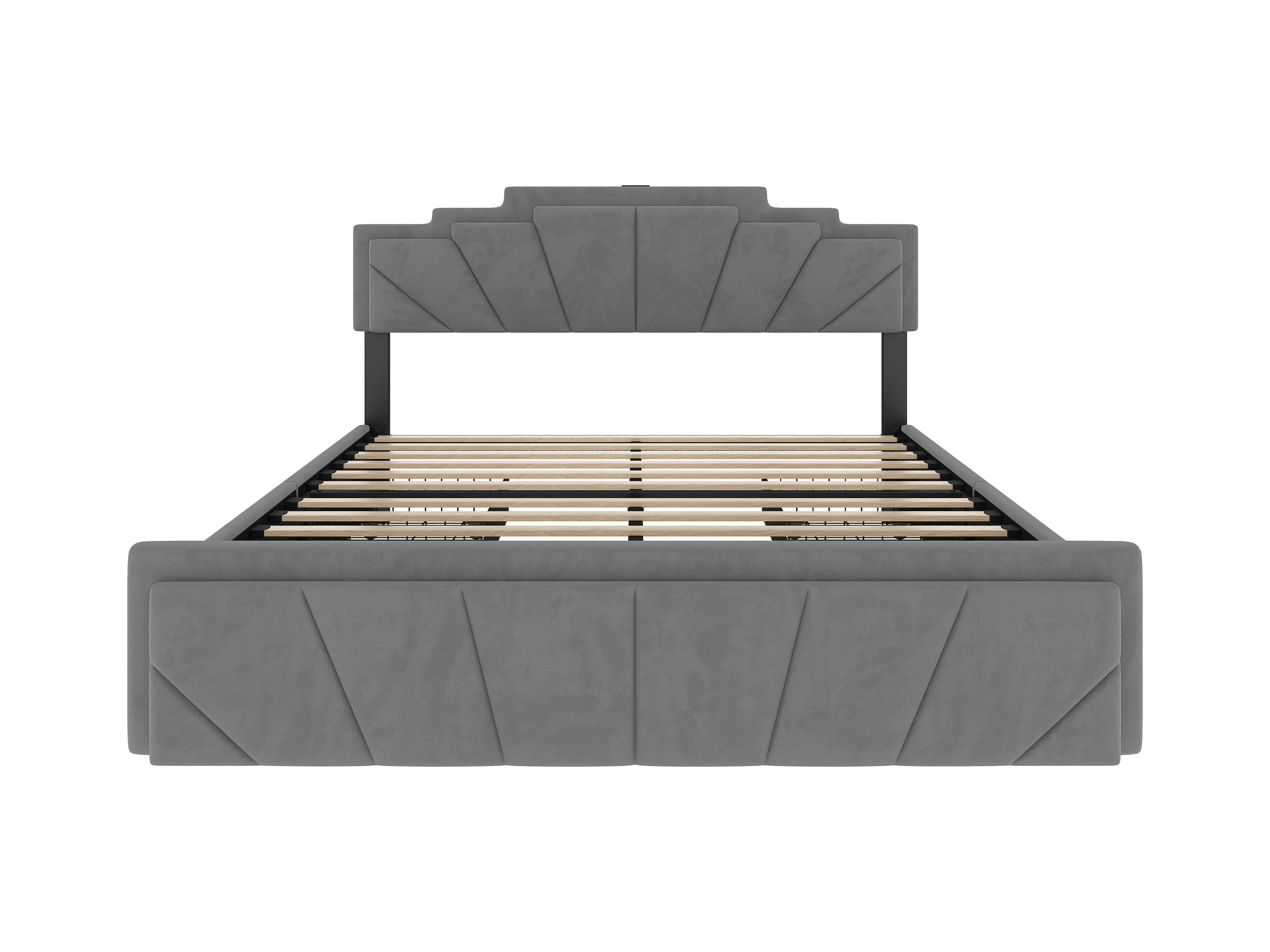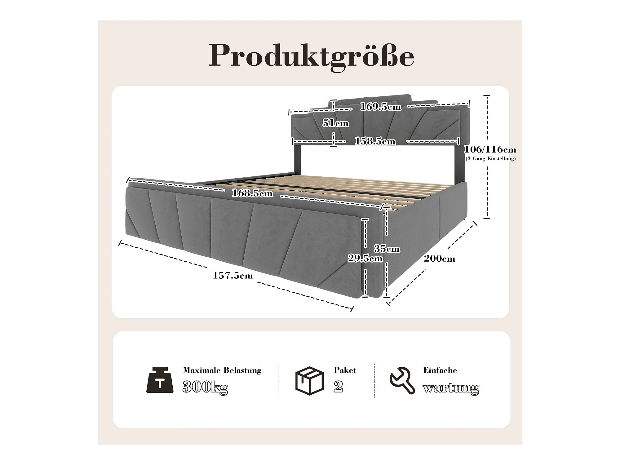 Lit capitonné moderne 160x200cm – Design élégant, tête de lit trapézoïdale unique, bande LED intégrée, 2 réglages de hauteur, USB Type-C, 2 tiroirs spacieux