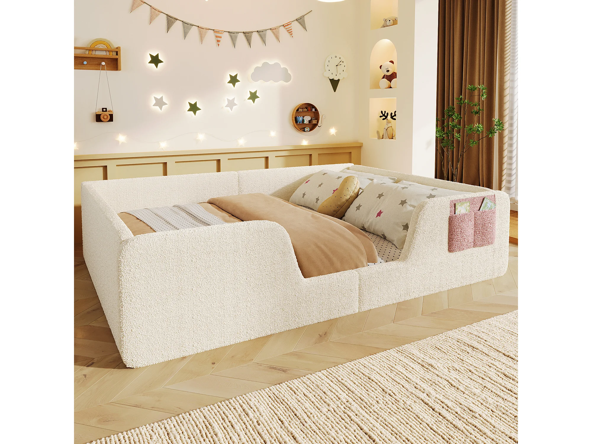 Lit capitonné pour enfant - 140 x 190 cm - avec barrières de sécurité amovibles + sac de rangement en tissu - velours - beige