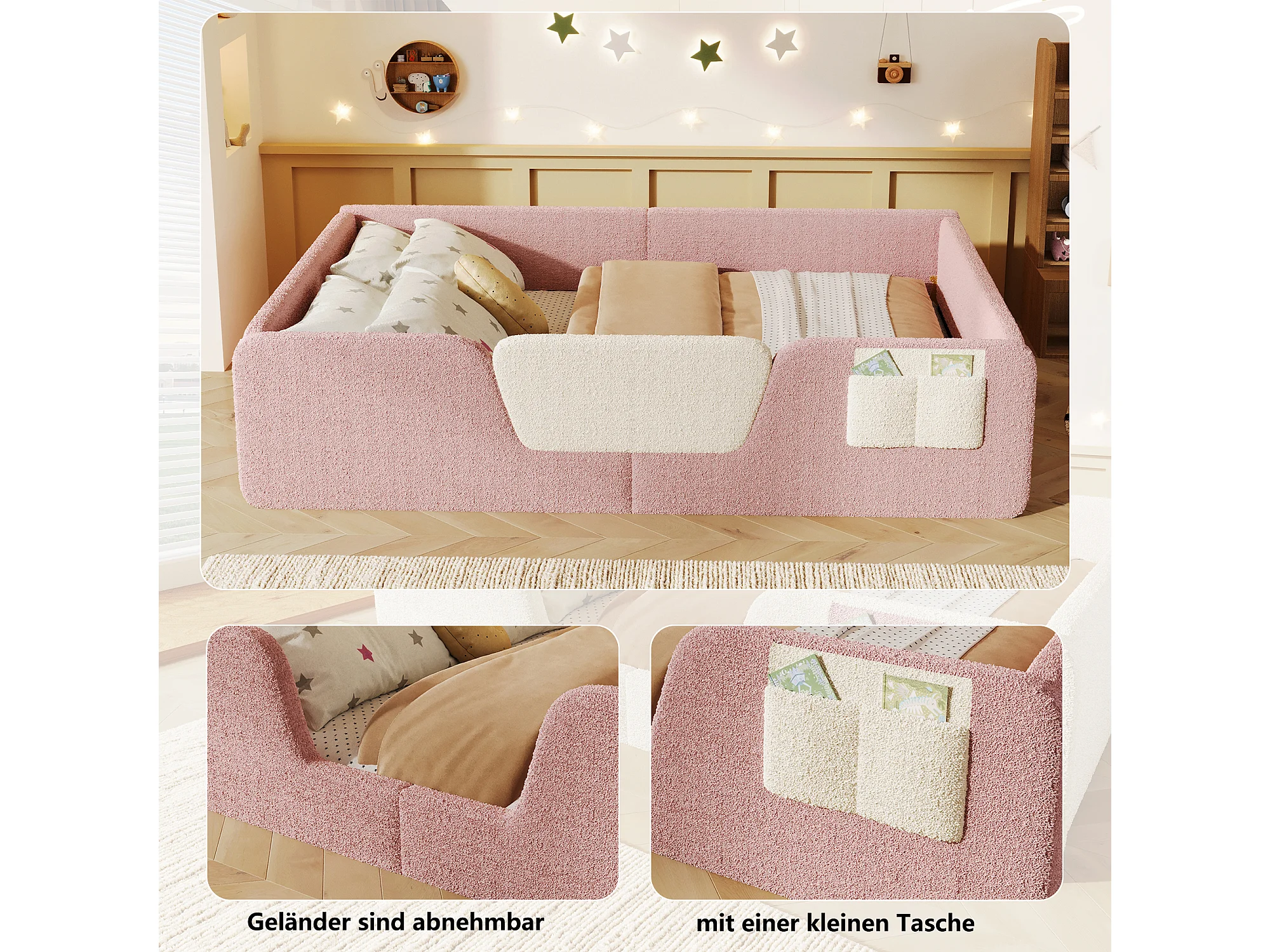 Lit capitonné pour enfant - 140 x 190 cm - avec barrières de sécurité amovibles + sac de rangement en tissu - velours - rose