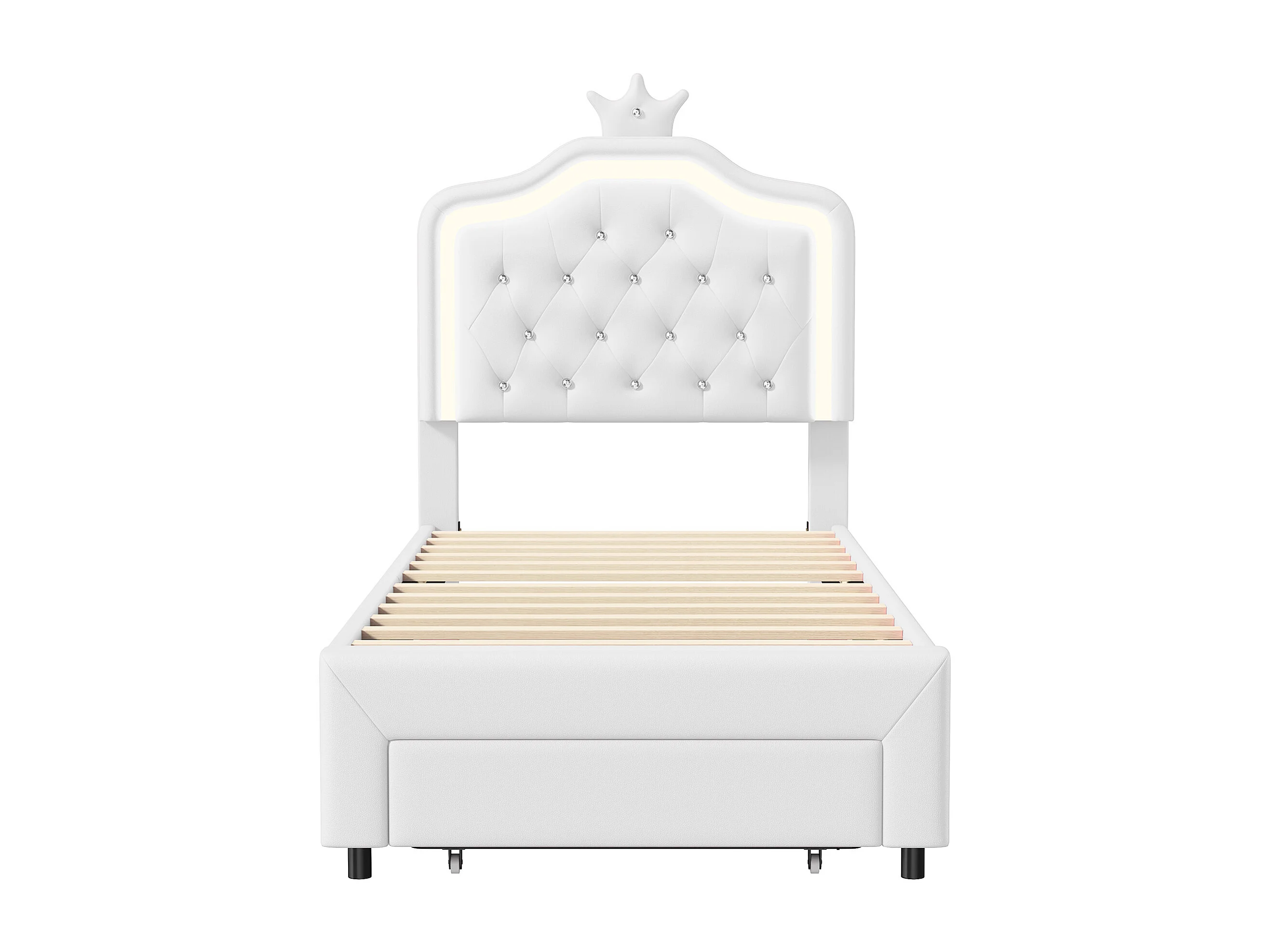 Lit capitonné princesse 90 x 200 cm - sommier à Lattes - lit enfant 90 X 200 cm avec tiroir et led - PU - Blanc