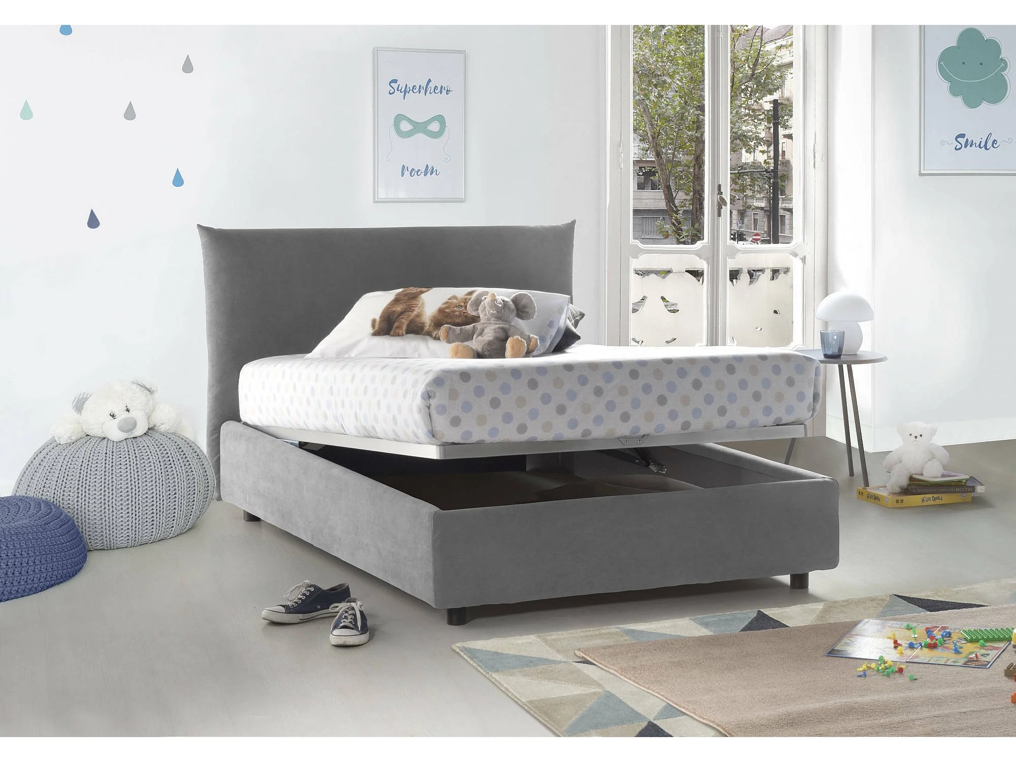 Lit double Creta, lit coffre avec revêtement en tissu, 100% Made in Italy, ouverture frontale, avec matelas 120x190 cm inclus, gris