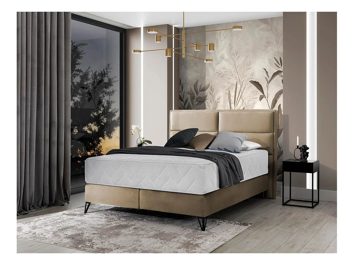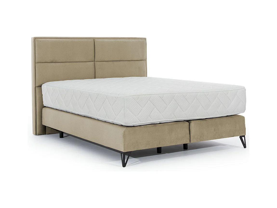 Lit continental tissu beige Tiempo avec matelas 30cm en latex et pied métal noir-140x200