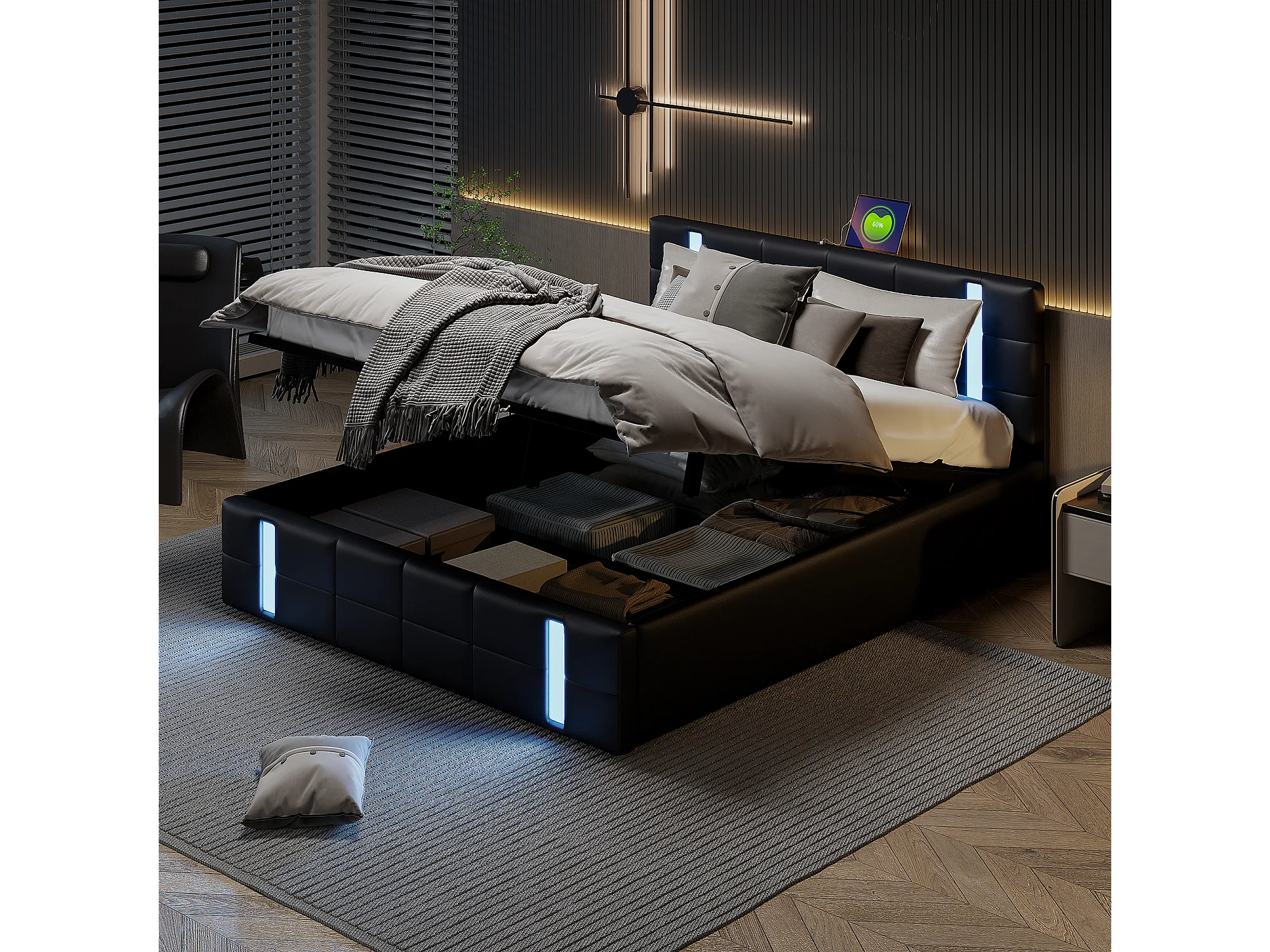 Lit coffre 140×200 cm avec LED, USB/Type-C et rangement – Hydraulique, PU