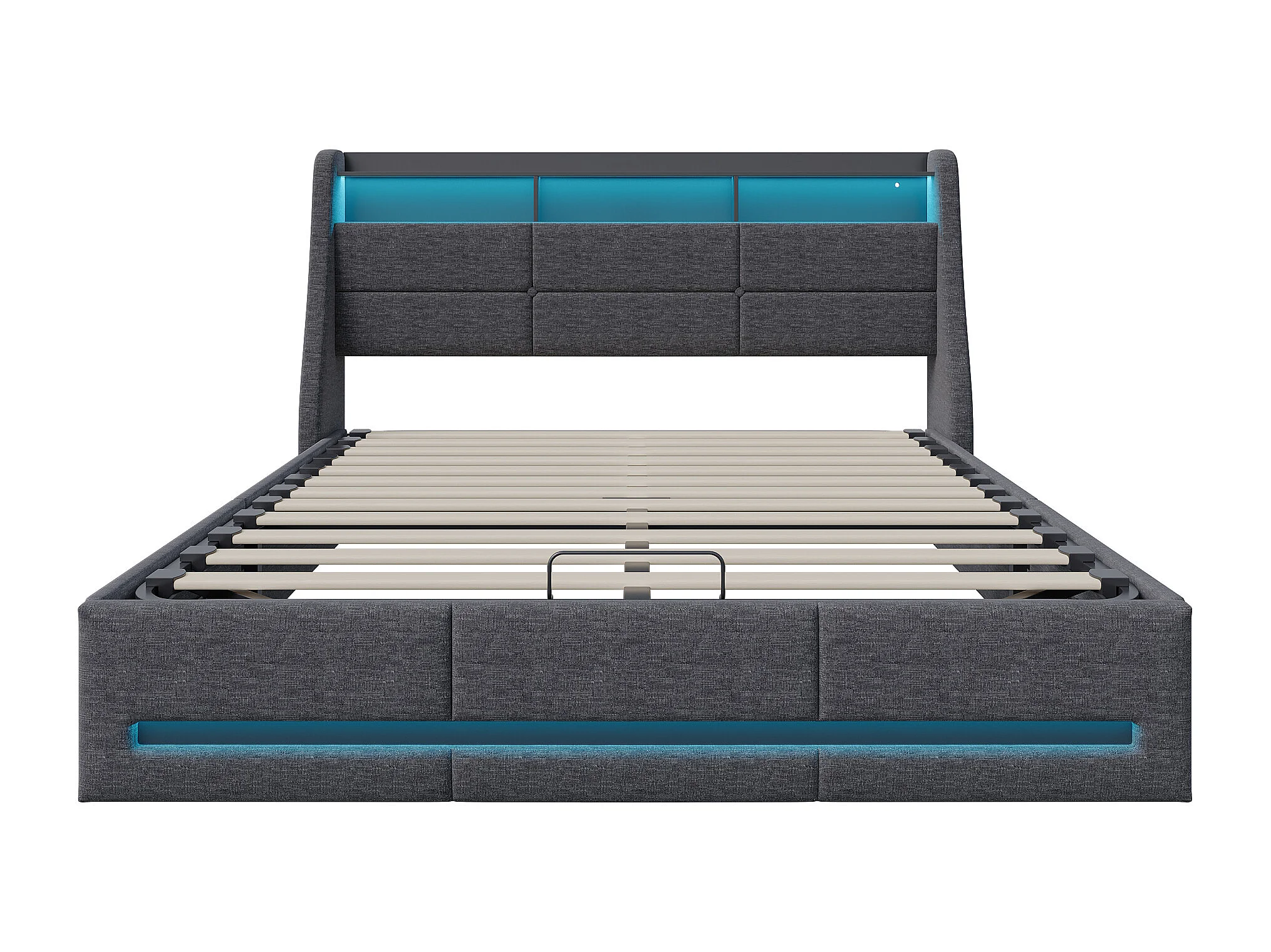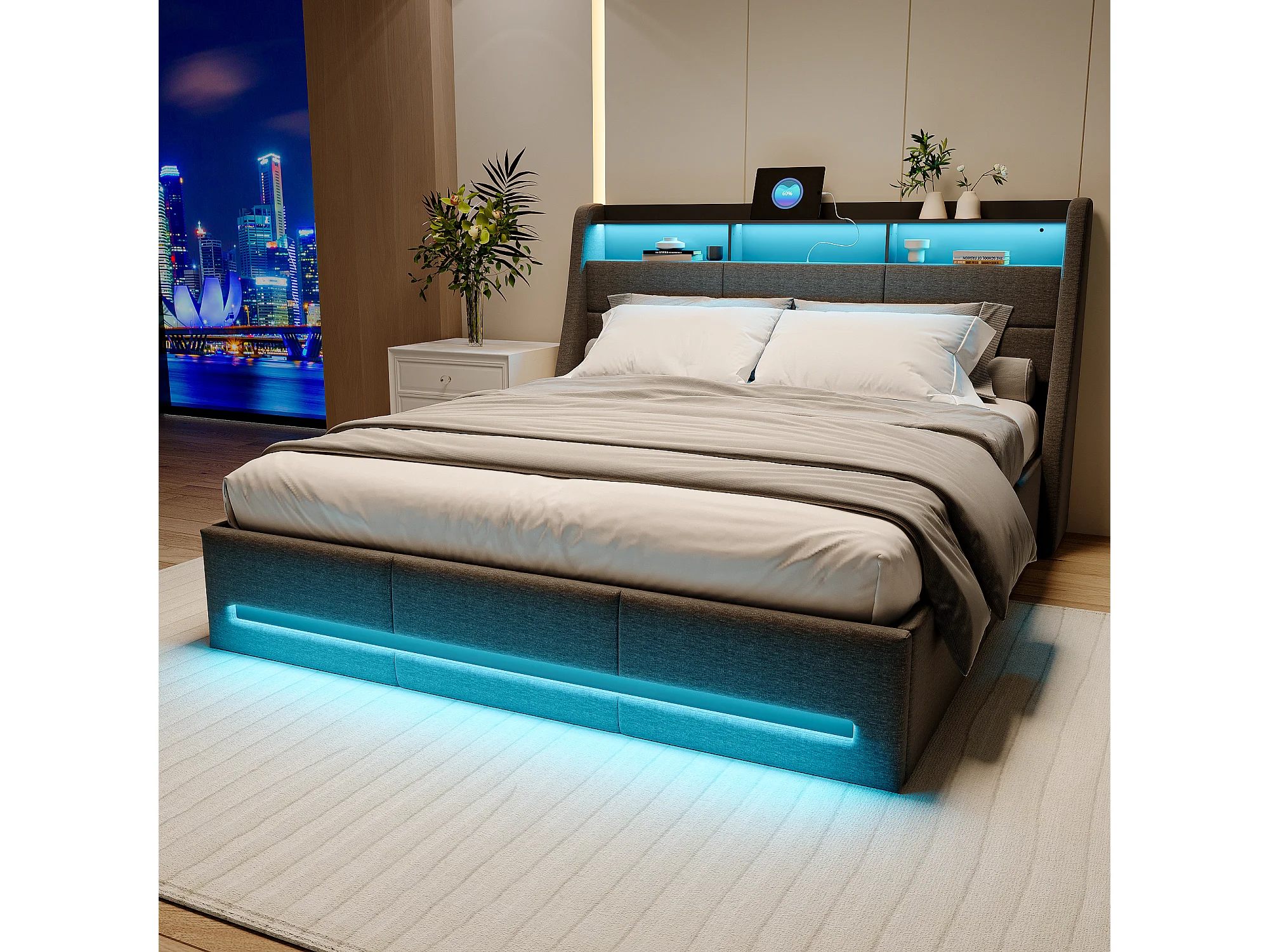 Lit coffre 140×200 cm avec LED, USB Type-C et sommier – Capitonné velours gris