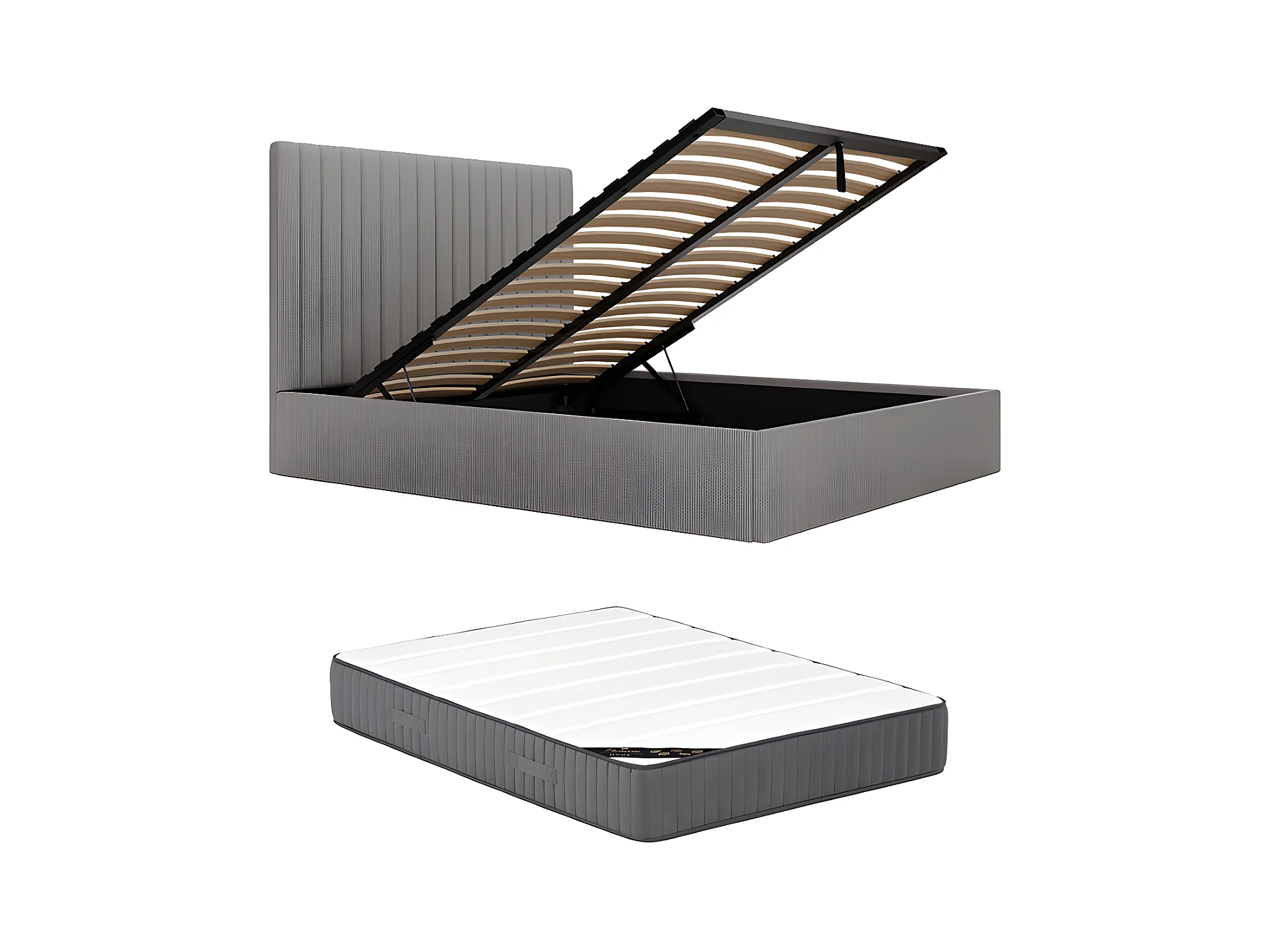 Lit coffre 140 x 190 cm avec tête de lit coutures verticales - Velours côtelé - Gris + Matelas - SARAH