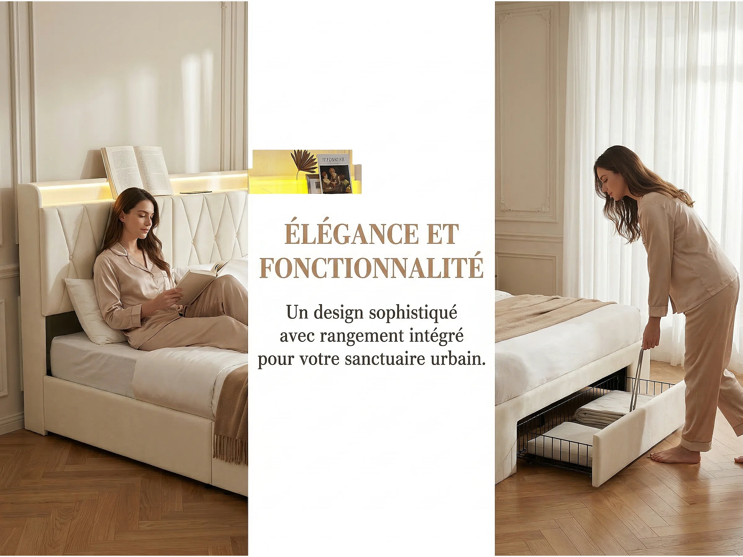 Lit coffre 140 x 190 cm avec tête de lit - Prises USB et LEDs - Cuir PU - Sommier à lattes - r(sans matelas)