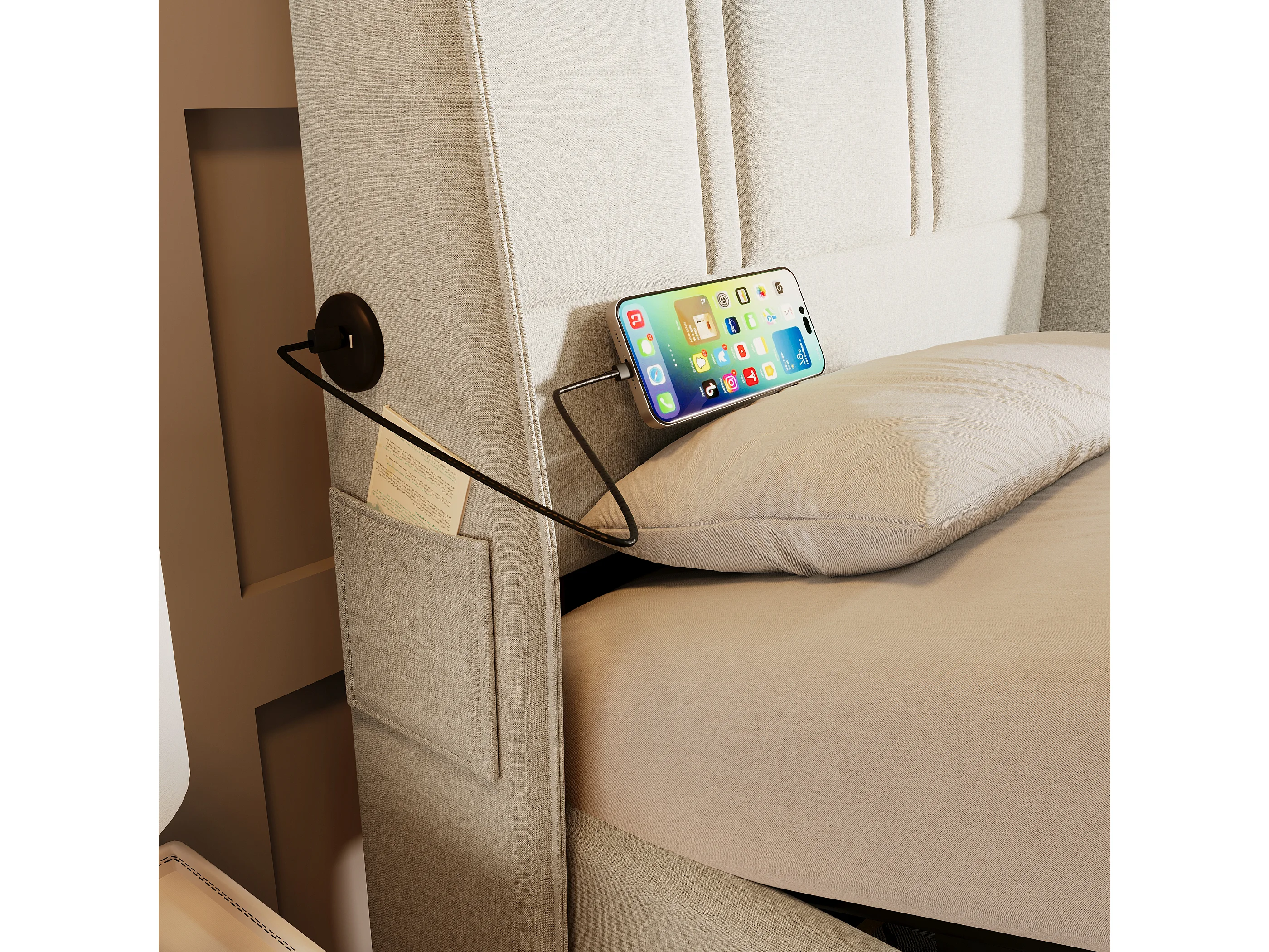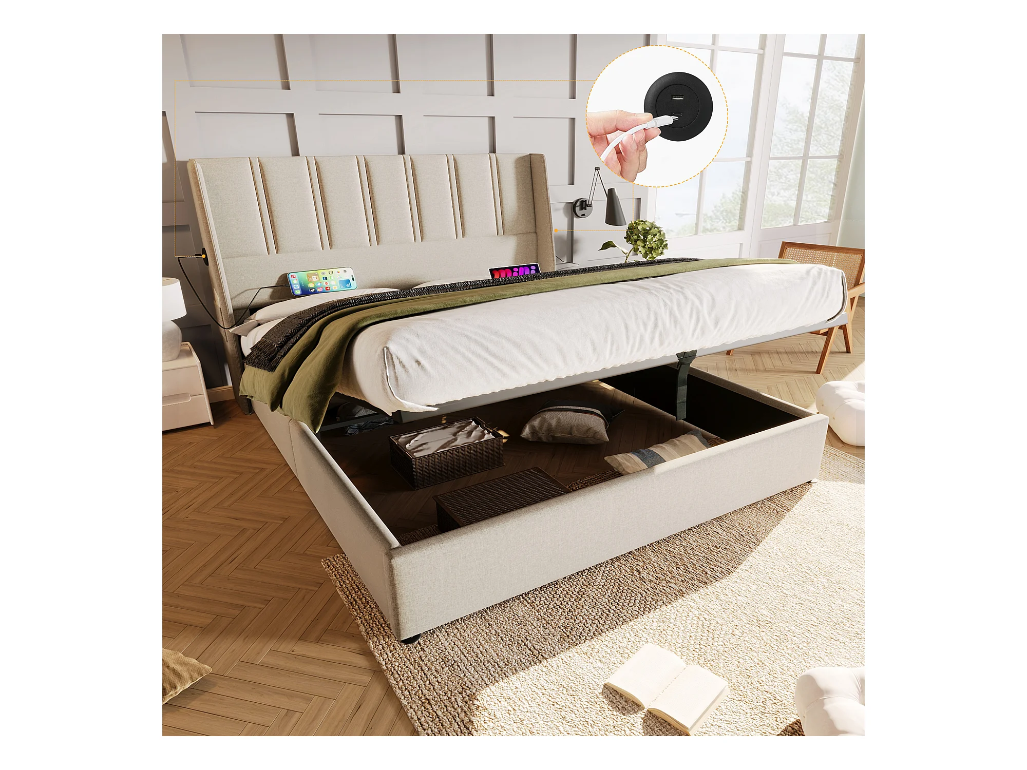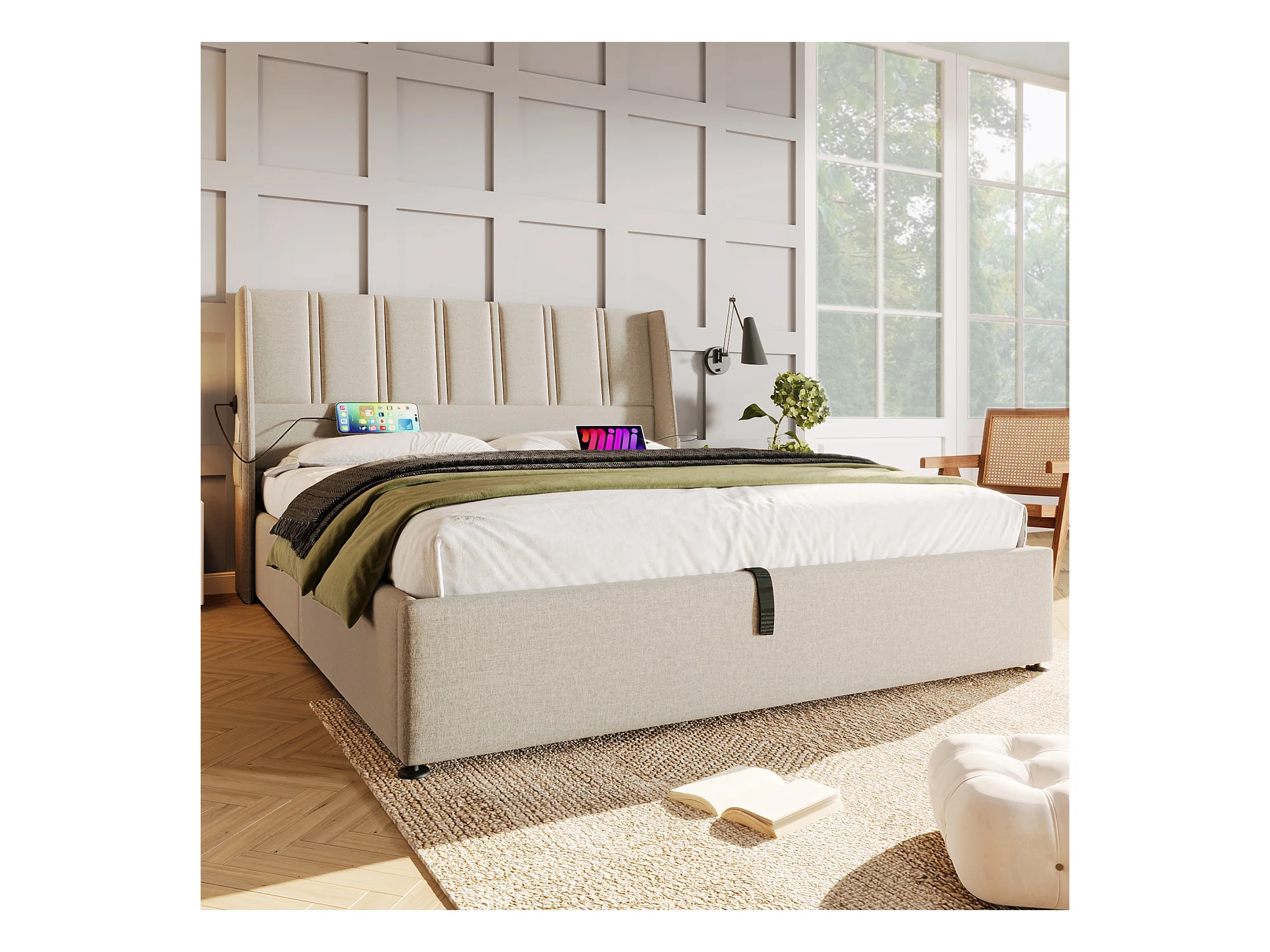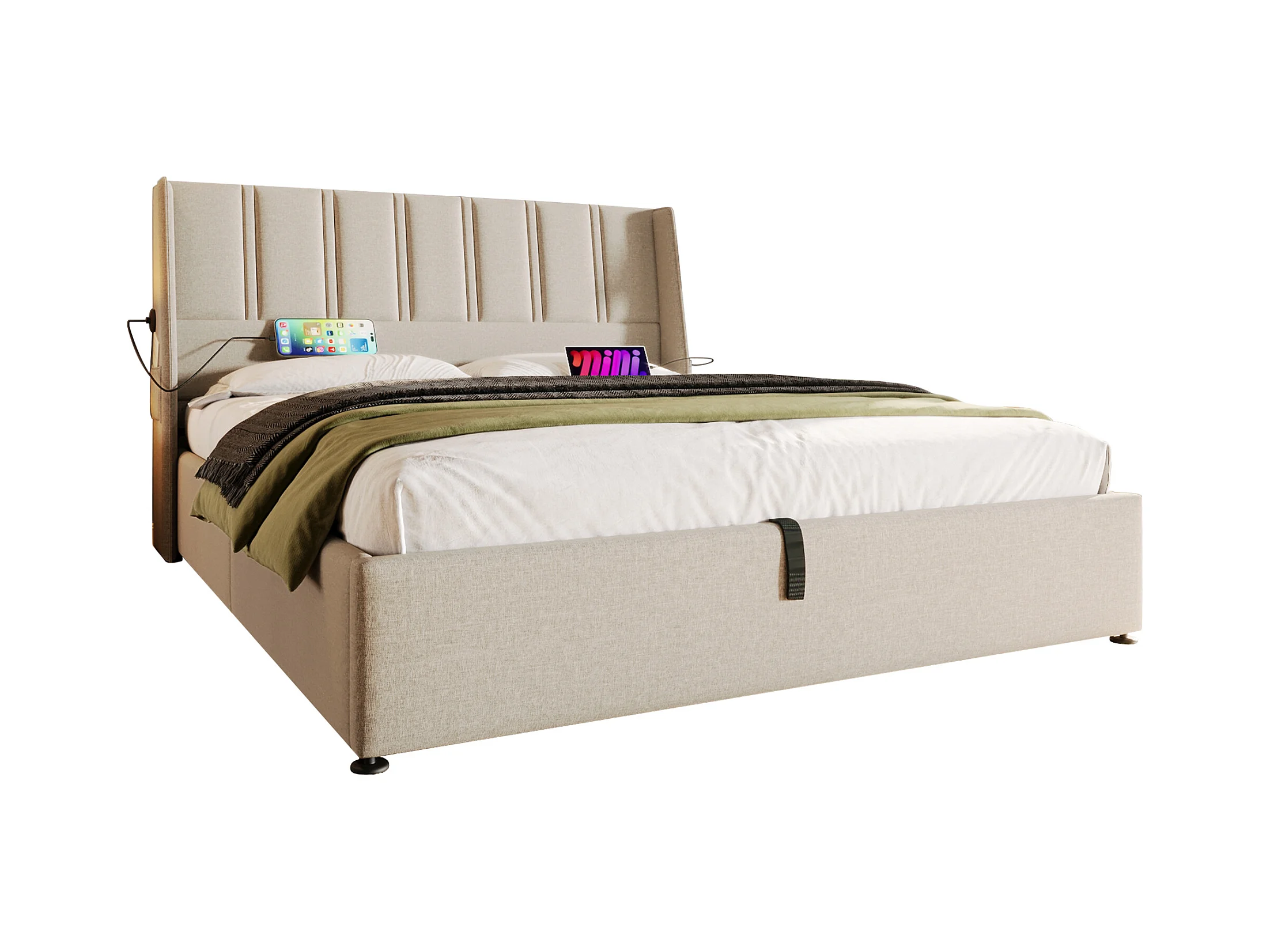 Lit coffre 140 x 200 cm avec tête de lit - Prises USB/Type-C - Tissu en lin - Beige (sans matelas)