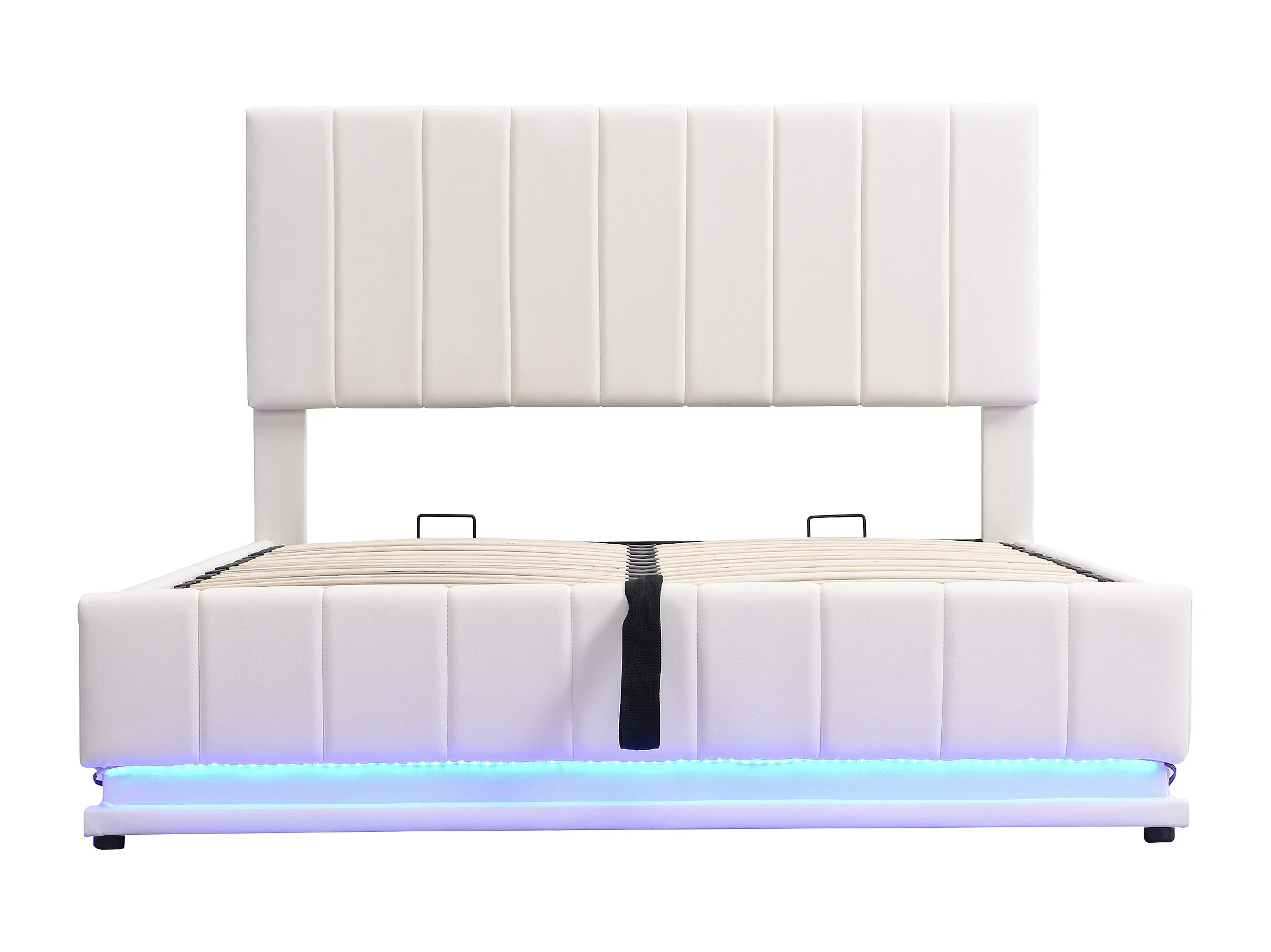 Lit coffre 140 x 200 cm, tissu en fond, LED, Tête de lit réglable, MDF+ métal+ PU blanc, sans matelas