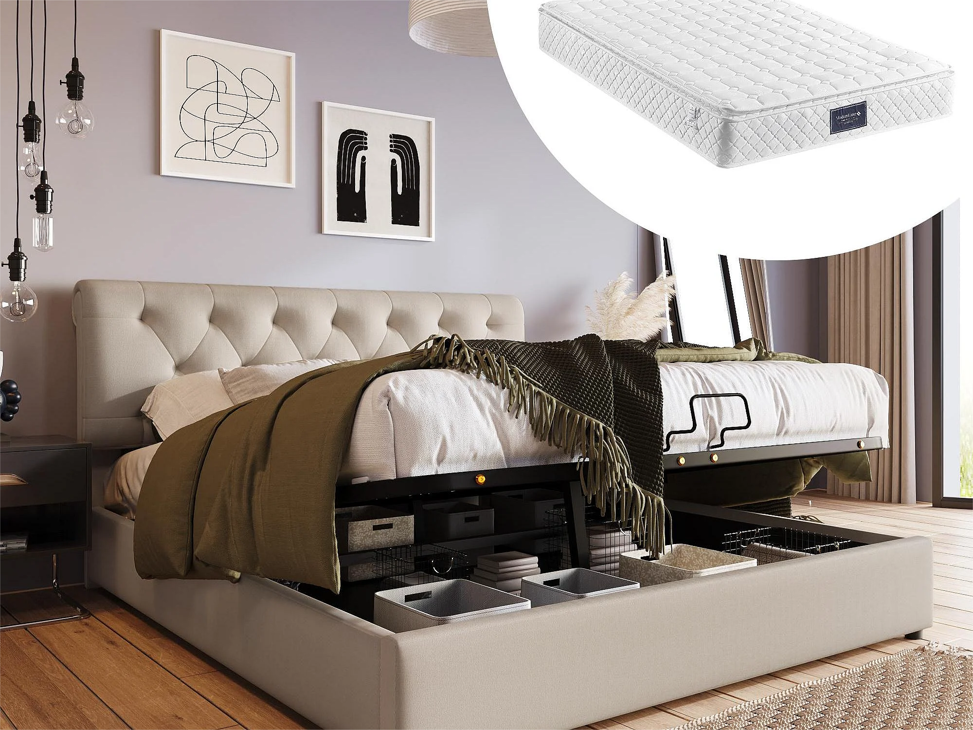 Lit coffre 140 x 200 cm - tissu lin - style contemprain - naturel + matelas