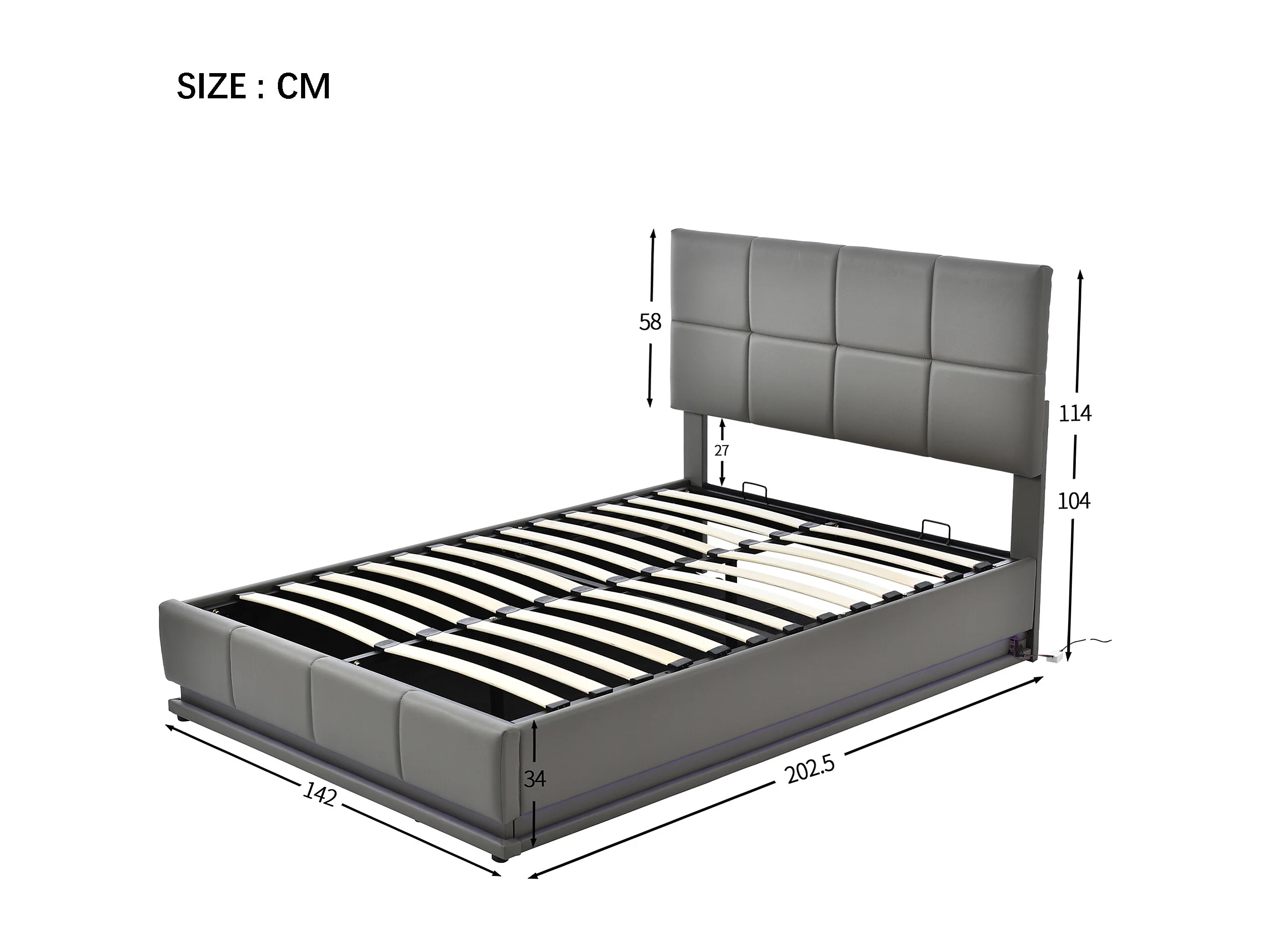 Lit coffre 140x190 avec LED, tête de lit réglable, lit 140x190 avec sommier à lattes, cadre de lit 140x190, lit capitonné en tissu PU 90x200 cm, gris
