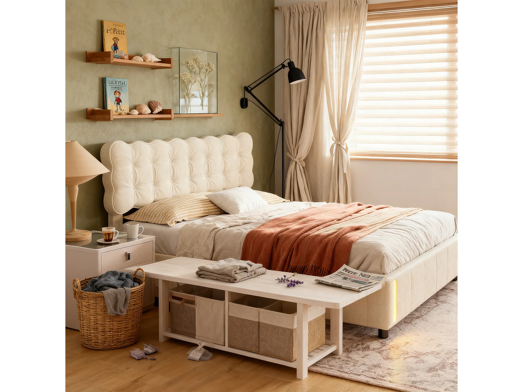 Lit coffre 140x190 avec sommier à lattes, lit 140x190 avec LED à détection de mouvement, cadre de lit adulte 140x190, tissu en velours, beige