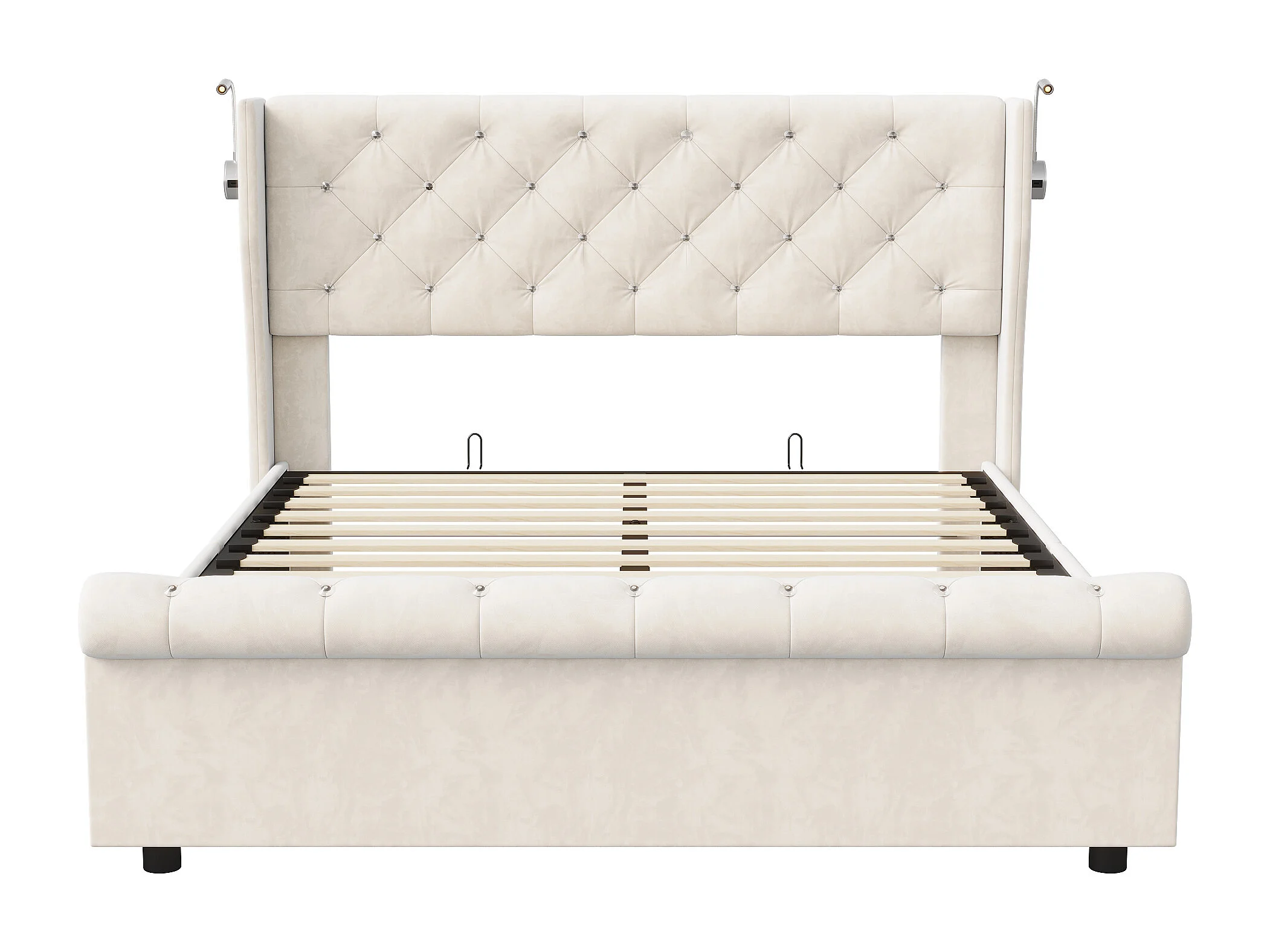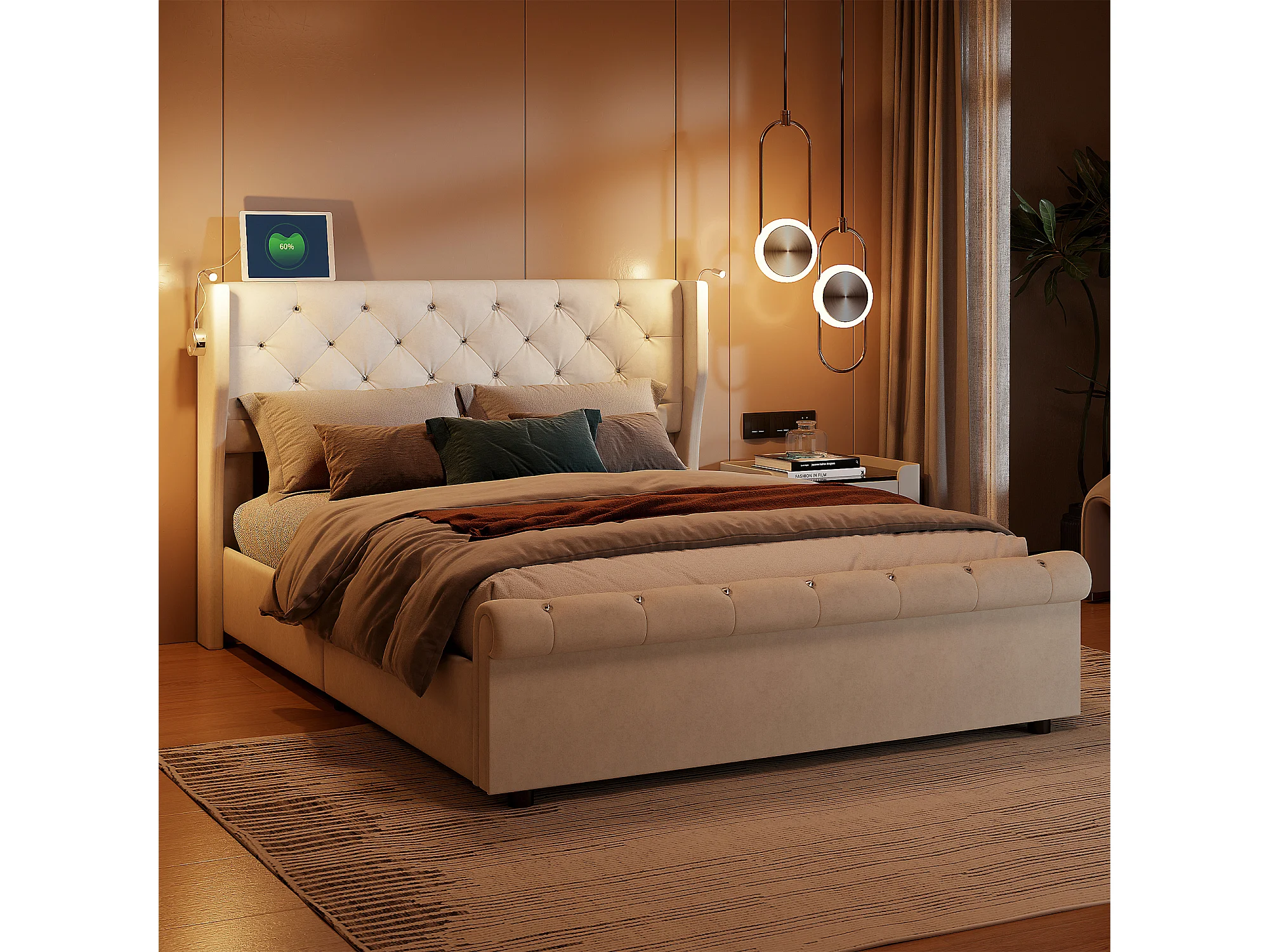 Lit Coffre 140x190 cm avec LED et Ports USB,Lit Double à Rangement hydraulique, 140x190 sommier à Lattes, Design Moderne pour Adultes et Adolescents, Beige