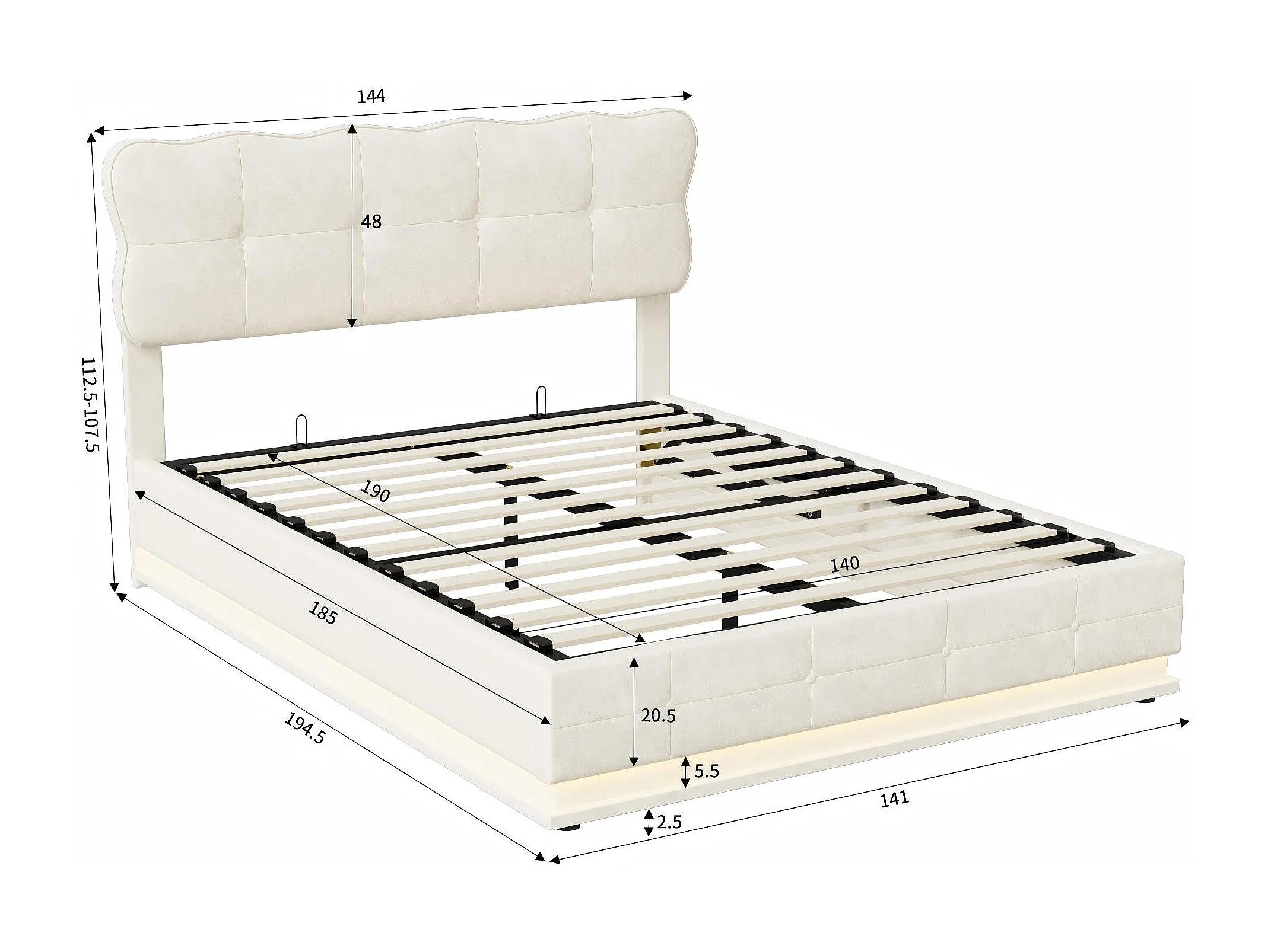 Lit coffre 140x190 cm avec LED RGB, lit capitonné velours beige, sommier relevable, grand rangement, design moderne