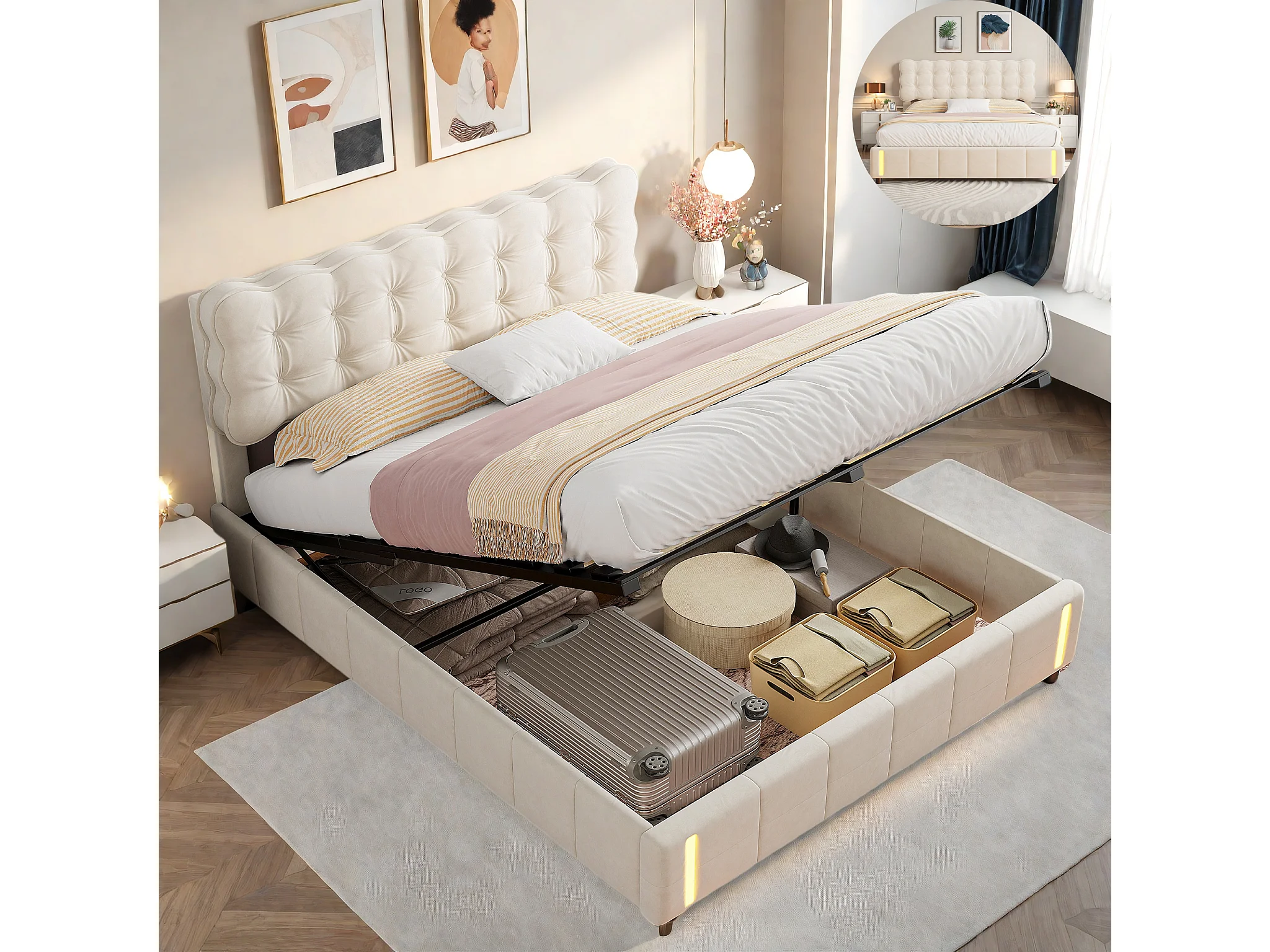 Lit Coffre 140x190 cm - Velours - Lumière LED à capteur Automatique - Lit Capitonné Double avec Rangement - Fonction hydraulique pour Adulte Jeunesse