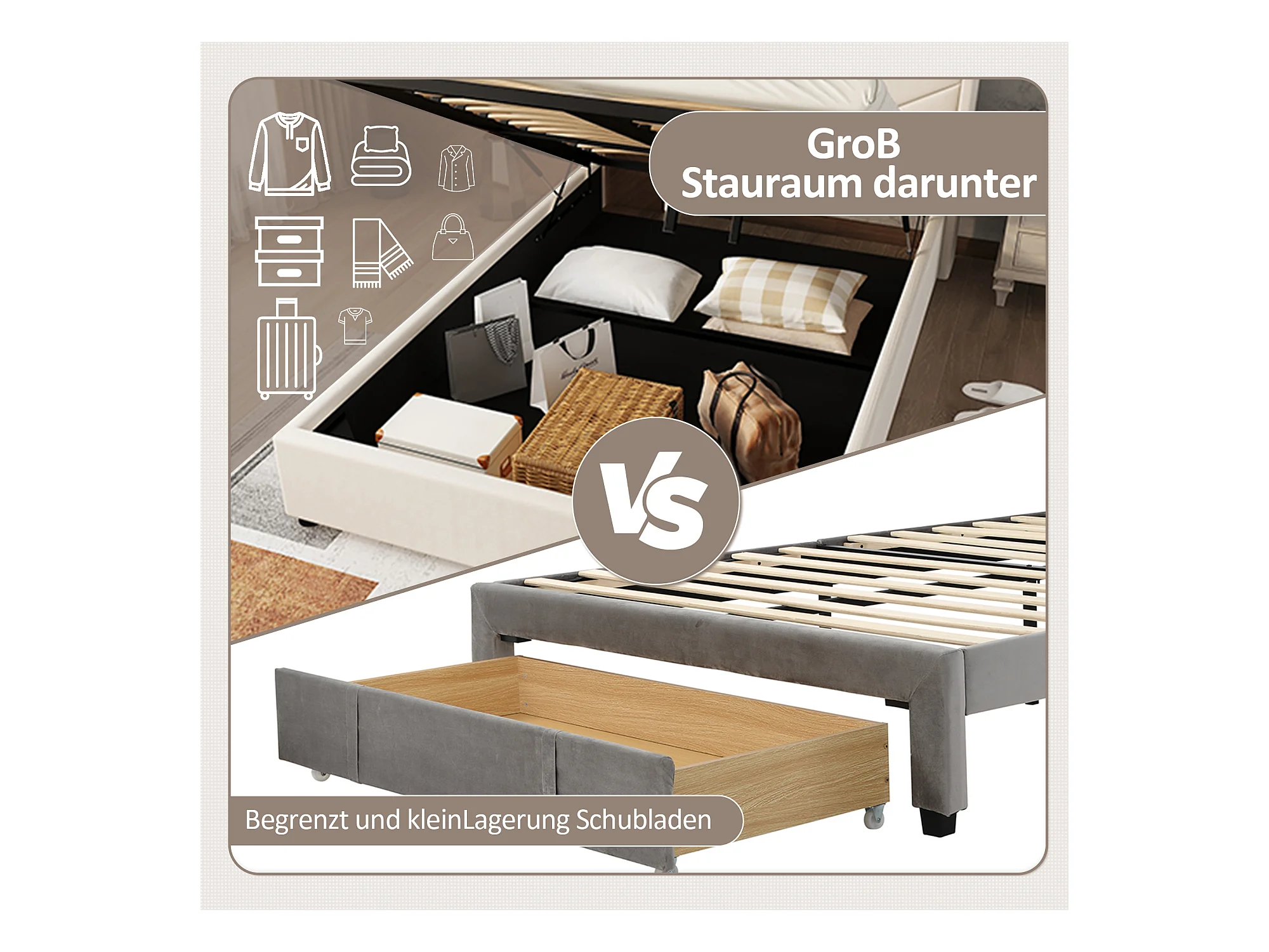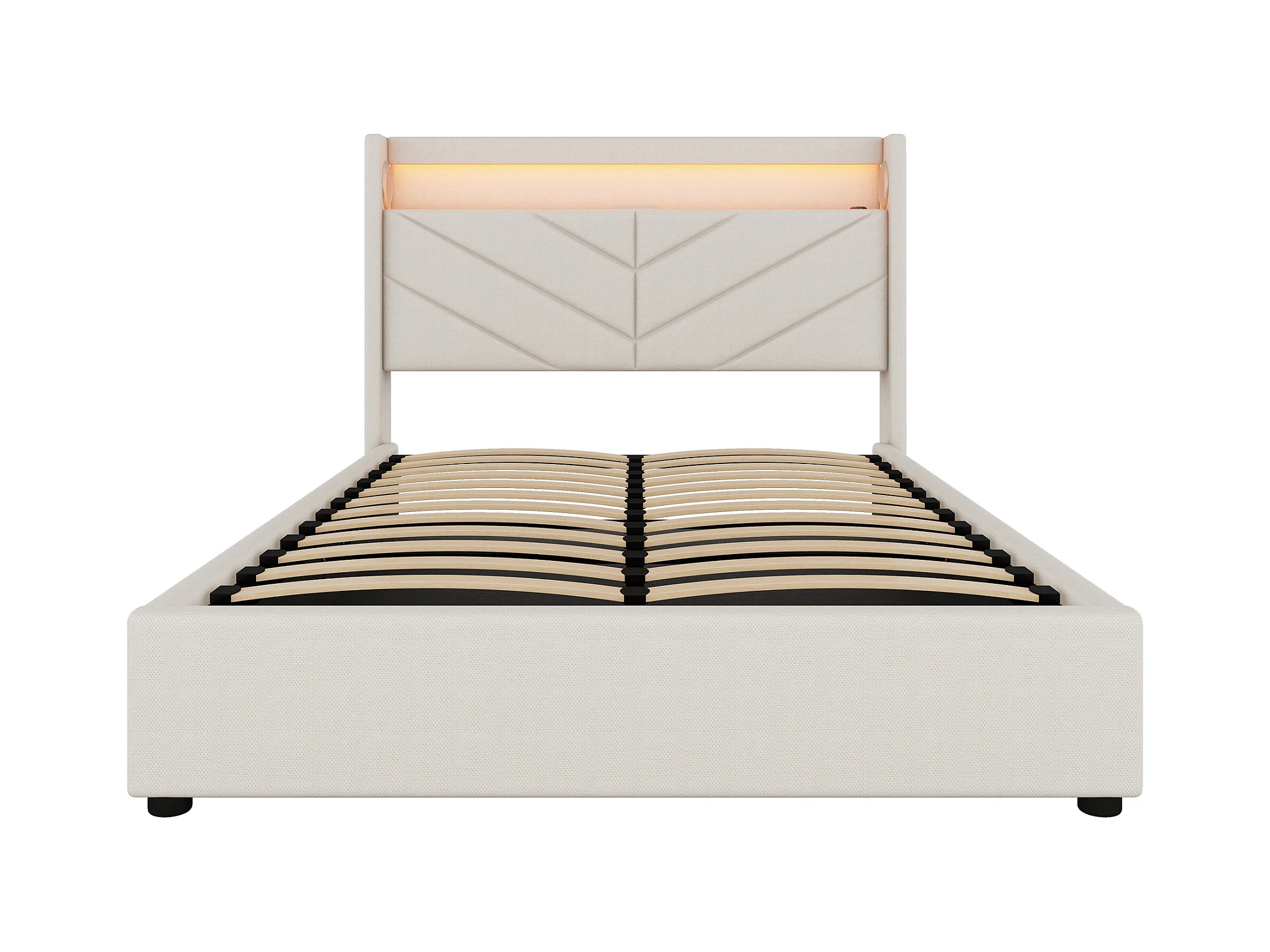 Lit coffre 140x190 cm en lin avec LED, stéréo, USB et rangement hydraulique, beige
