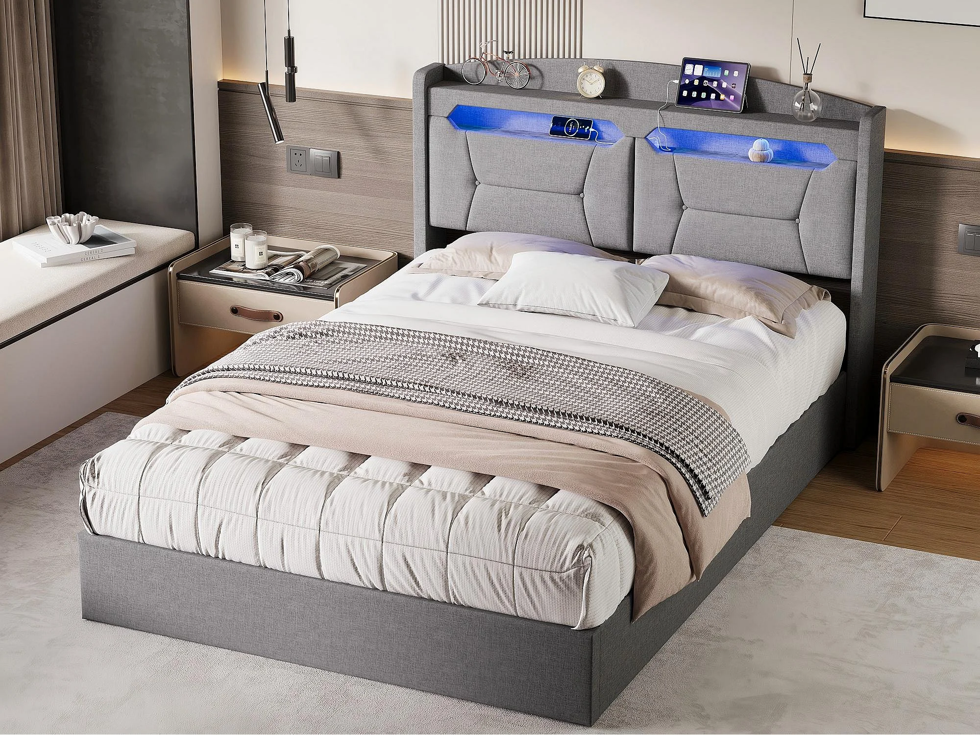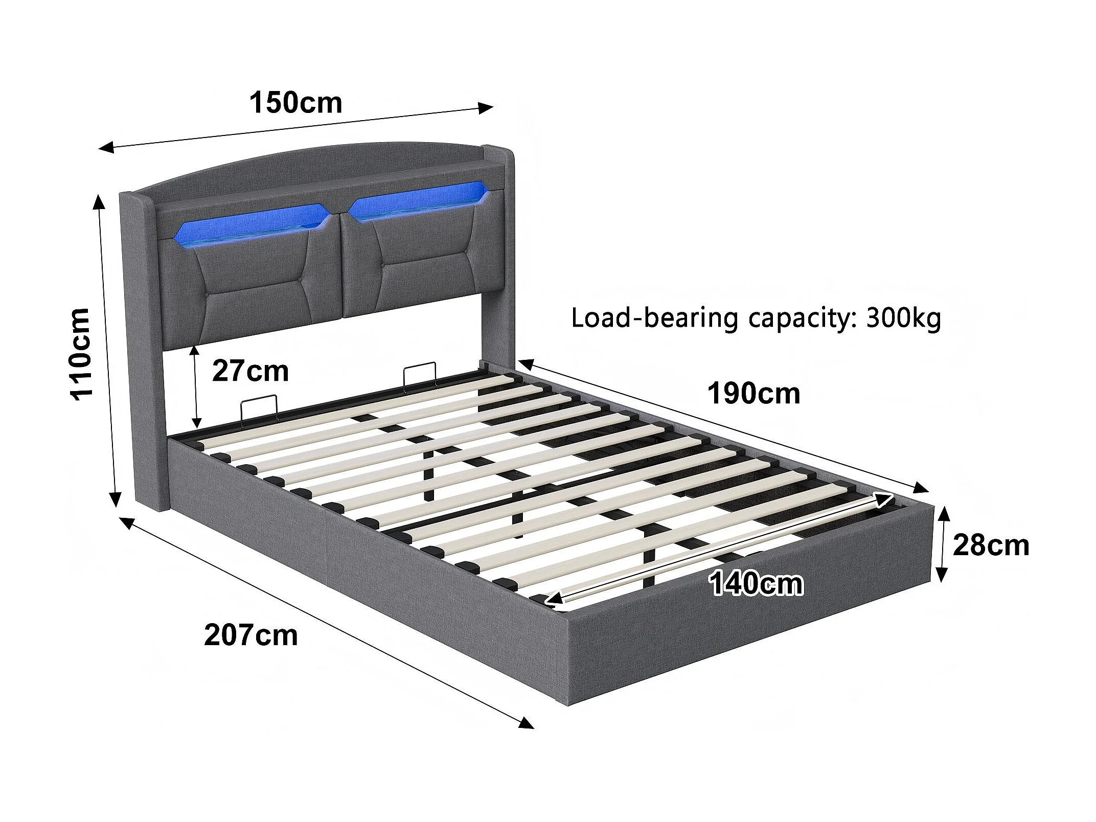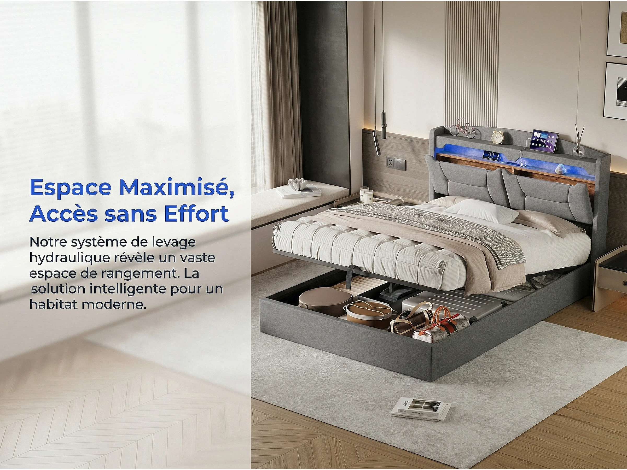 Lit Coffre 140x190 cm LED RGB avec USB, Tête de Lit avec Rangement, Lit Hydraulique en Tissu Gris, Sommier à Lattes