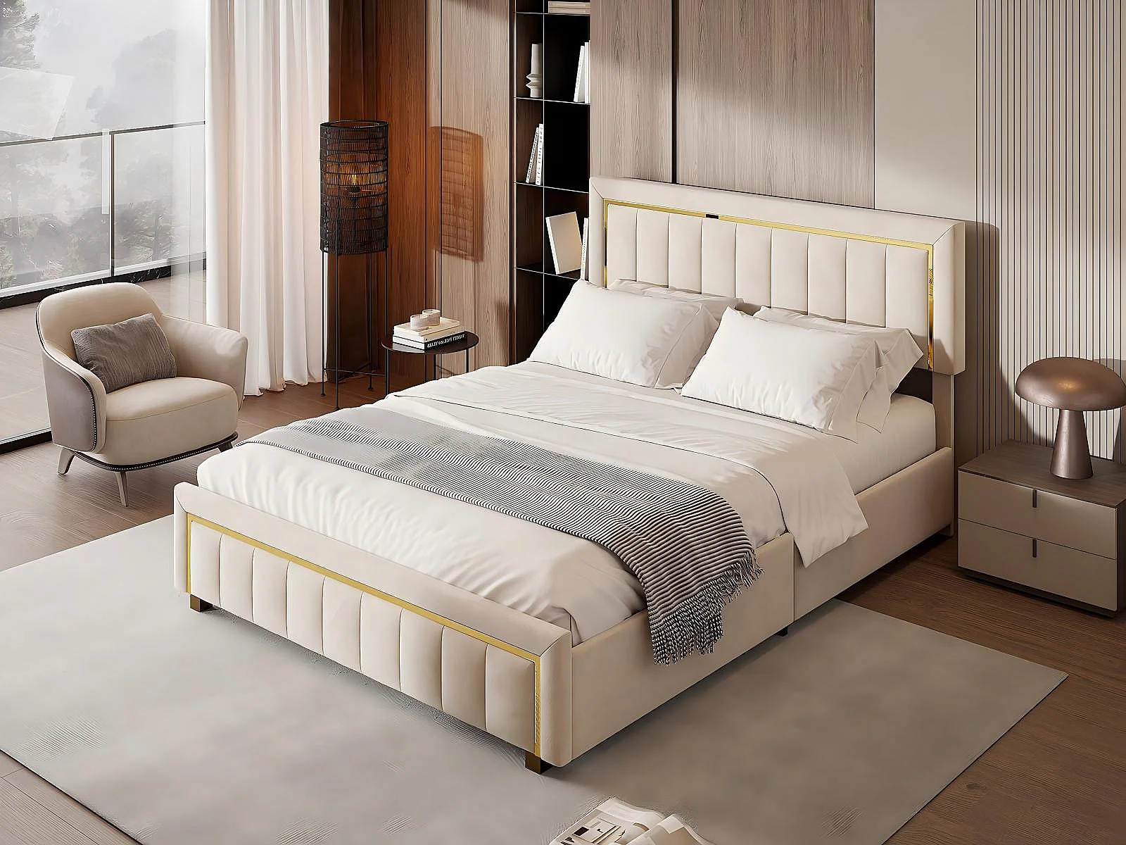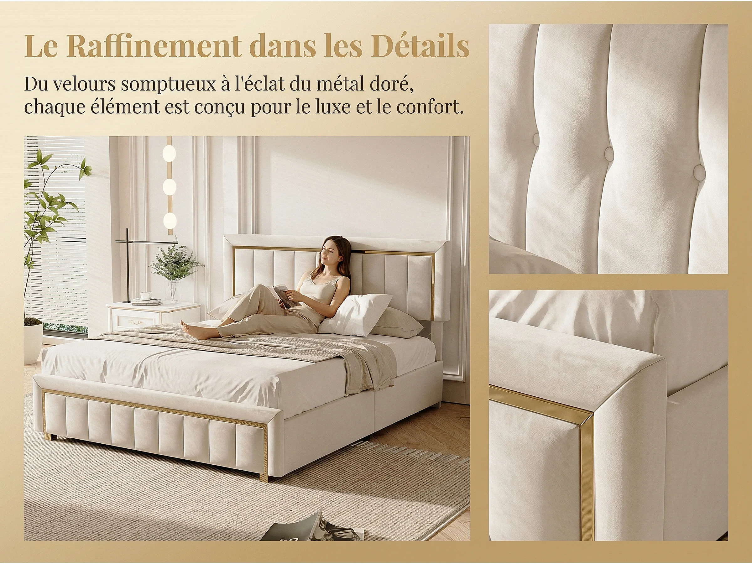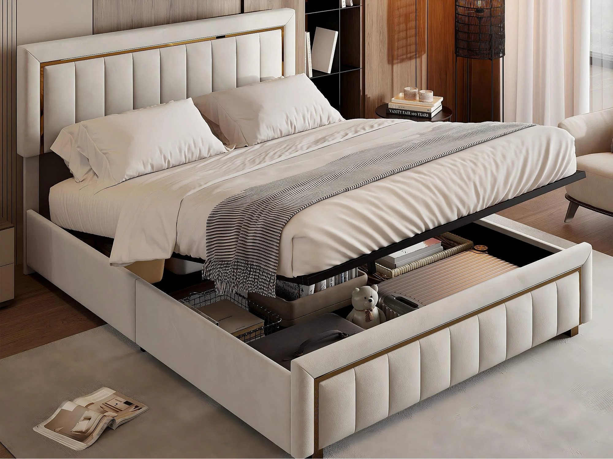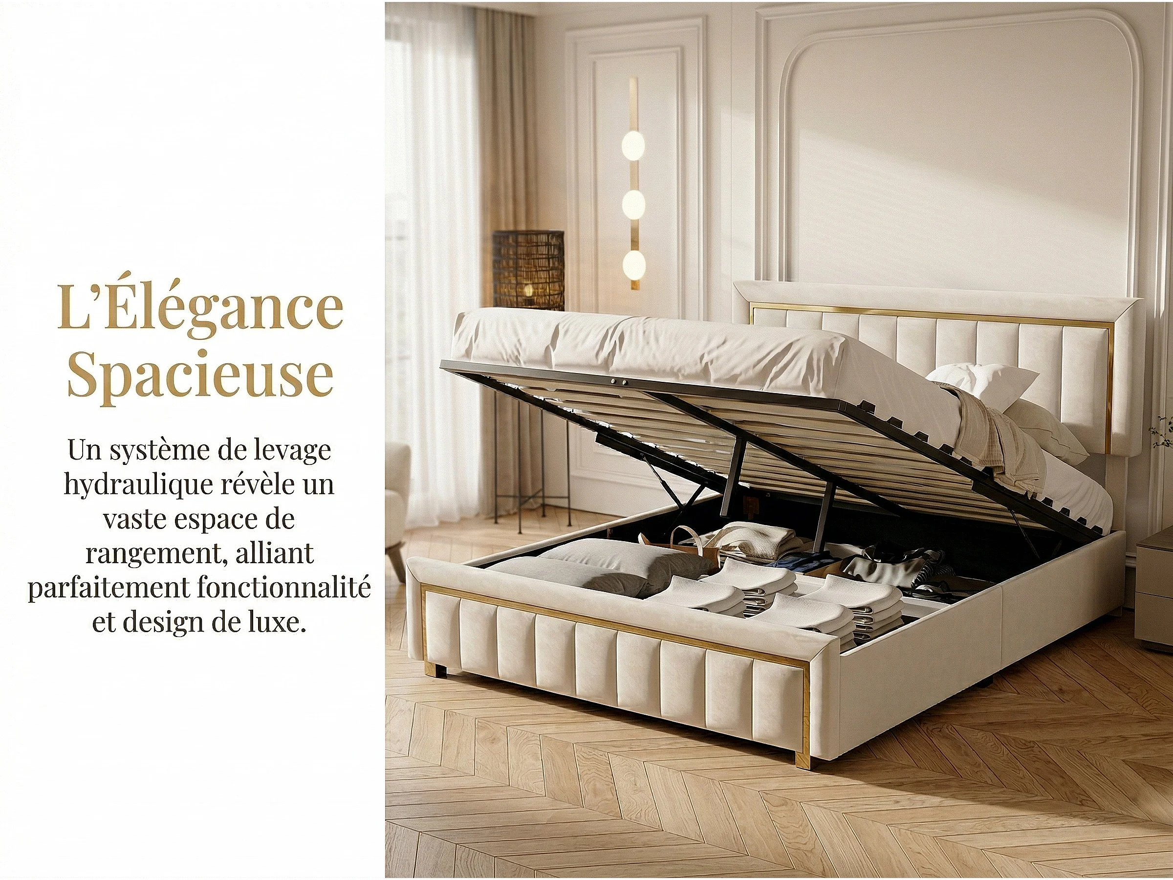 Lit coffre 140x190 cm velours, lit capitonné avec rangement hydraulique et finition dorée, cadre de lit avec sommier à lattes