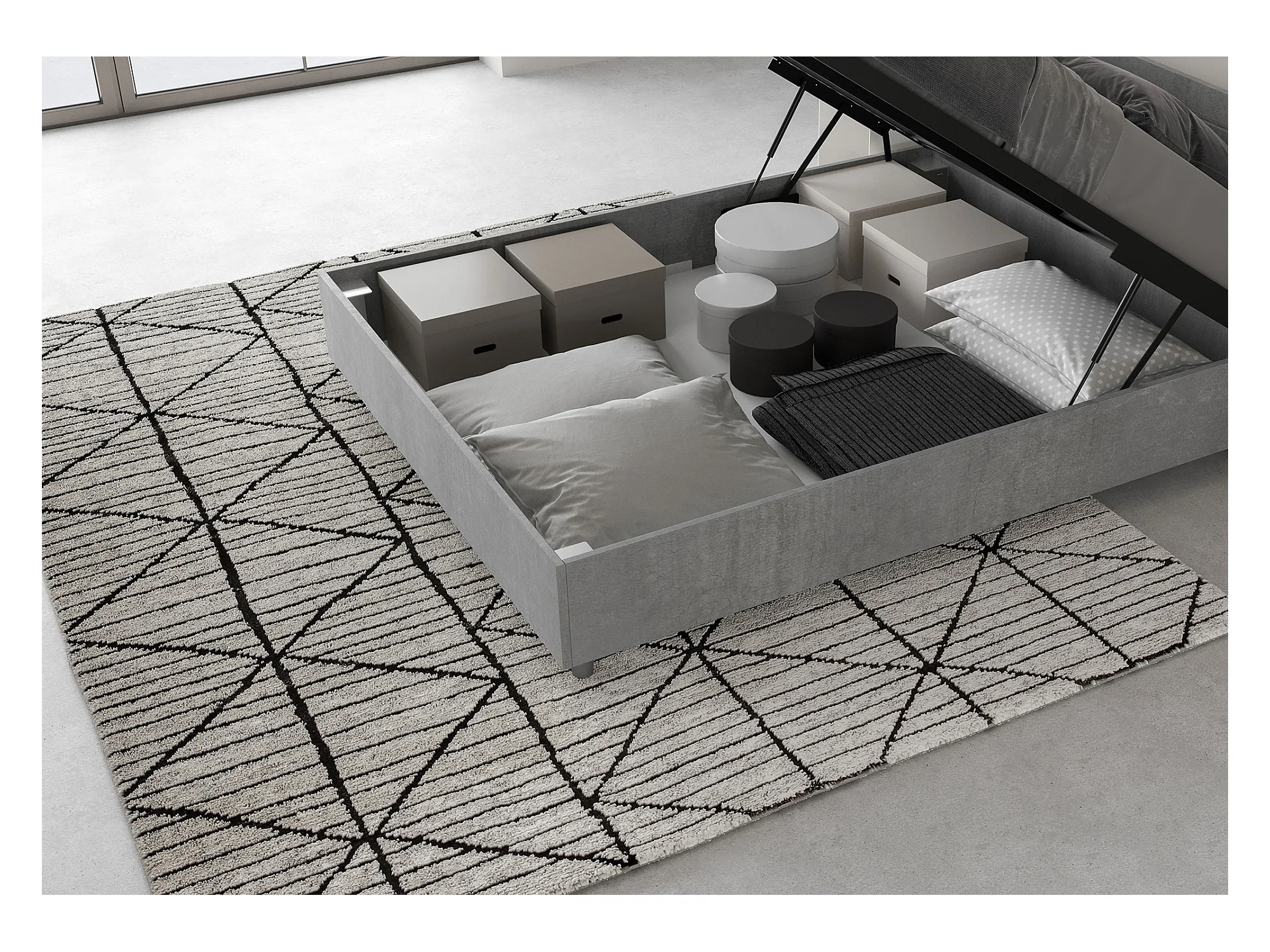 Lit coffre 140x190 tête de lit inclinée gris béton Demas