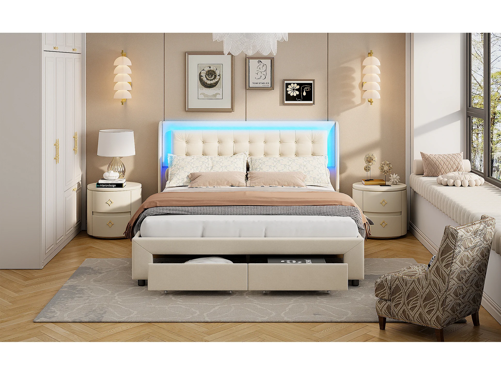 Lit coffre 140x190cm avec 2 tiroirs et lumière LED,Lit Double avec espace de stockage hydraulique et sommier à lattes,Velours,Beige