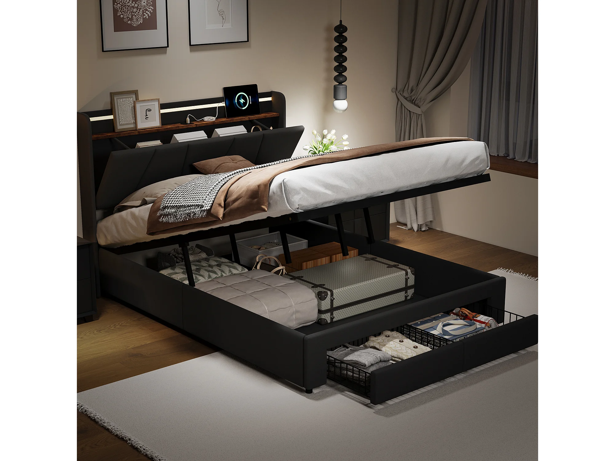 Lit coffre 140x200 cm -2 tiroirs - Lit double rembourré - LED et USB & Type-C - Sommier à lattes - Lin - Gris foncé