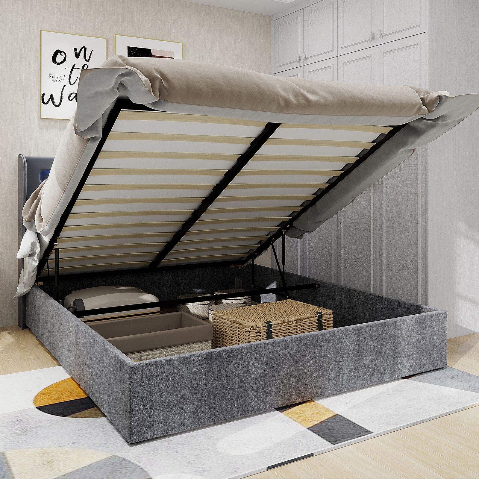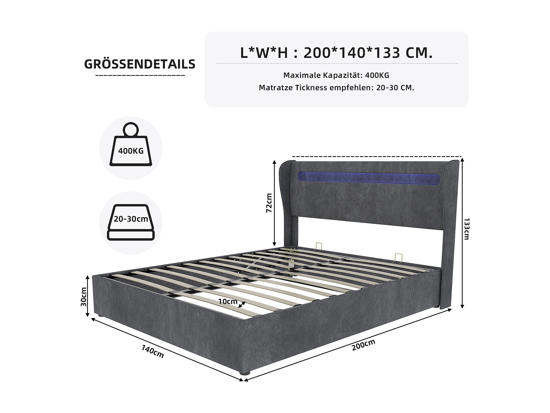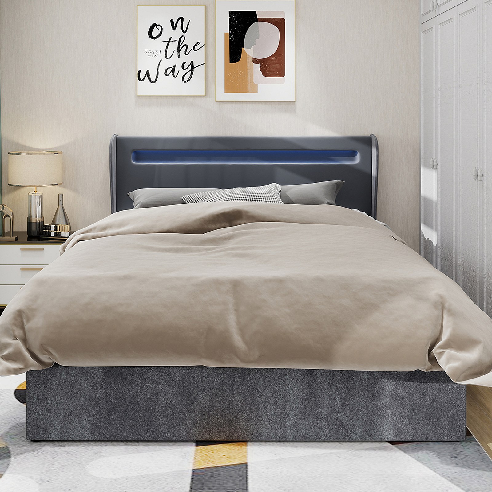Lit coffre 140x200 cm avec éclairage LED, sommier à lattes en bois - velours gris (sans matelas)