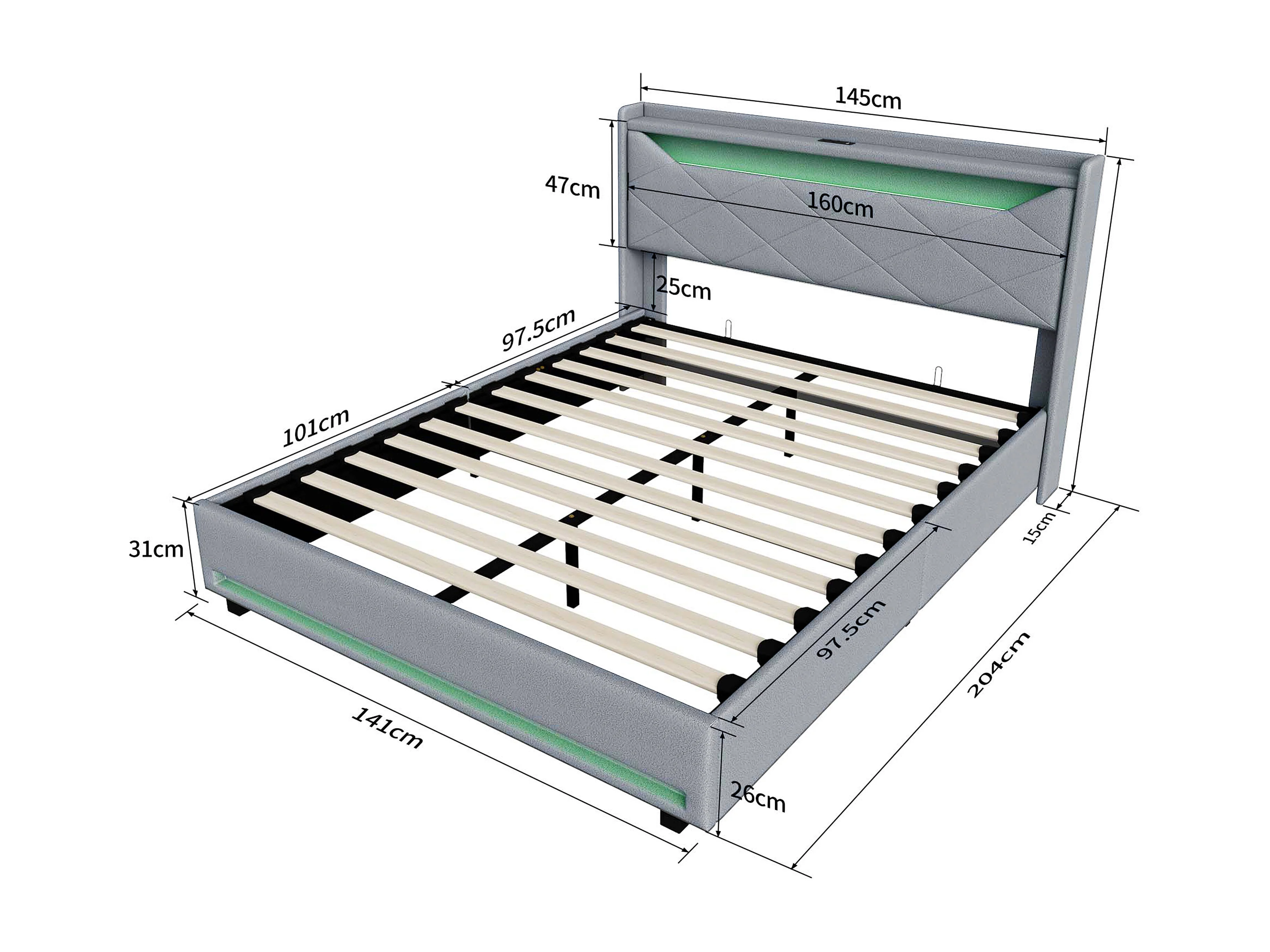 Lit coffre 140x200 cm avec espace de rangement hydraulique - tête de lit avec LED et port USB - lin - gris