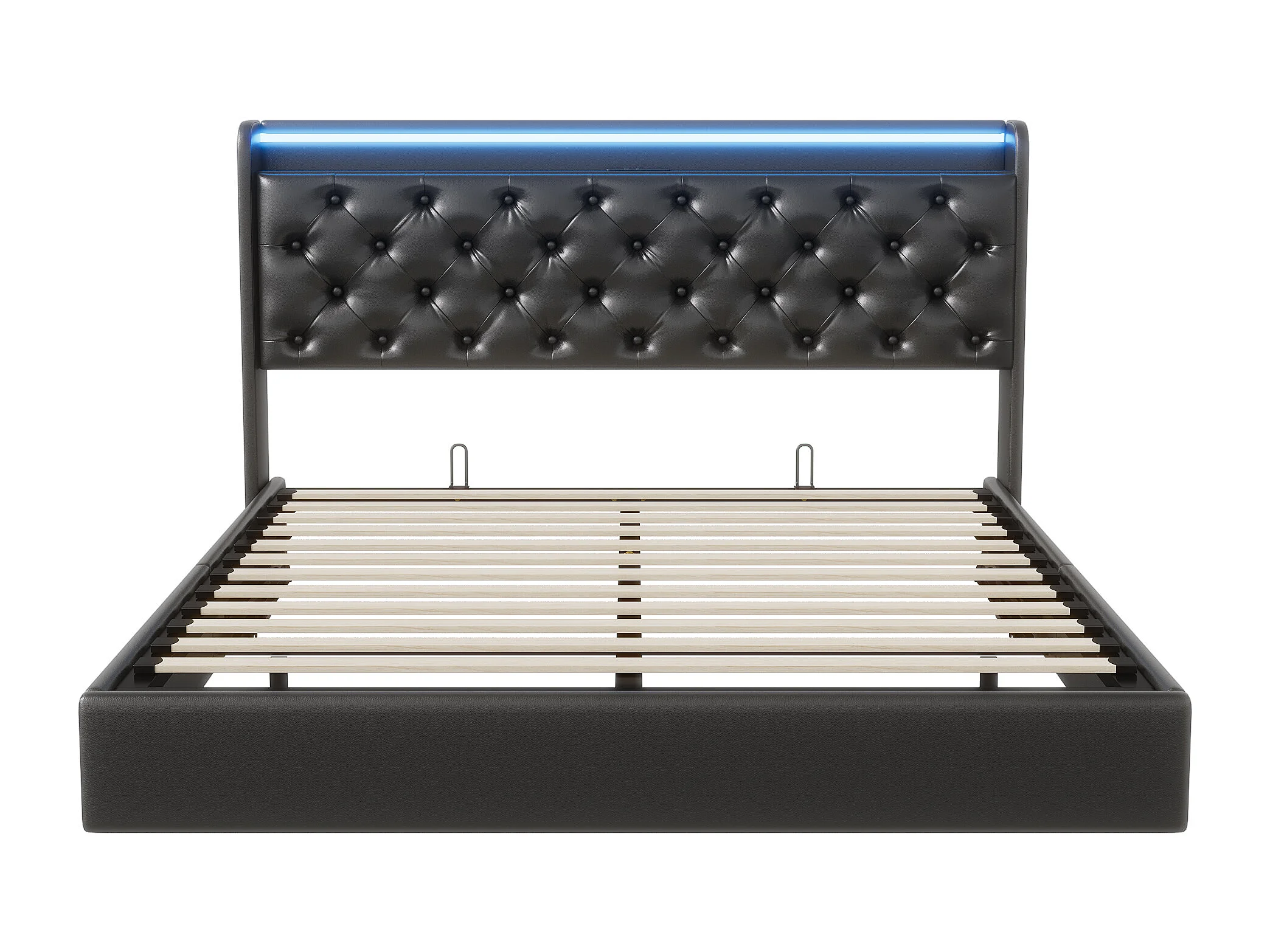 Lit Coffre 140x200 cm avec LED et Port USB, Lits 2 Personnes avec sommier à Lattes, PU, Noir