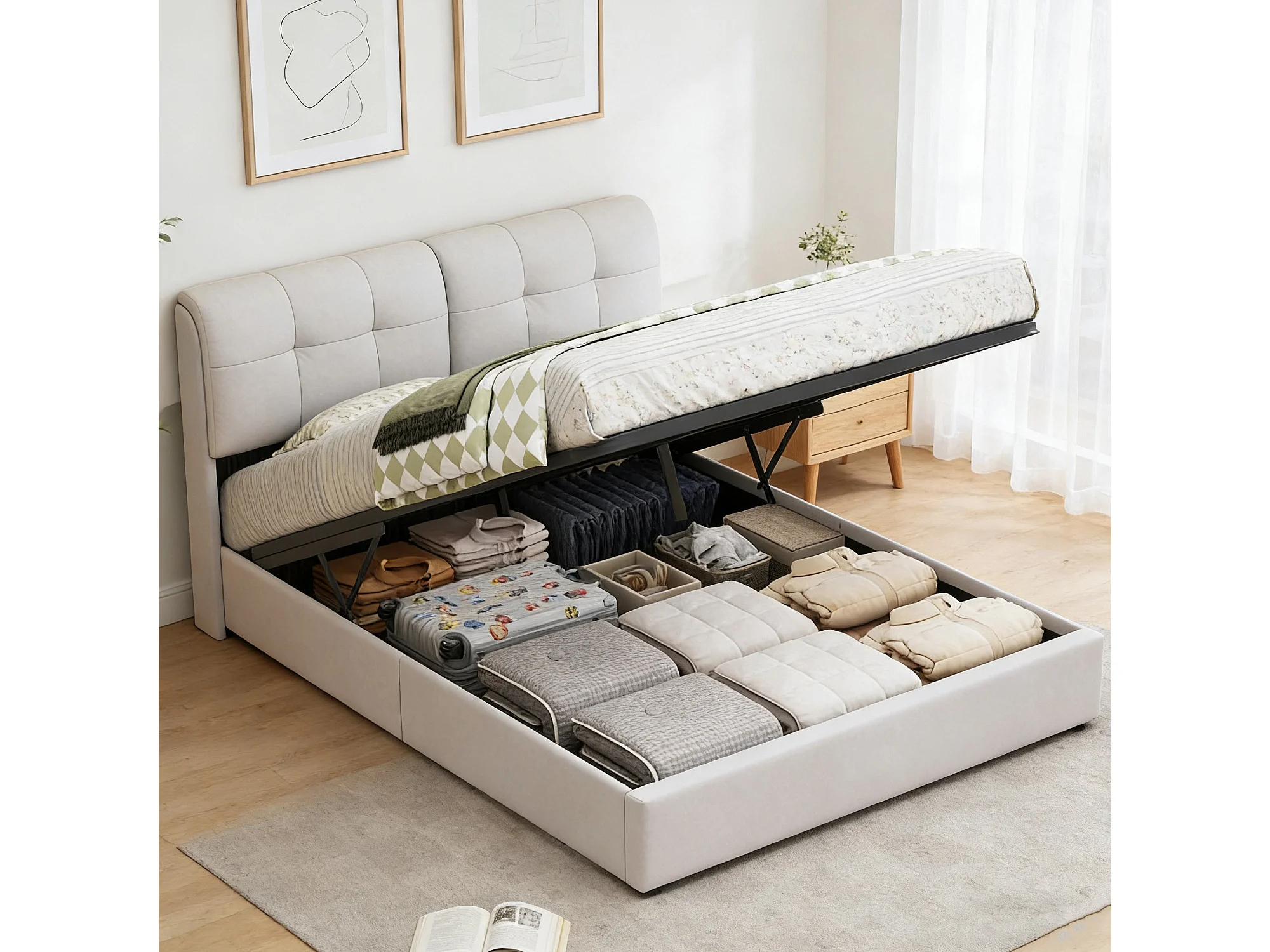 Lit coffre 140x200 cm avec LED, lit adulte avec sommier à latte, lit double 140x200 tissu velours, style cream et scandinave, blanc cassé