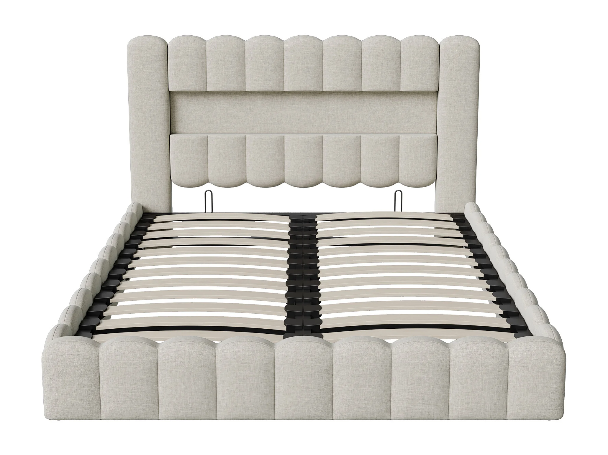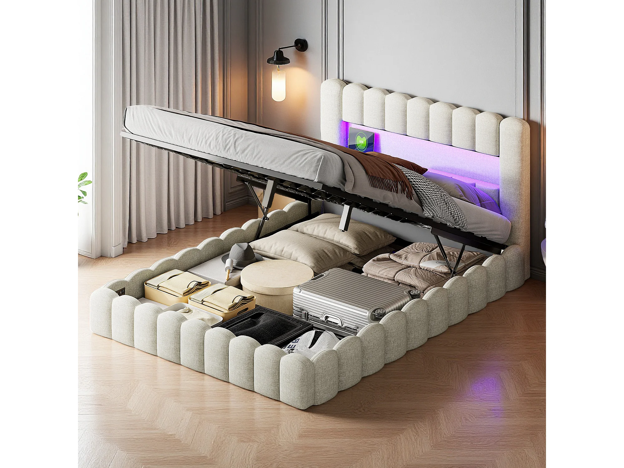 Lit coffre 140x200 cm avec sommier à lattes - cadre de lit adulte 140x200 cm avec LED et USB - tissu en lin - beige