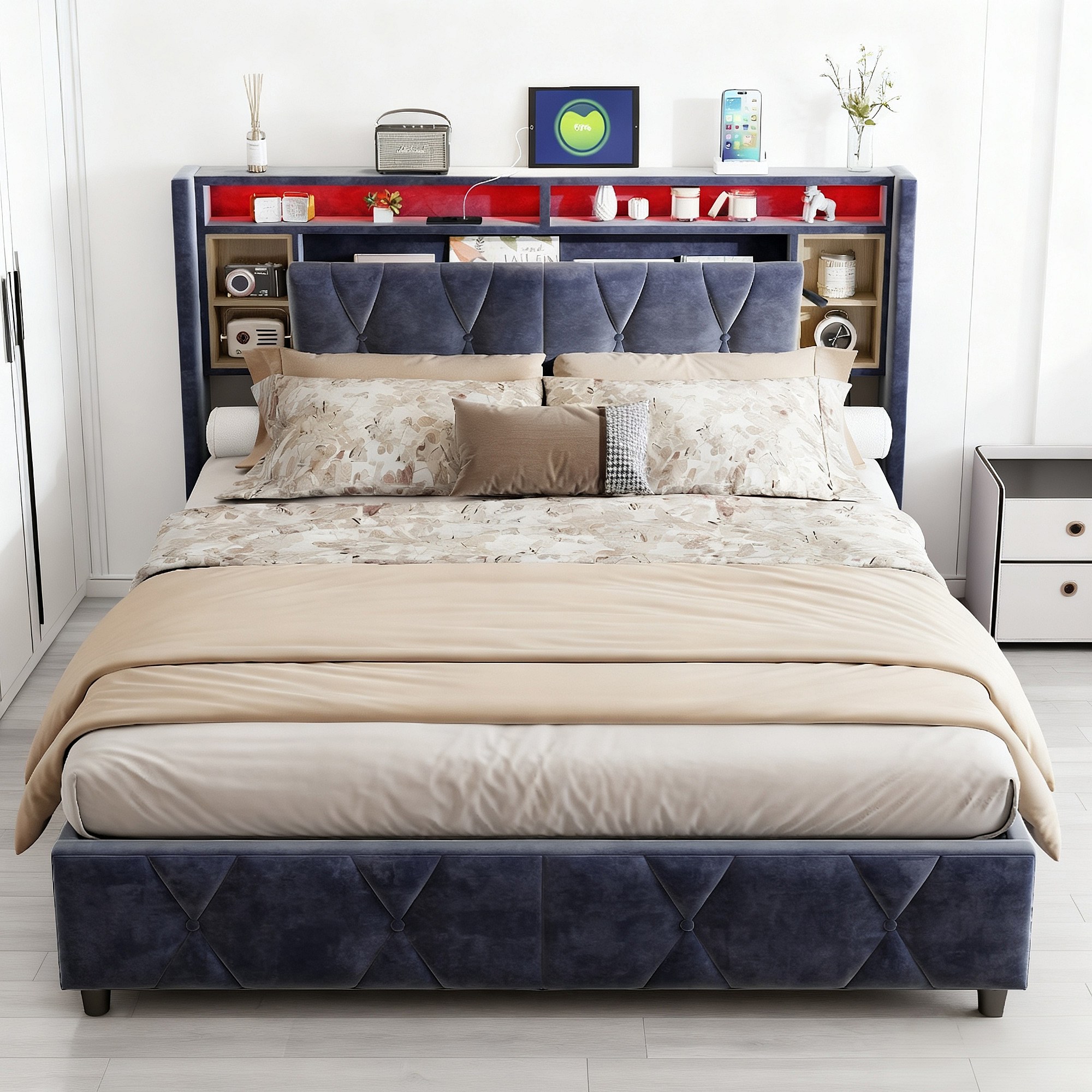 Lit coffre 140x200 cm avec sommier à lattes - lit adulte 140x200 cm avec LED et USB - Lit double 140x200 rangement soldes - tissu en velours - gris